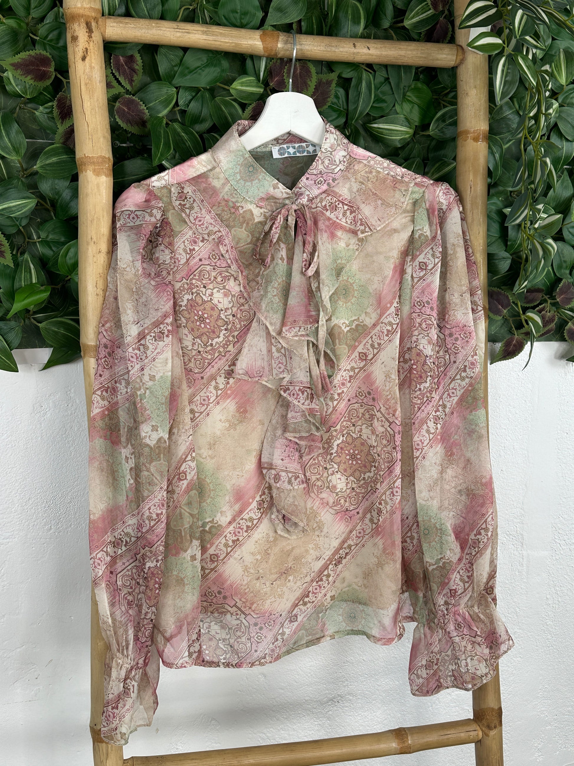 Blusa con tejido tipo gasa estampada con detalles bohemios.