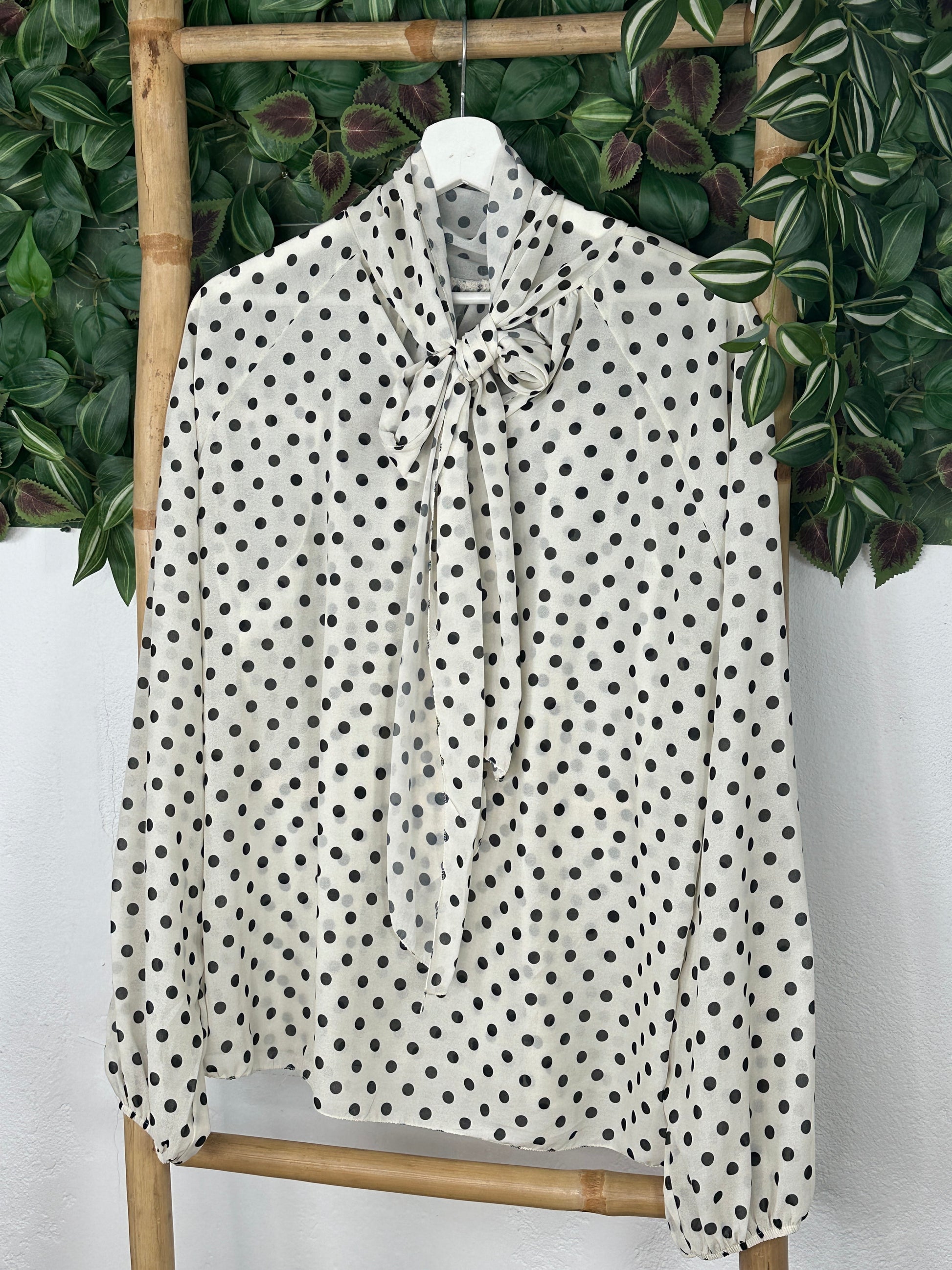 Blusa de tejido tipo gasa con transparencia estampada de lunares.