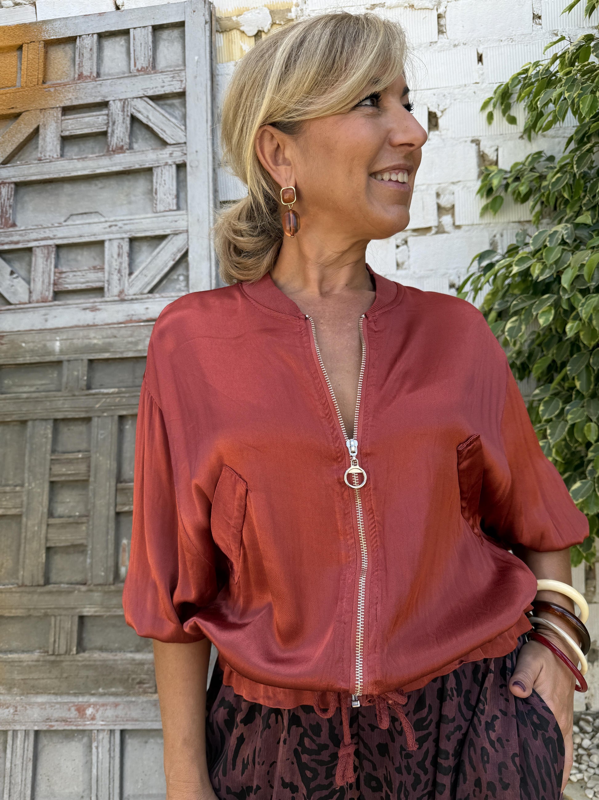 The bottom of the bomber jacket can be gathered with a drawstring in the same print.