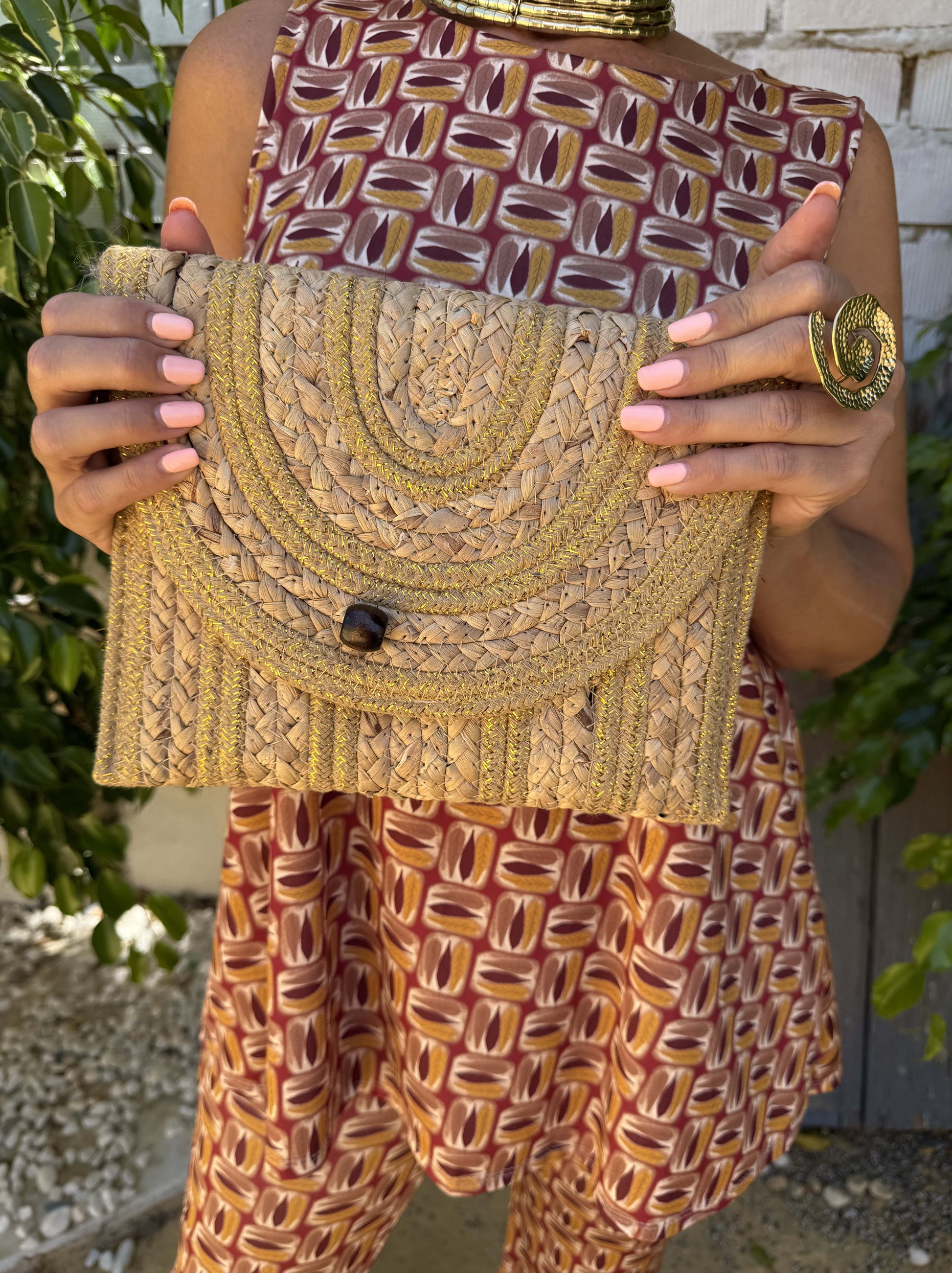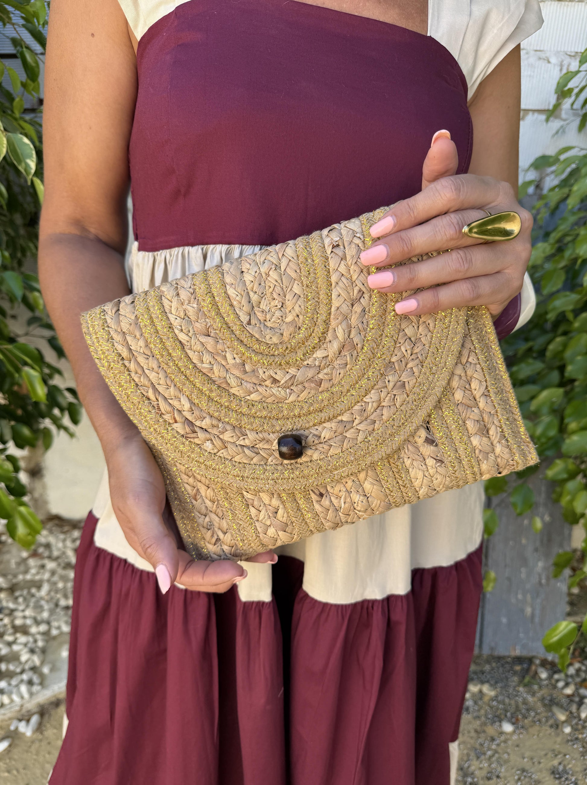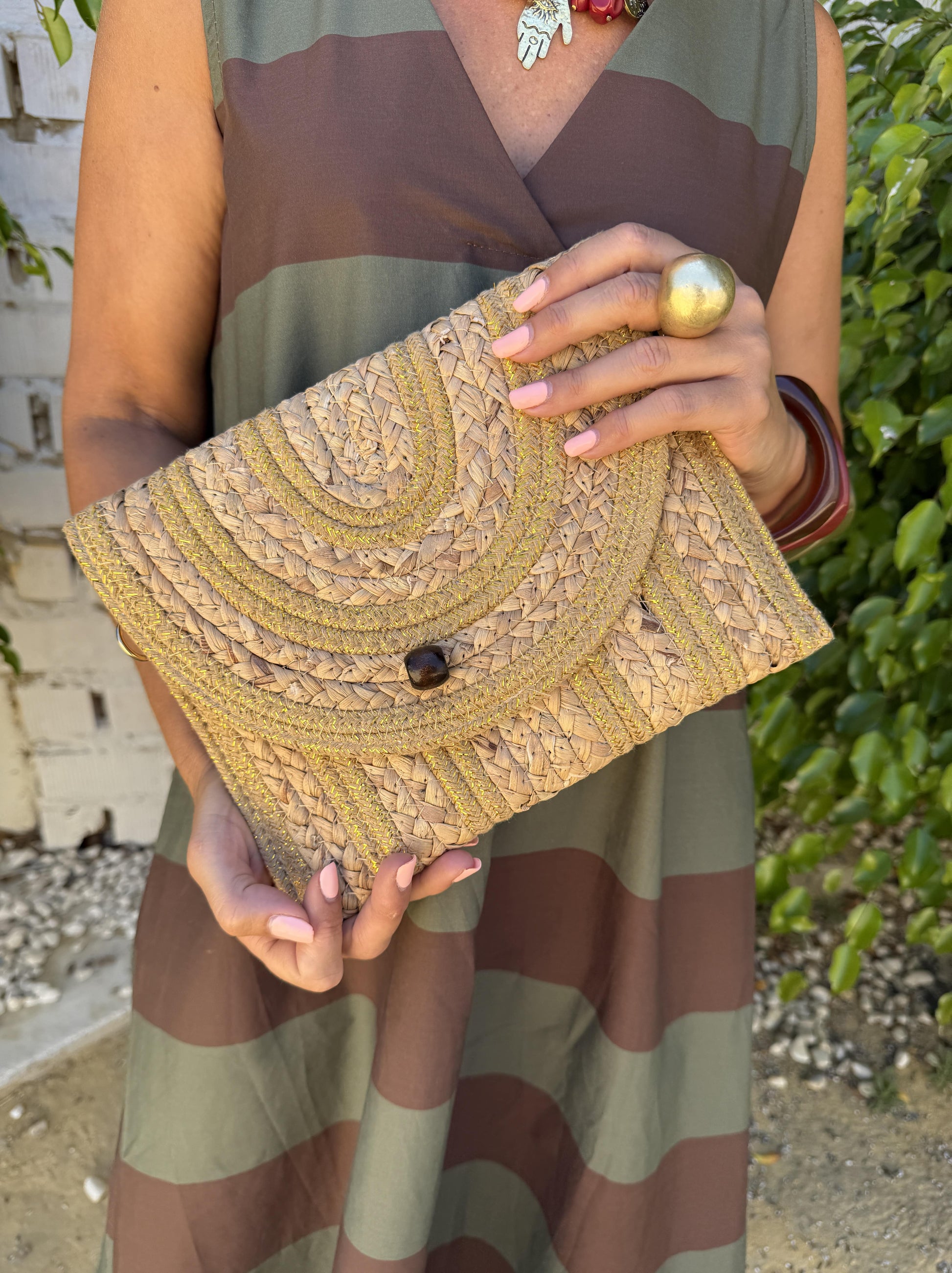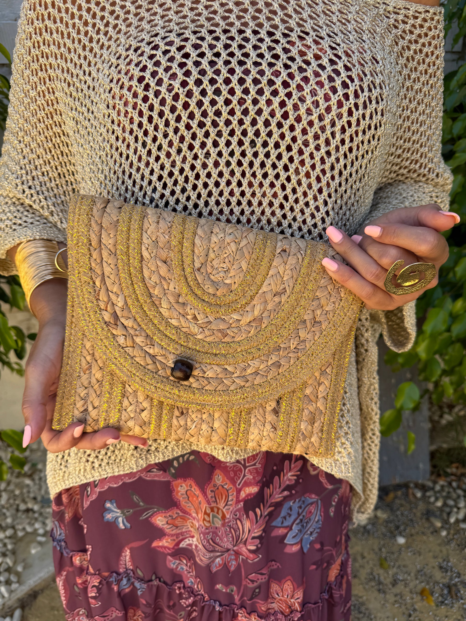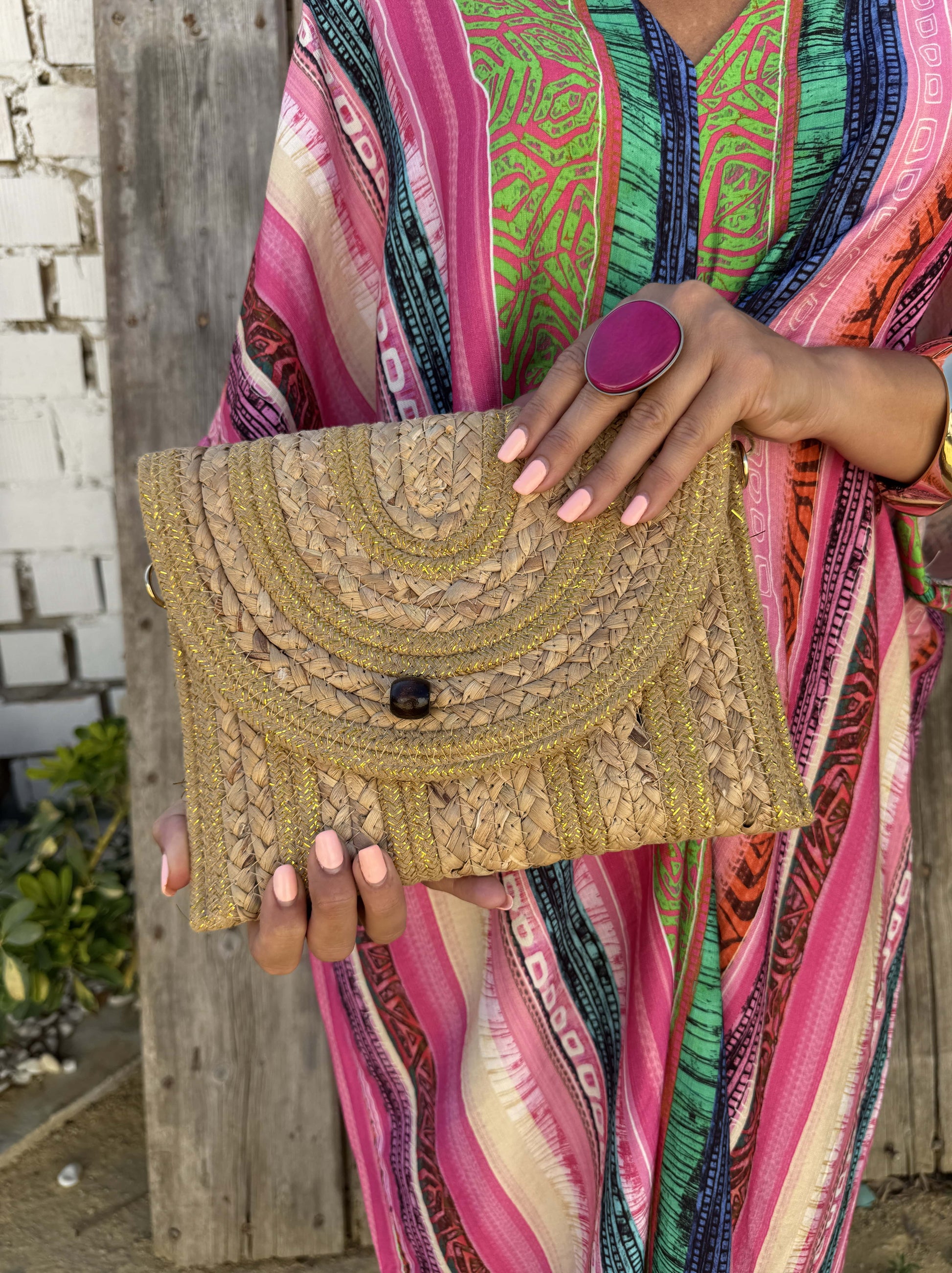 Cartera de mano tipo rafia con cordón dorado con brillo.