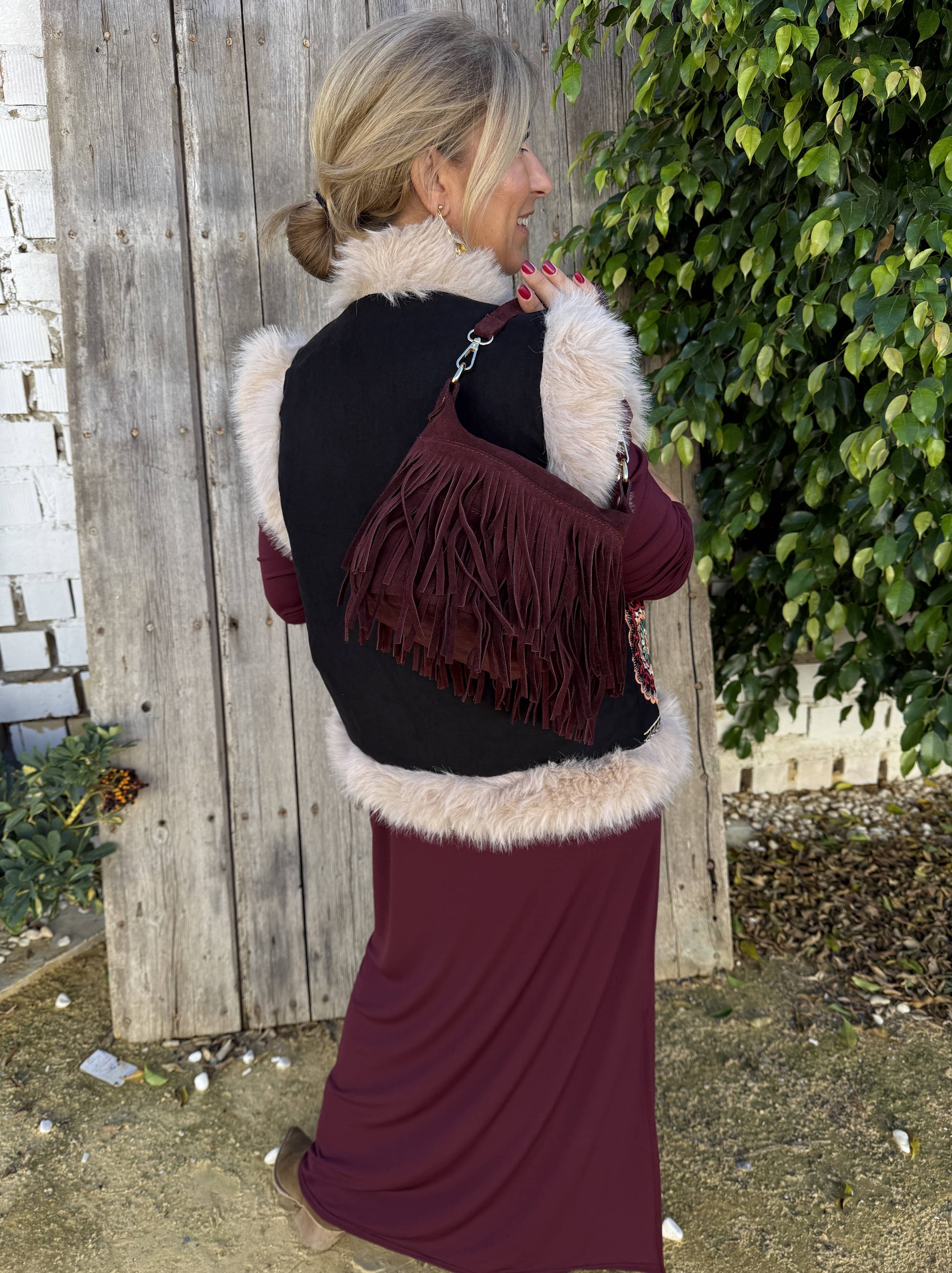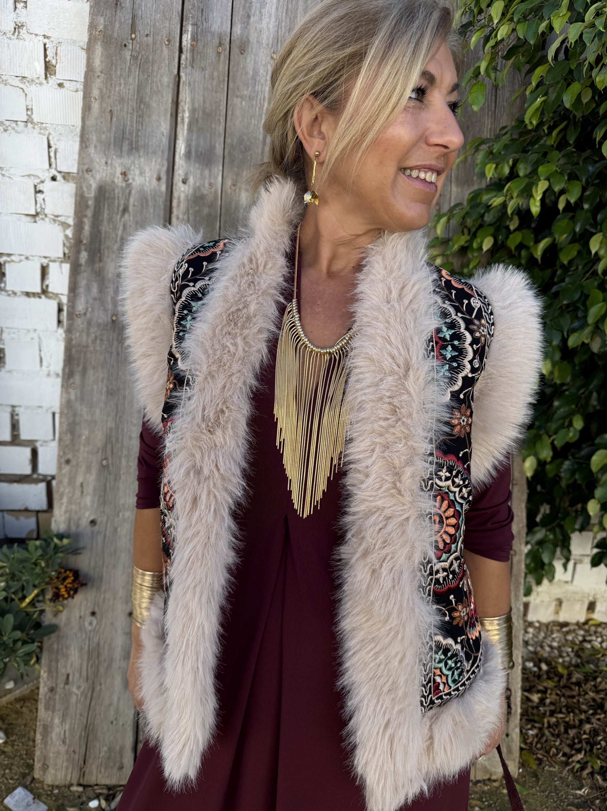Chaleco de mujer negro con pelo beige en los filos y bordado con hilos de colores en forma de flores en la parte delantera.