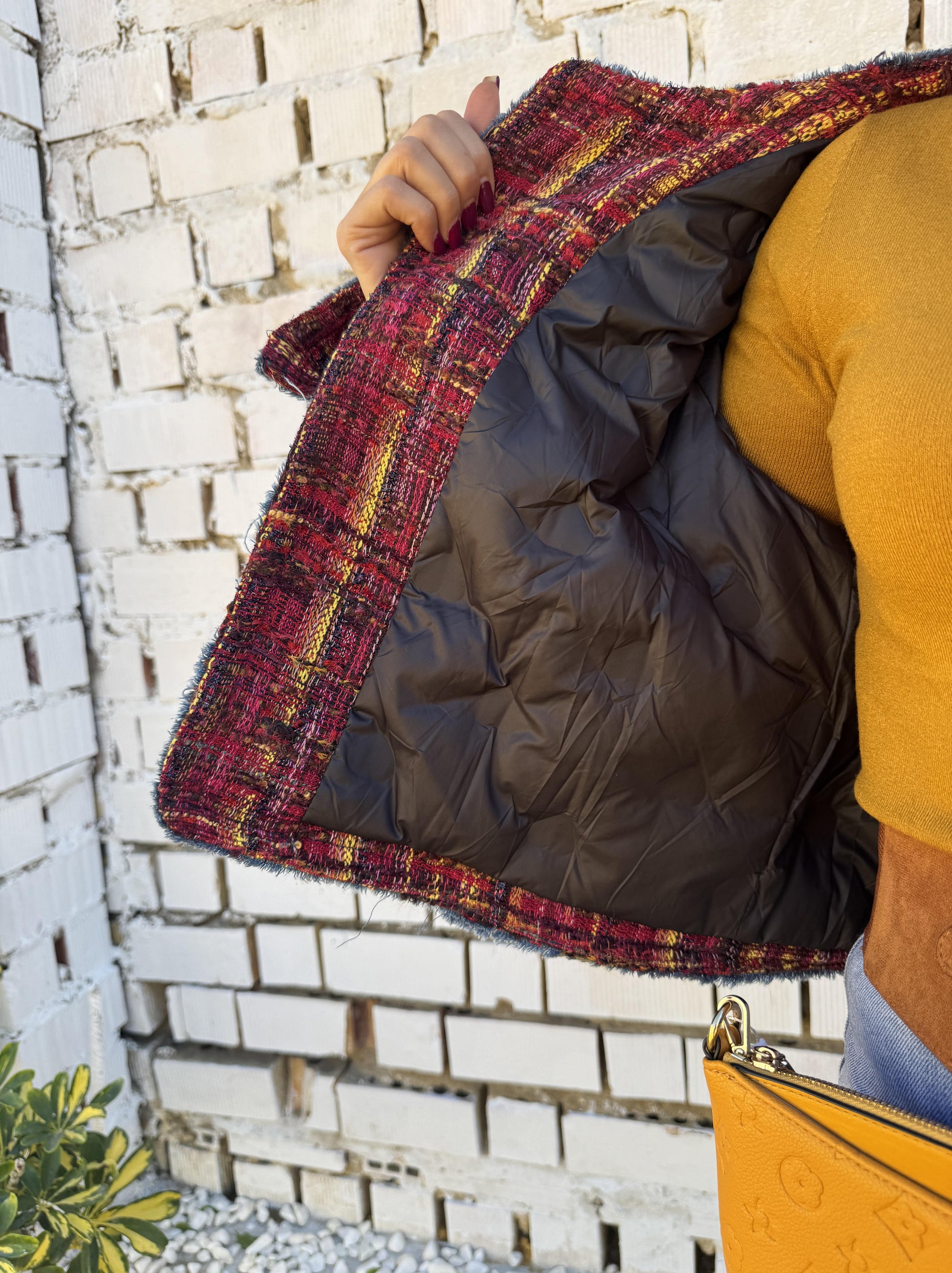 Chaqueta con hilos de colores de color burdeos, amarillo, rojo, rosa, negro, gris, etc.
