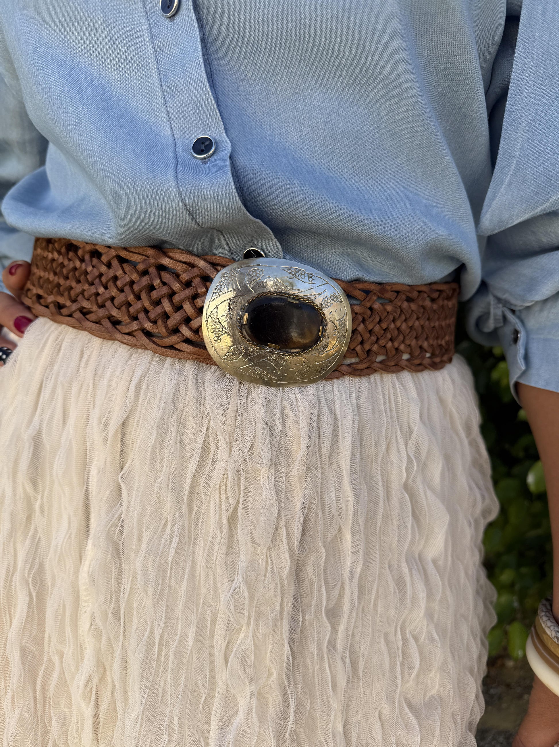 Cinturón de piel tipo western o boho chic con hebilla de piedra en la zona delantera.