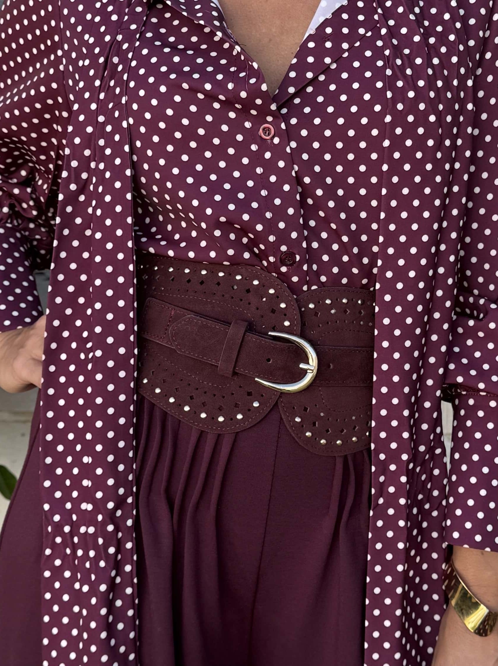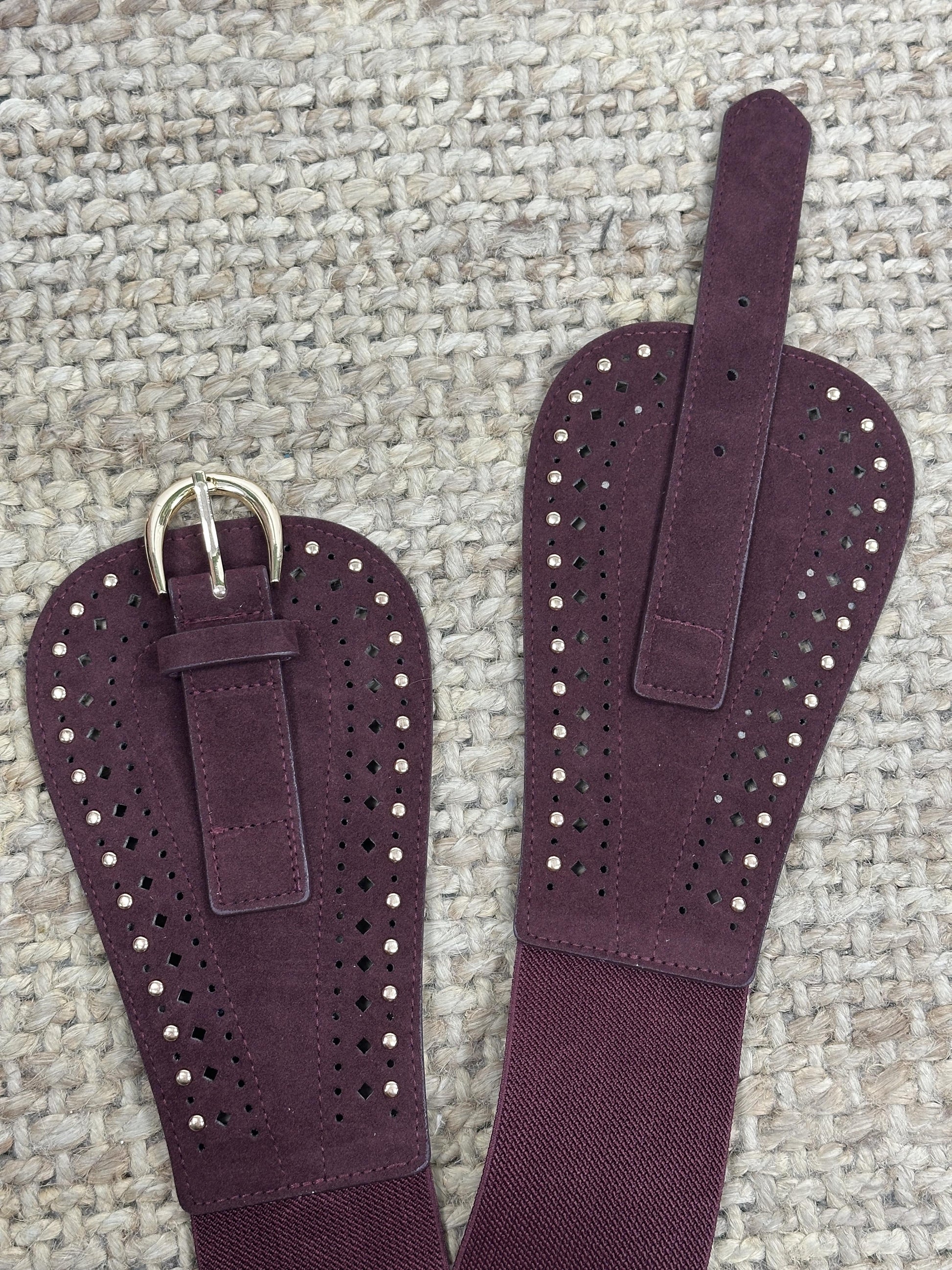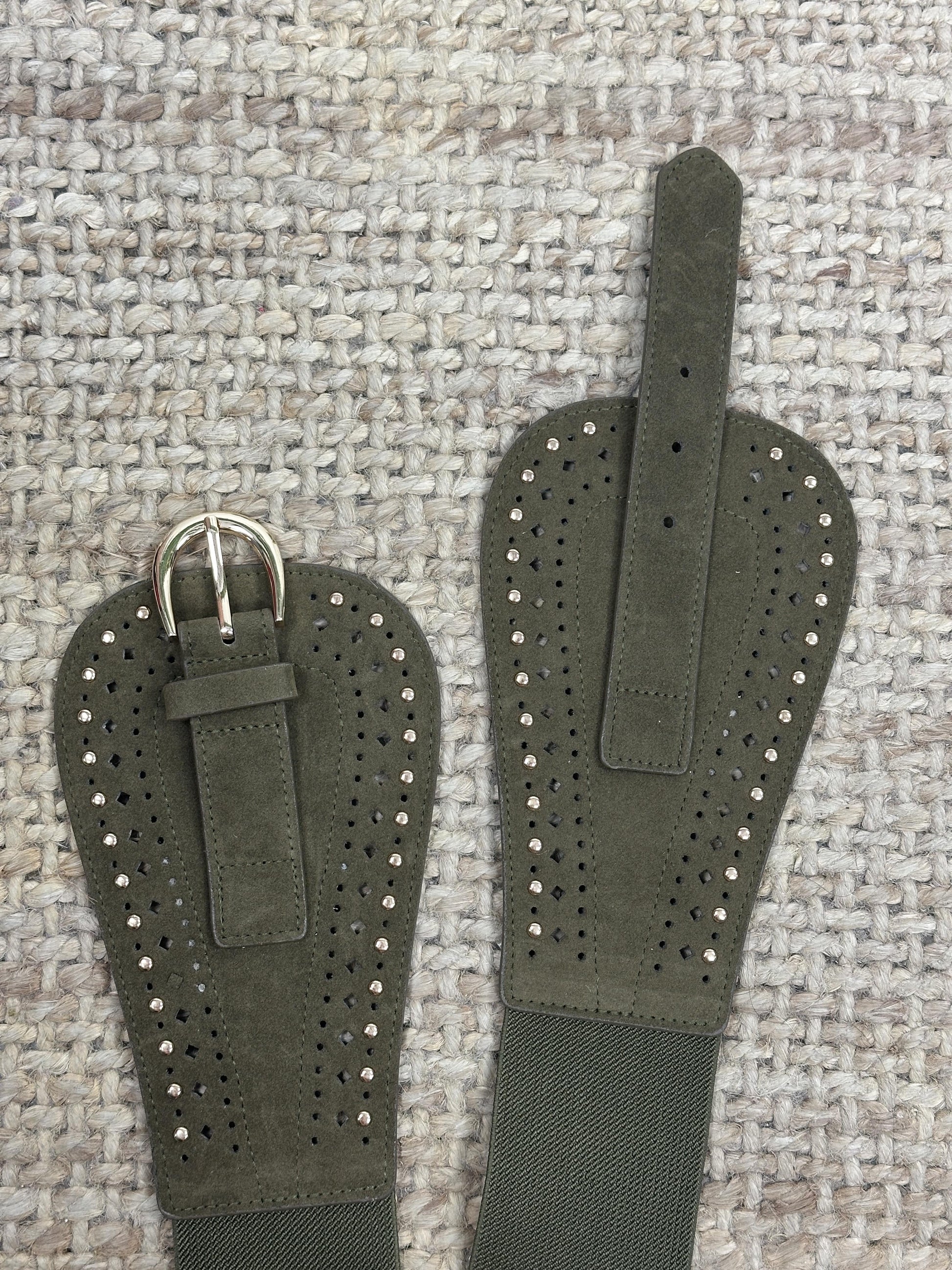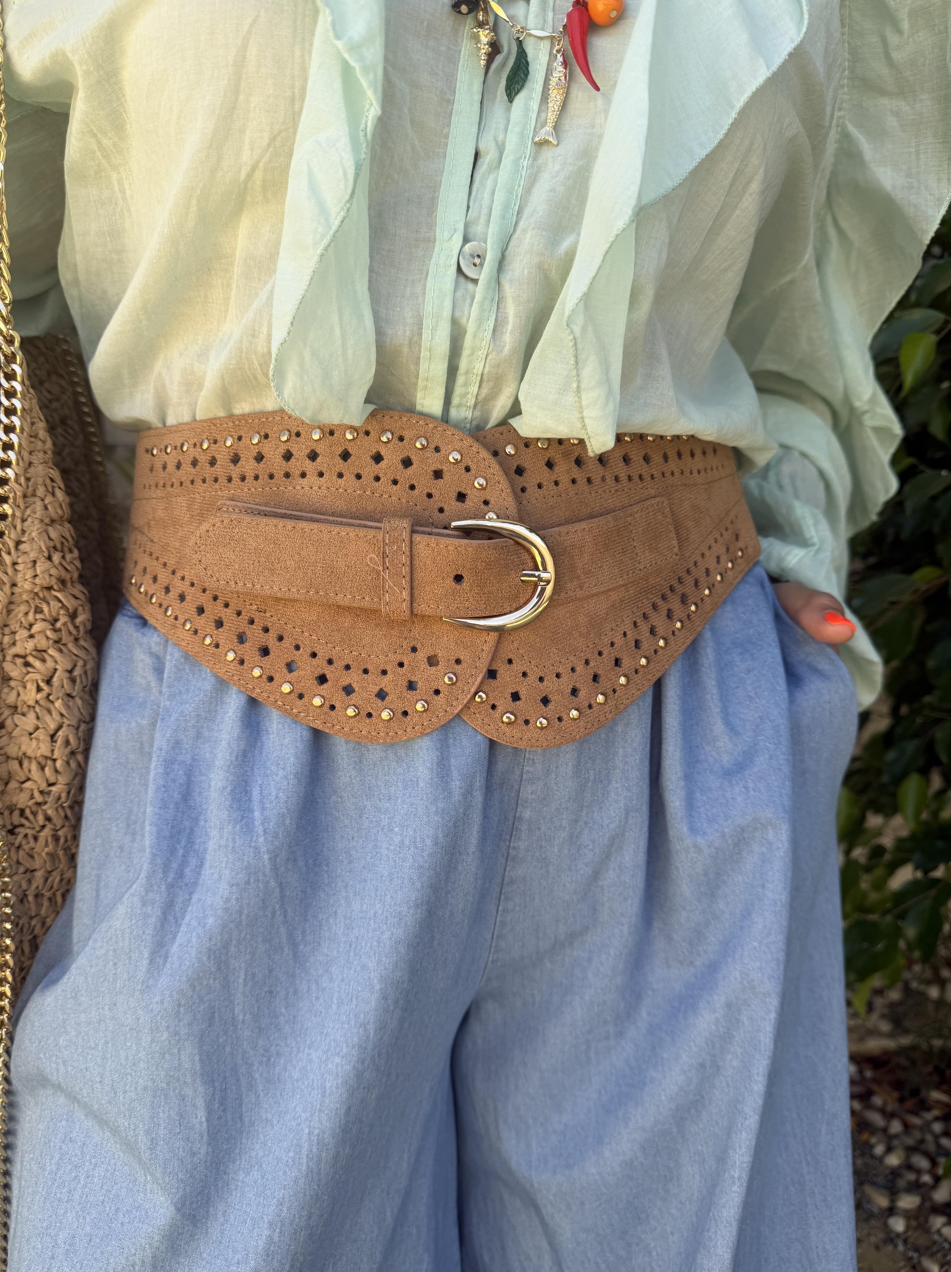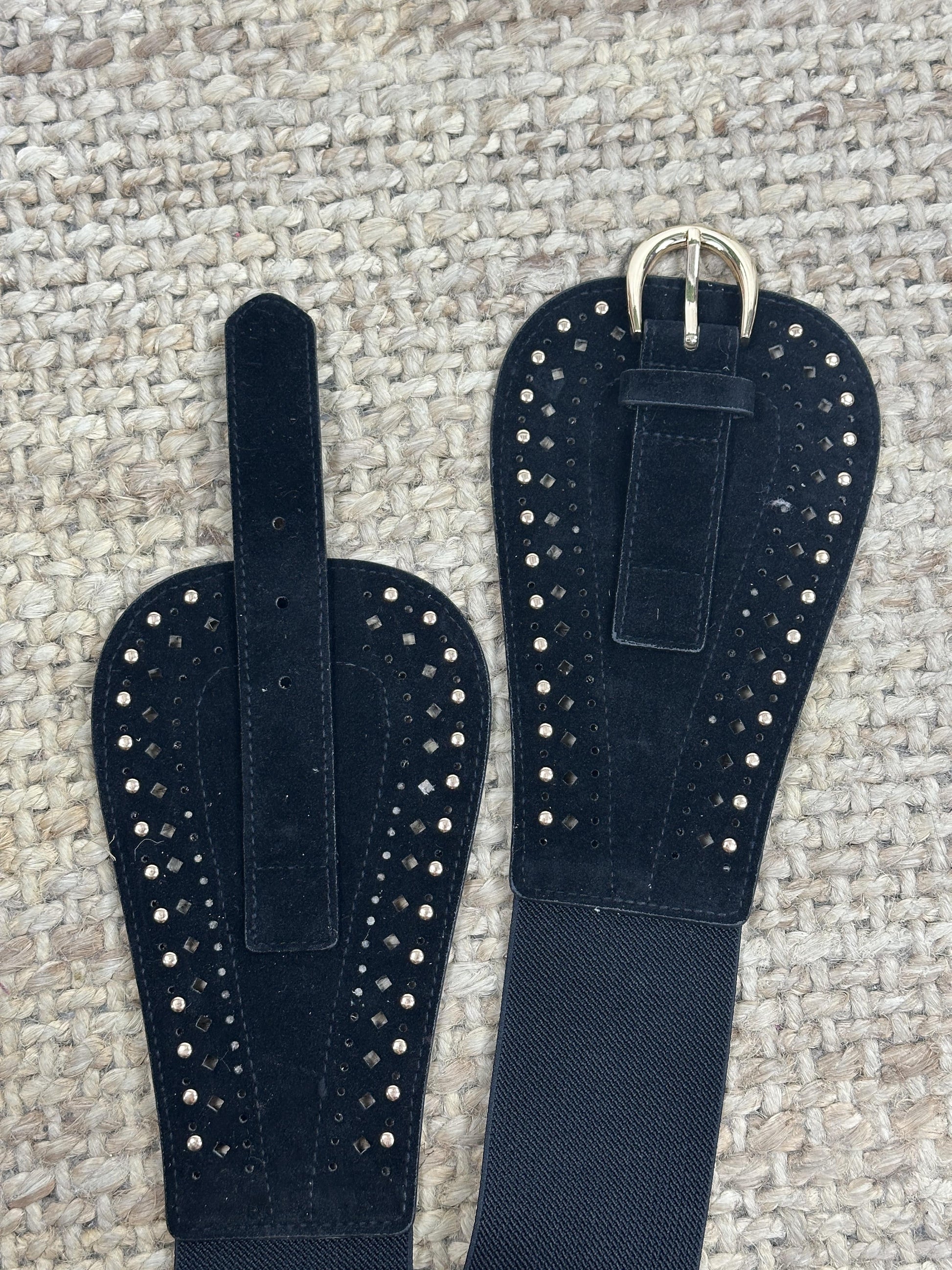 Cinturón estilo western con brocados en la zona delantera y tachuelas doradas.