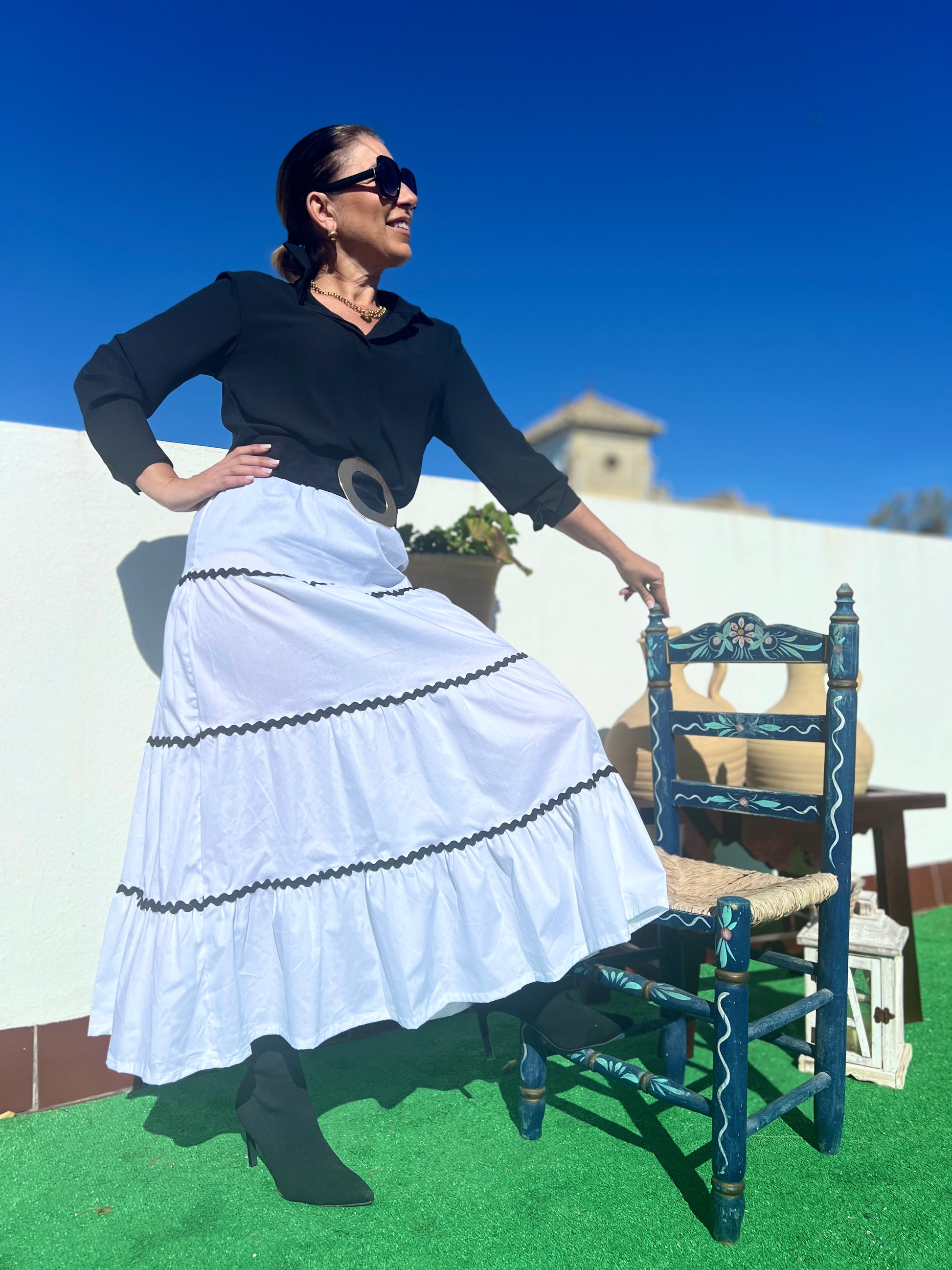 Long white women's skirt with elastic waistband and black zig zag.