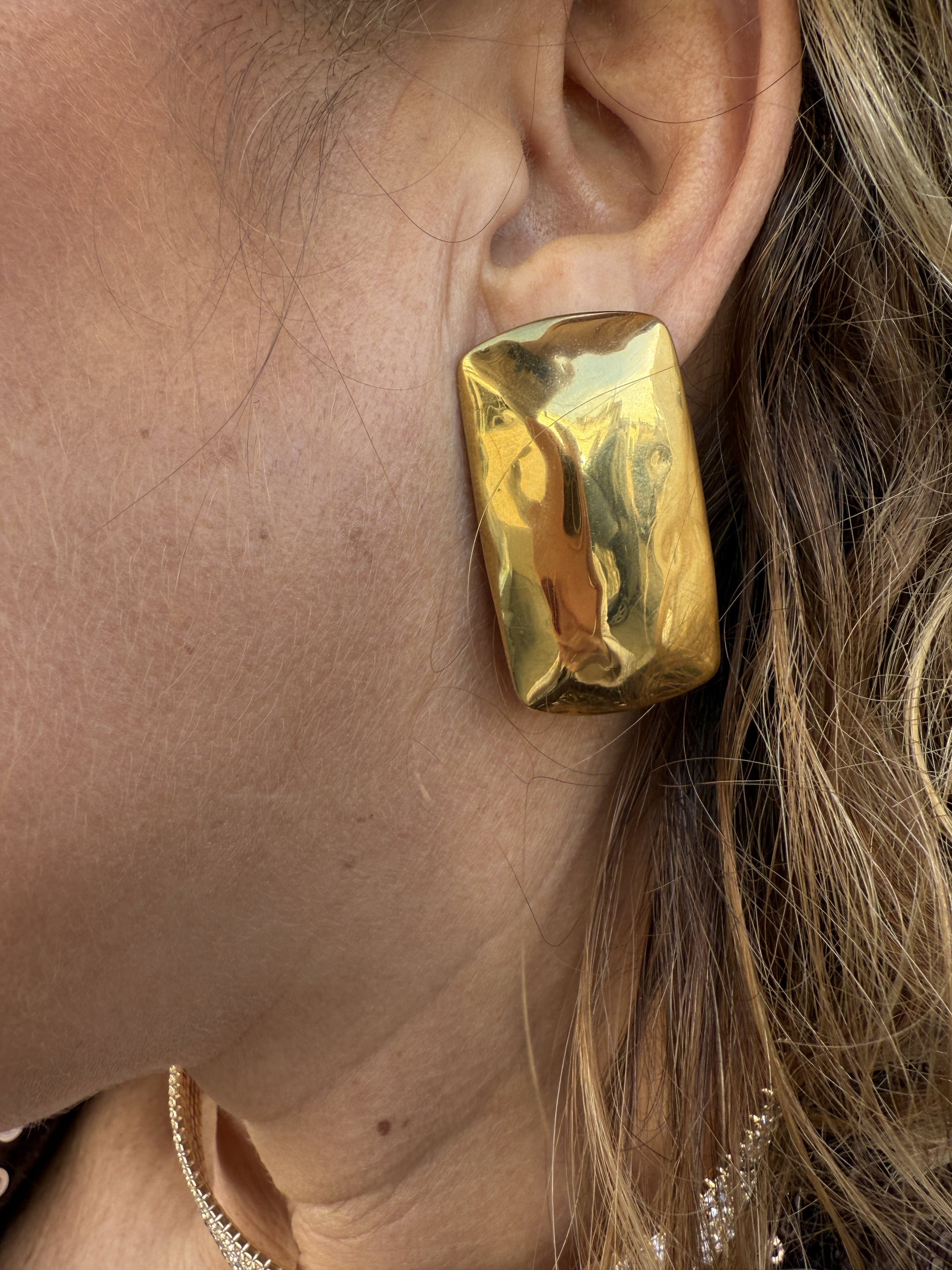 Pendiente de acero en forma rectangular pegado a la oreja en color dorado.