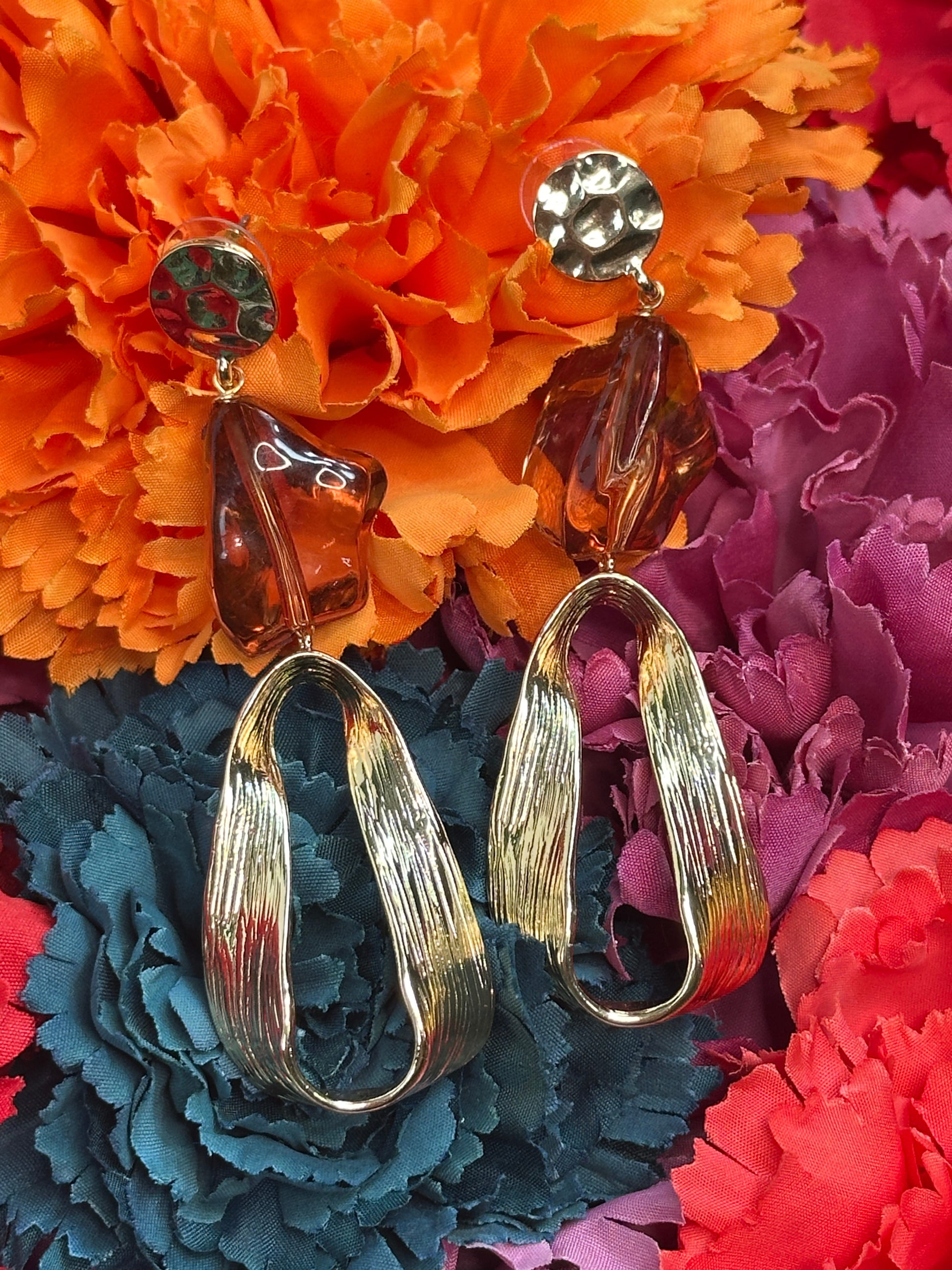 Pendiente largo con acabado metalizado en color dorado.