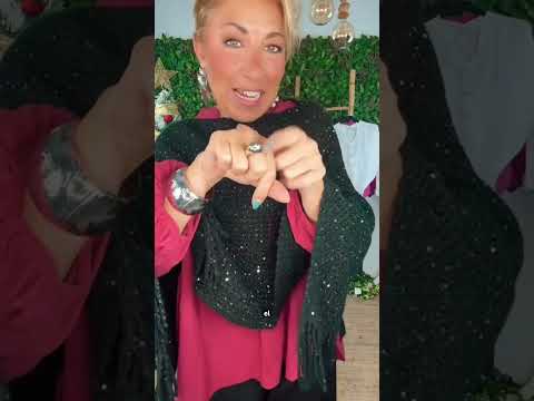 Poncho de punto con lentejuelas plateadas y flecos en el bajo.