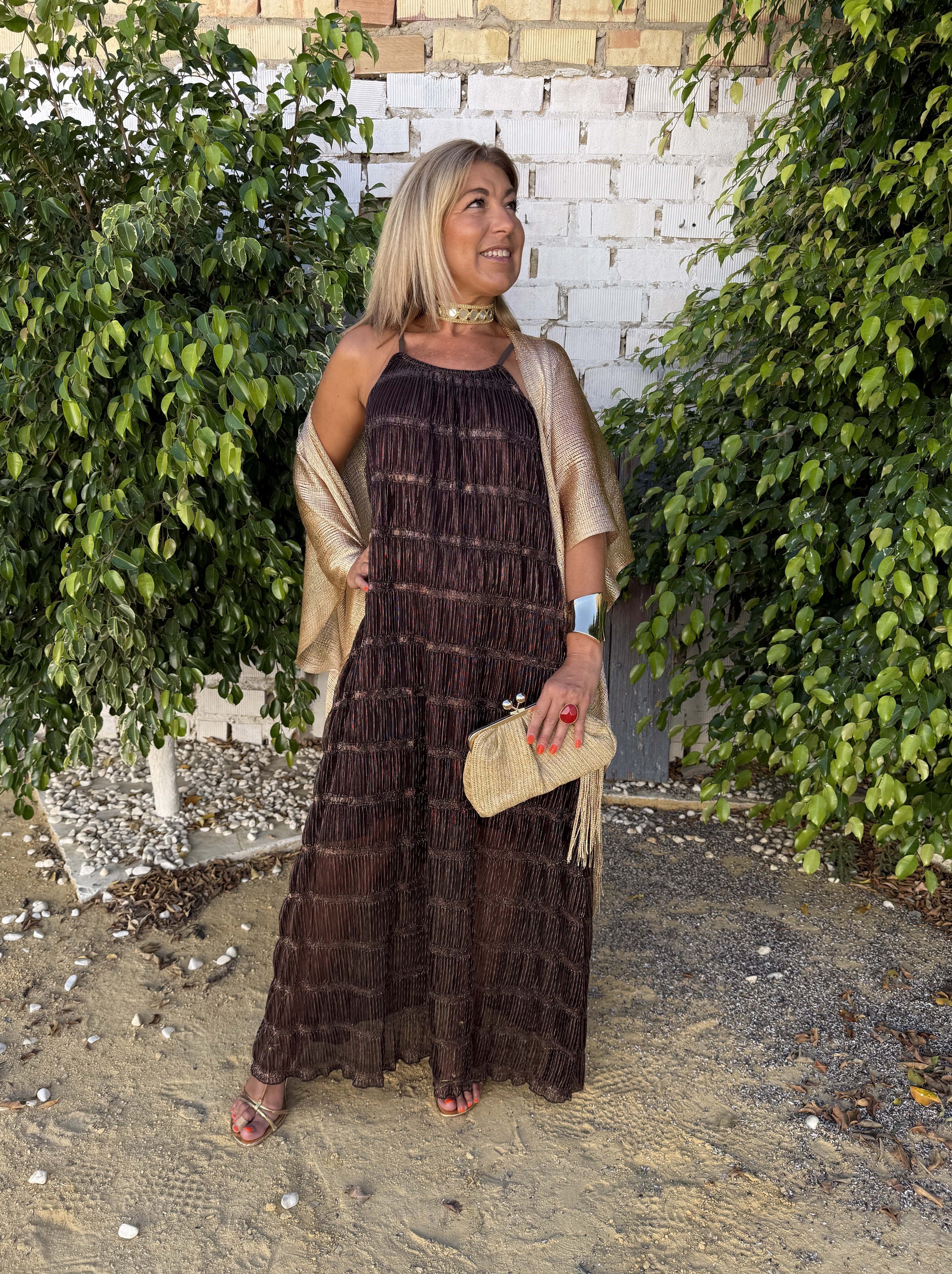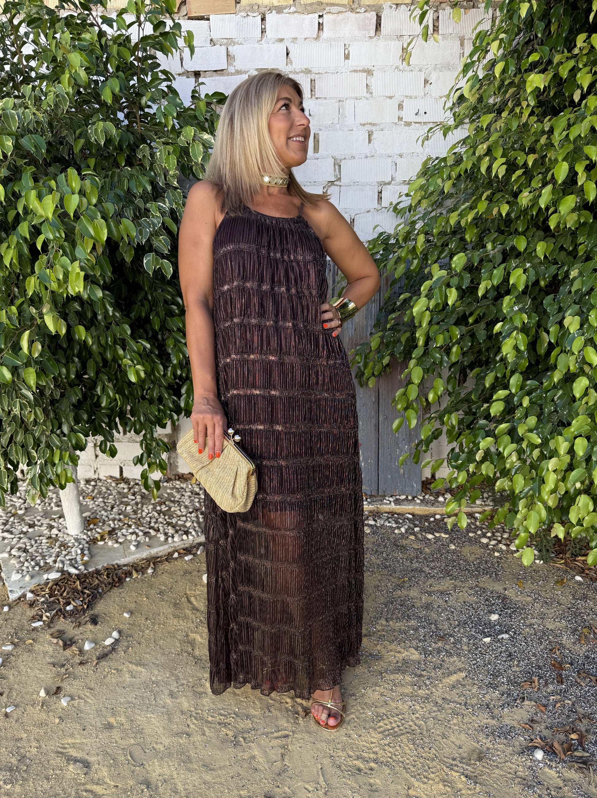 Vestido plisado de brillo con forro en el interior.