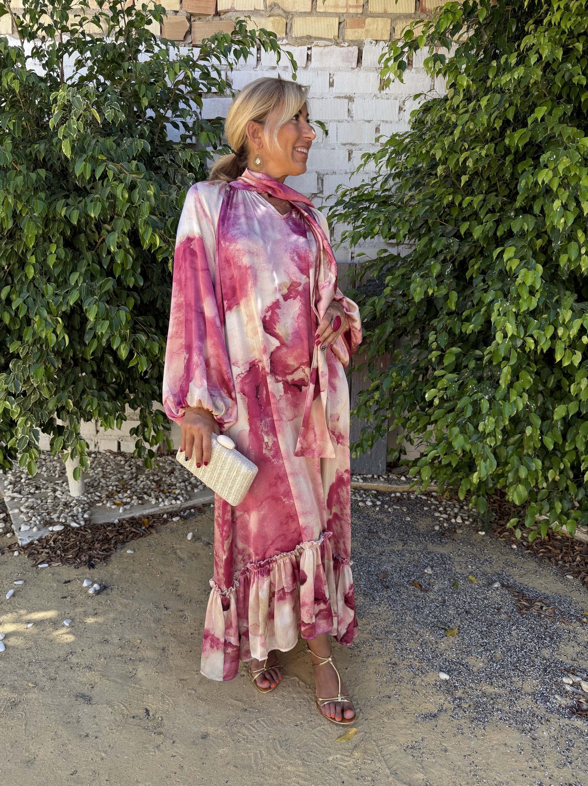 Vestido de mujer largo estampado con lazo anudado al cuello y volante en la parte inferior.