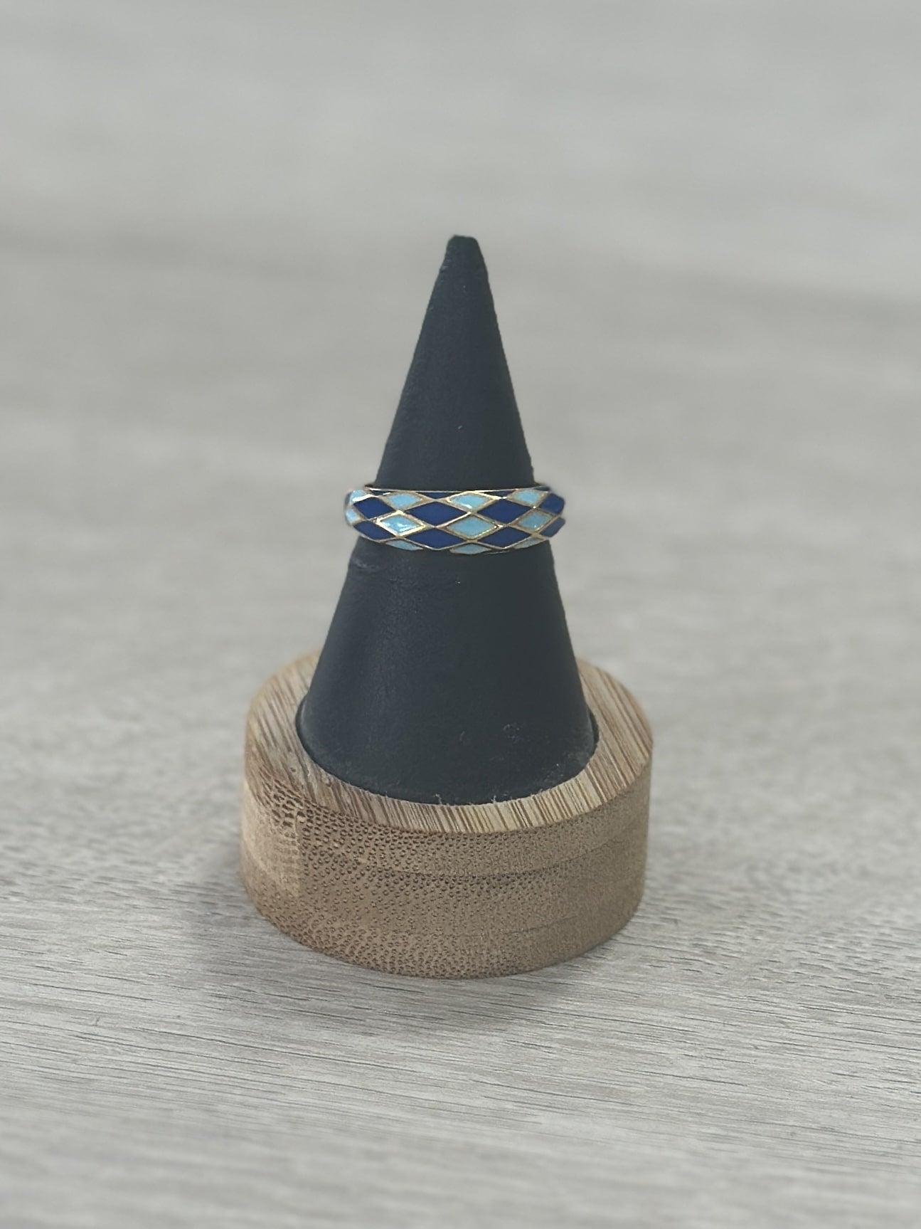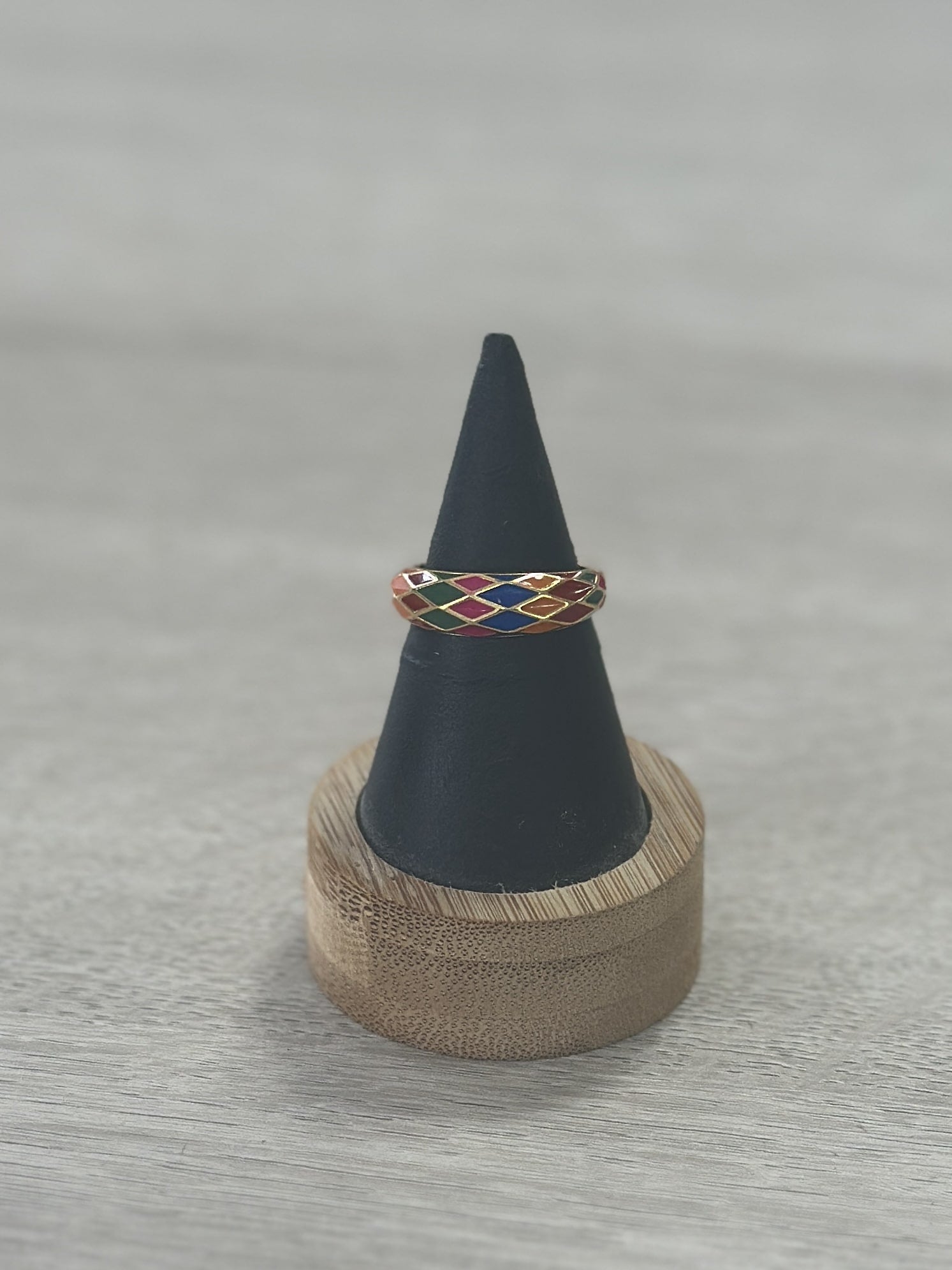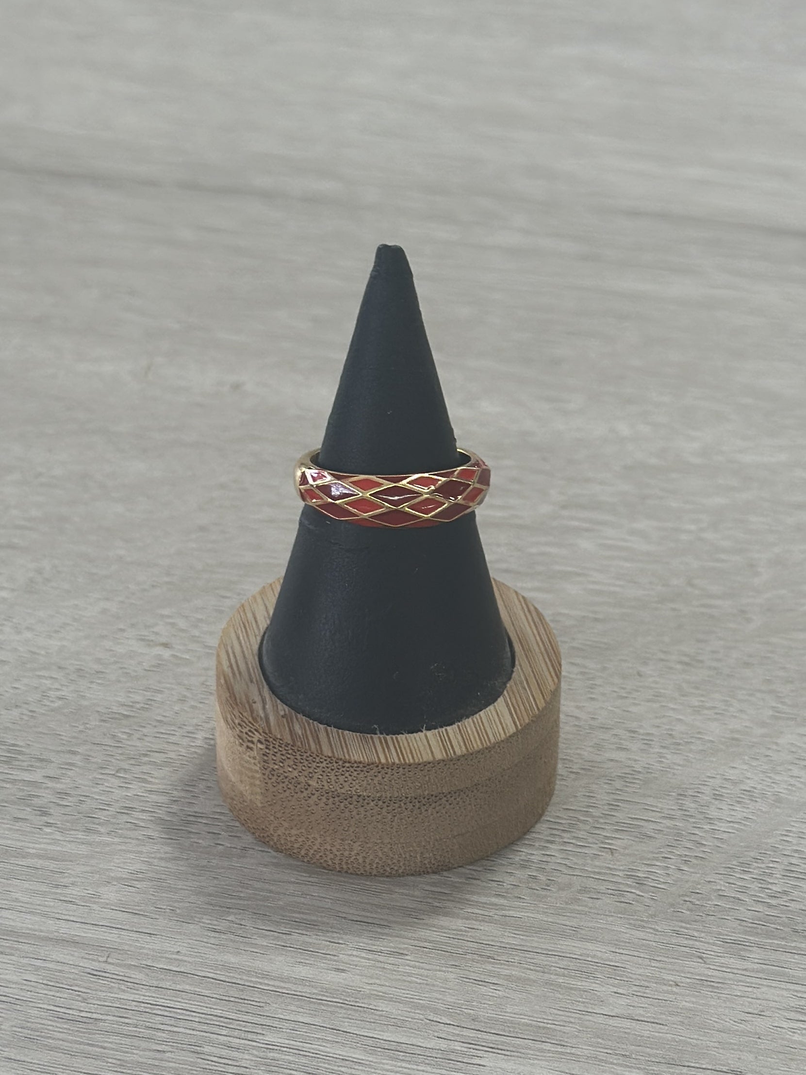 Anillo esmaltado disponible con fondo dorado y esmaltado en forma de rombos.