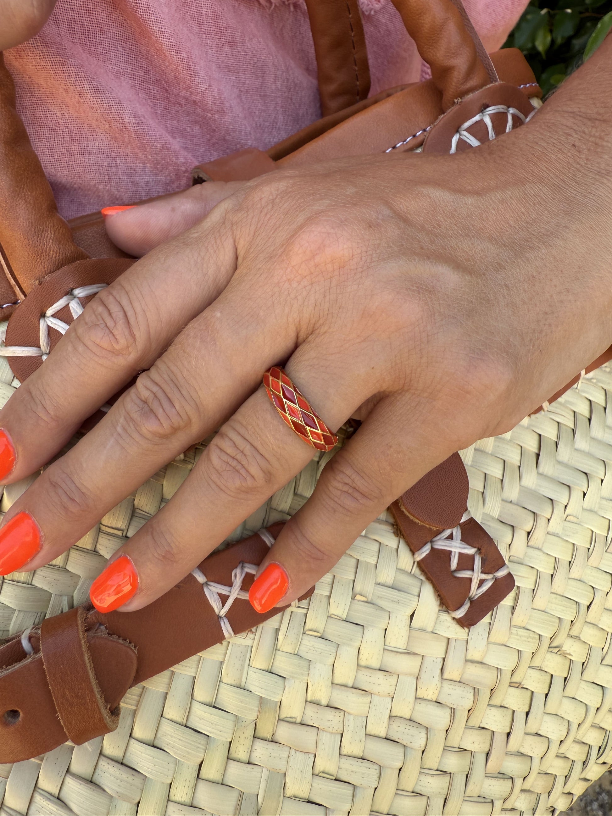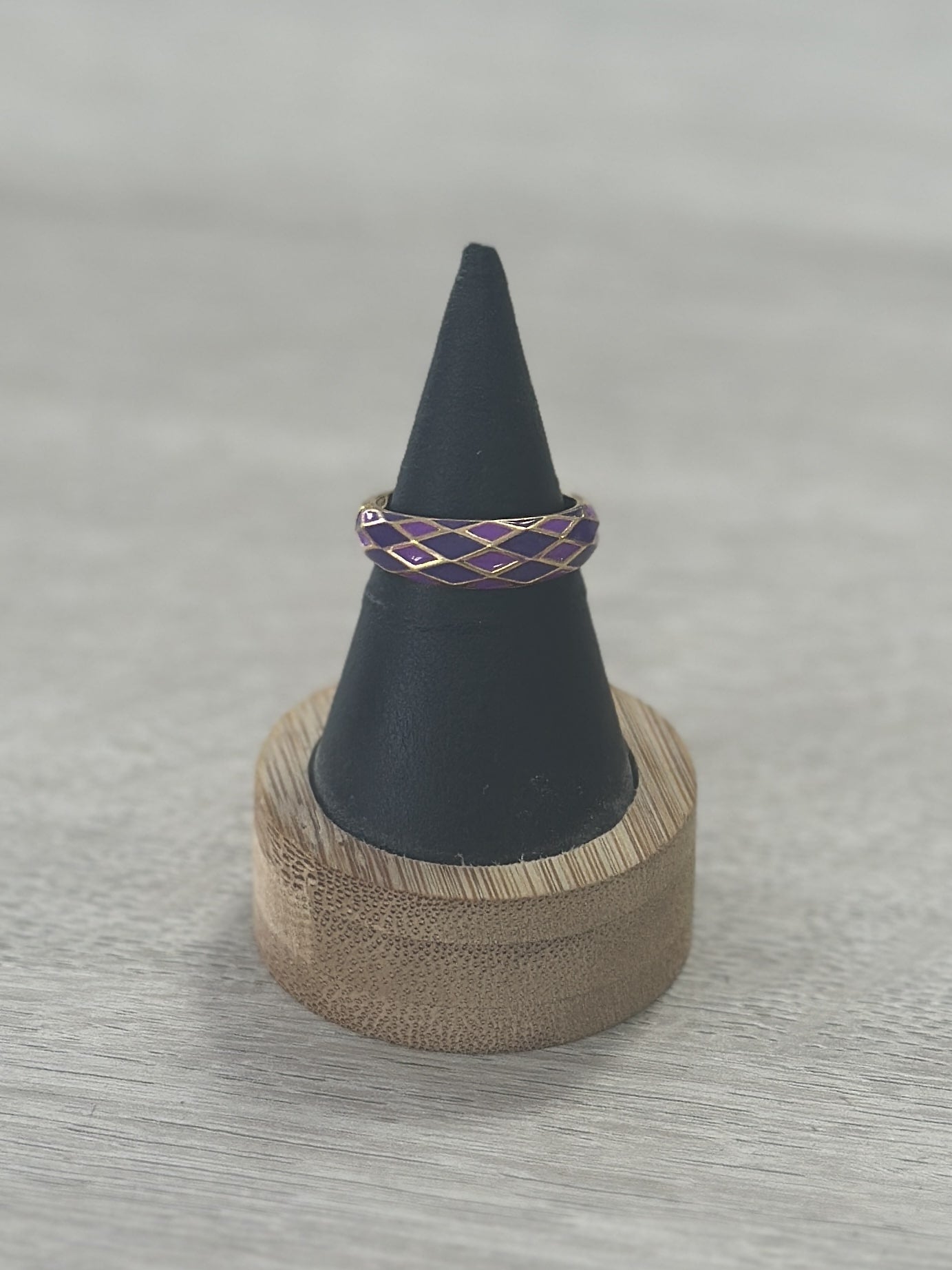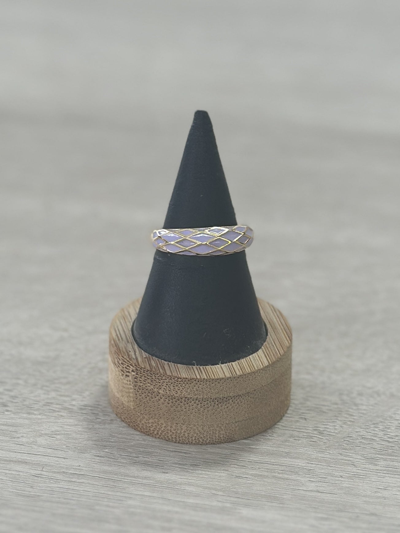Anillo esmaltado disponible con fondo dorado y esmaltado en forma de rombos.