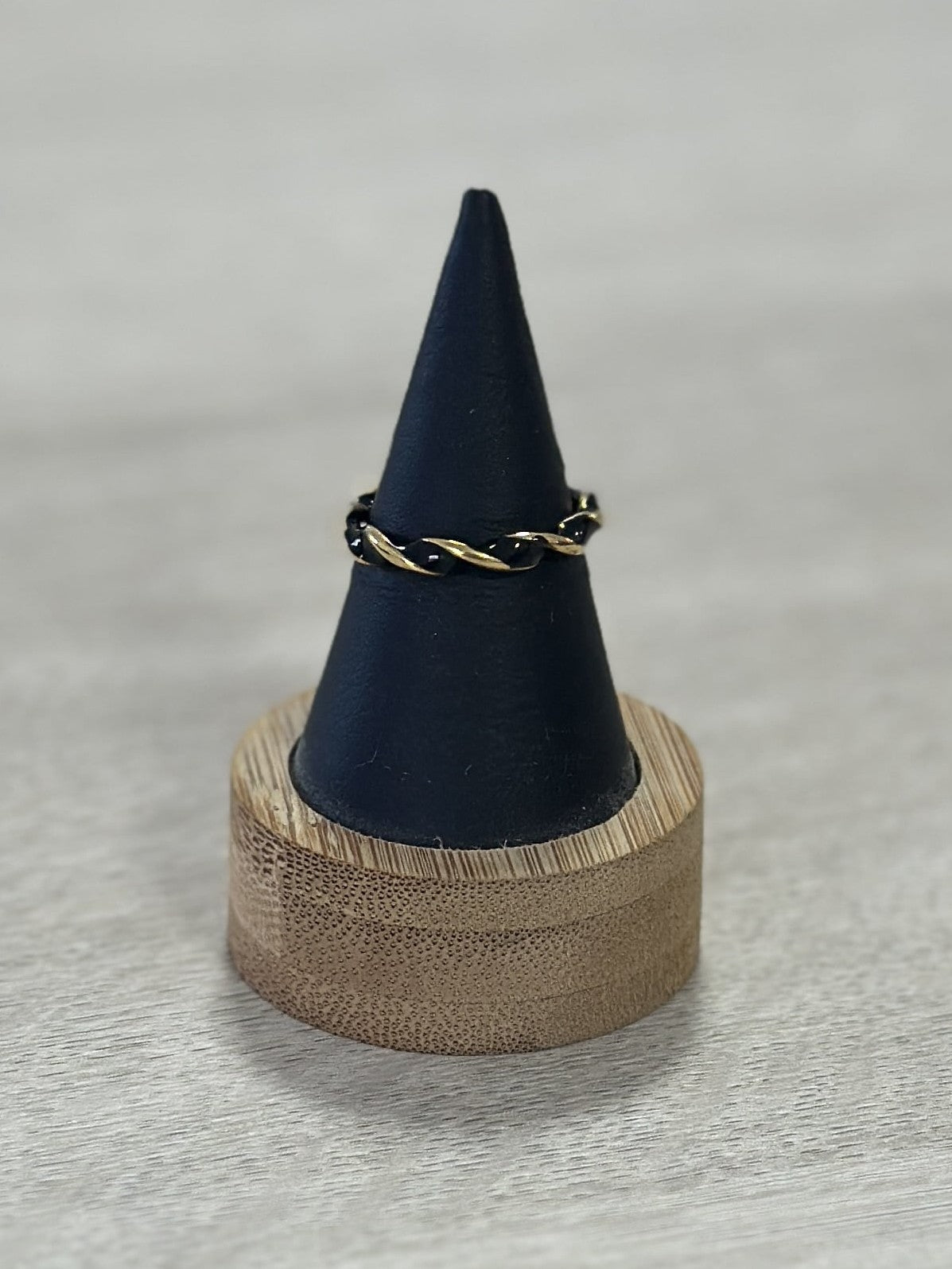 Este anillo es trenzado mitad dorado y mitad esmaltado.