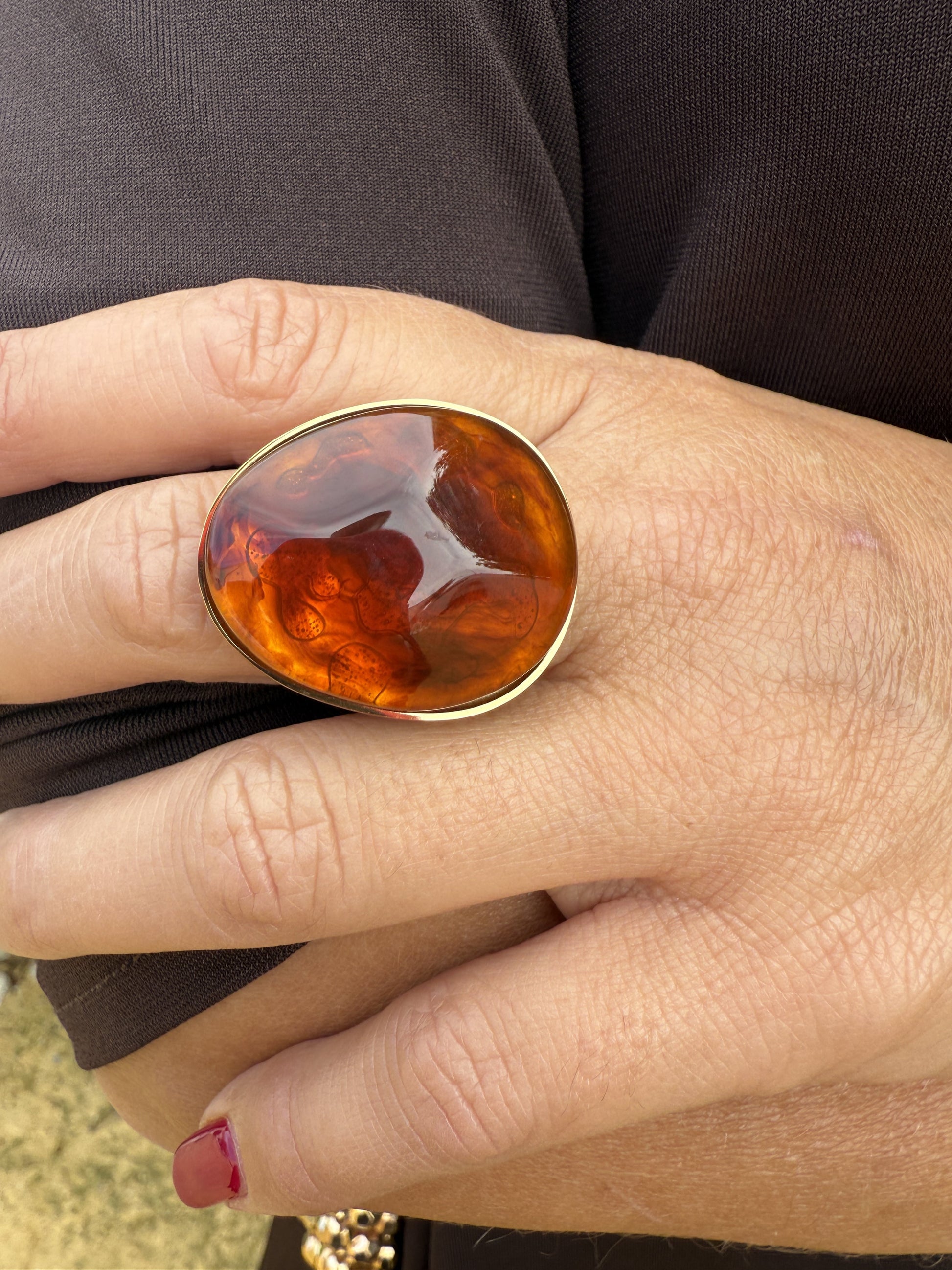 Anillo dorado con piedra artificial de forma ovalada.
