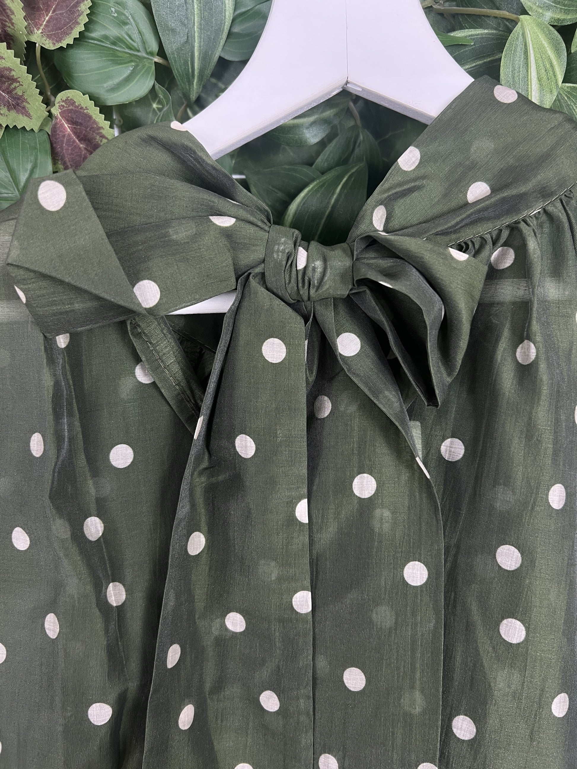 Cuello vuelto fruncido con lazada en la espalda y escote en forma de pico.
