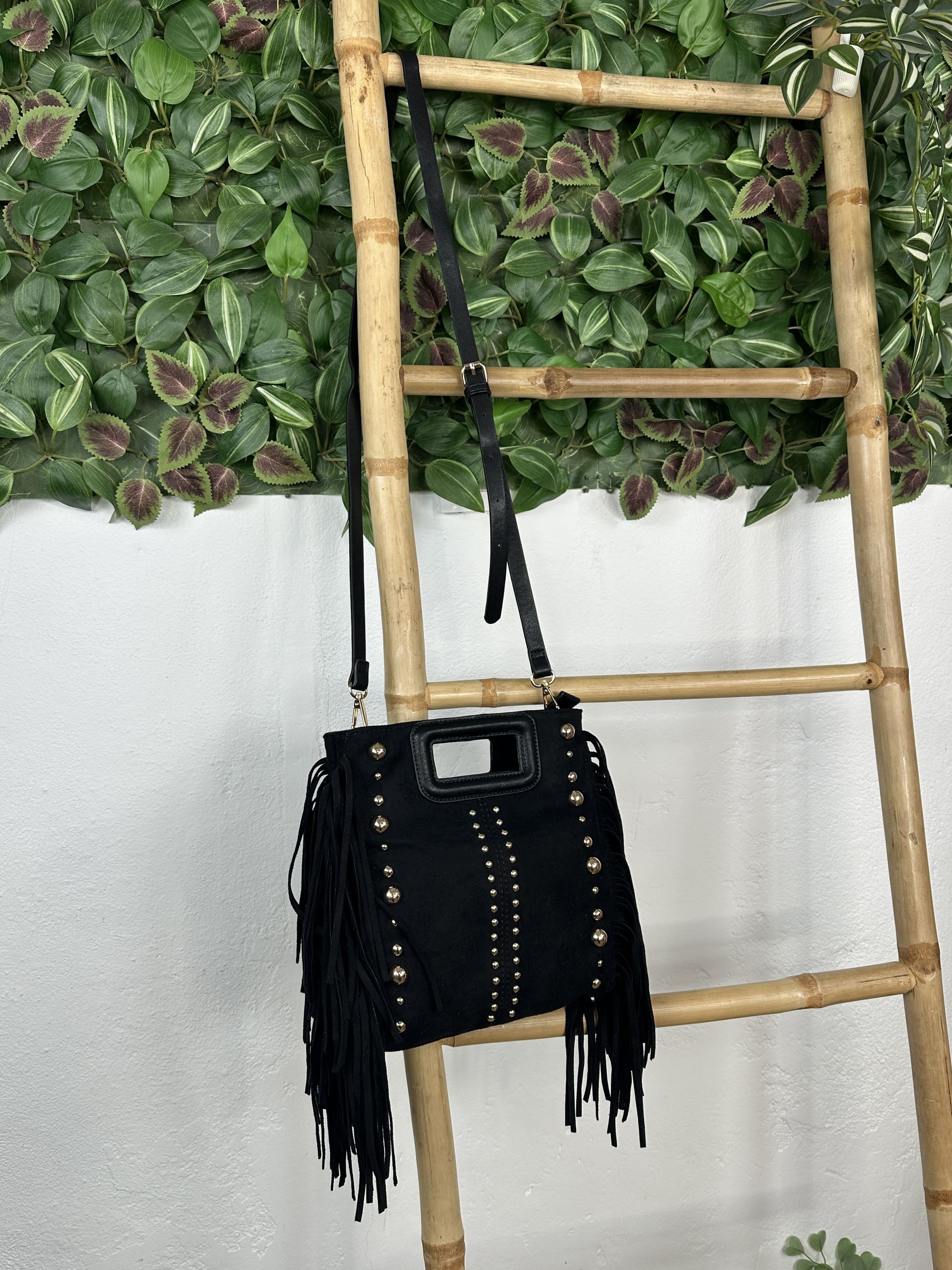 Bolso fabricado con tacto de antelina con flecos a los lados.