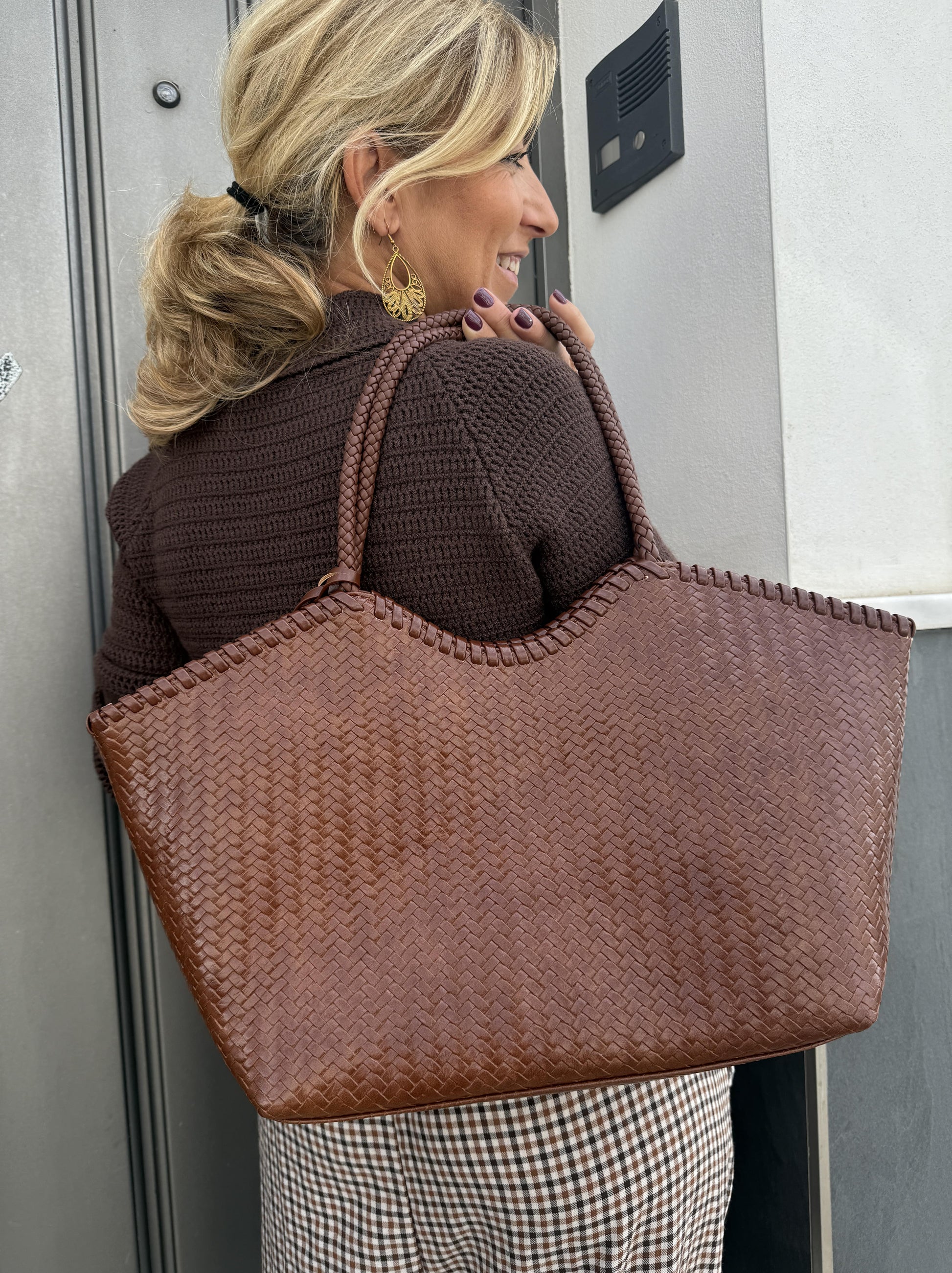 Bolso de mujer amplio con asa y complemento colgando.