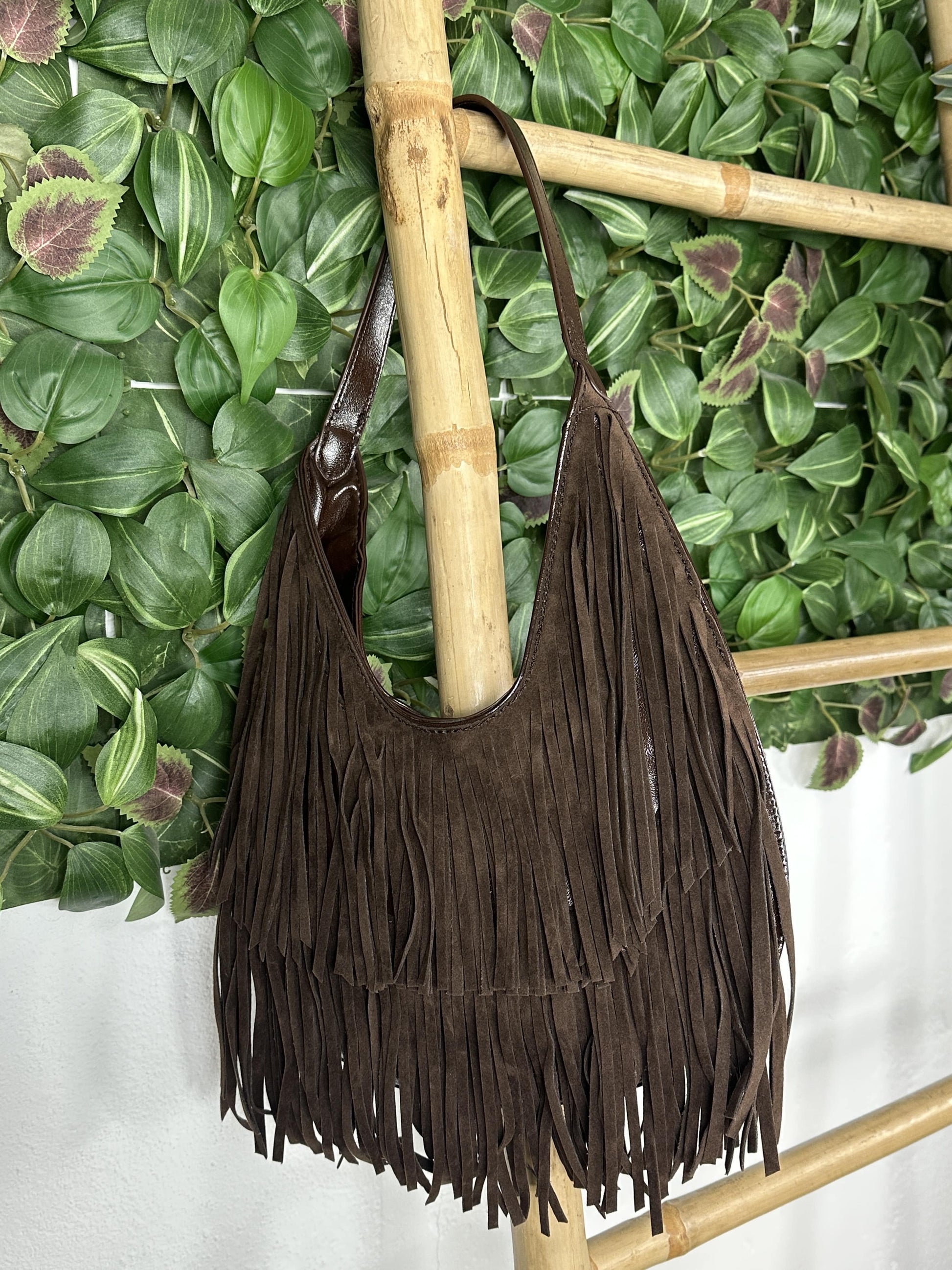 Bolso tipo hobo con flecos en la zona delantera y efecto charol en la zona trasera.