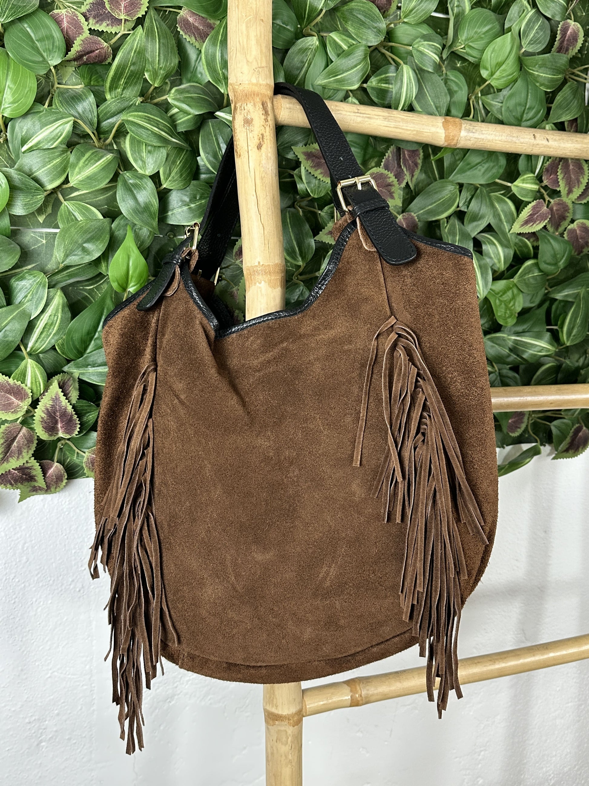 Bolso de piel de antelina con flecos verticales en la zona delantera.