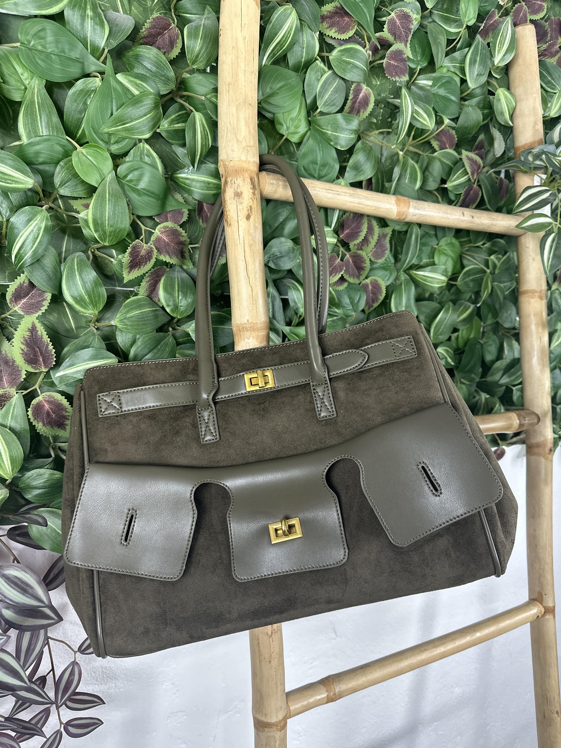 Bolso tipo antelina con cierres de decoración en color dorado con acabado envejecido.