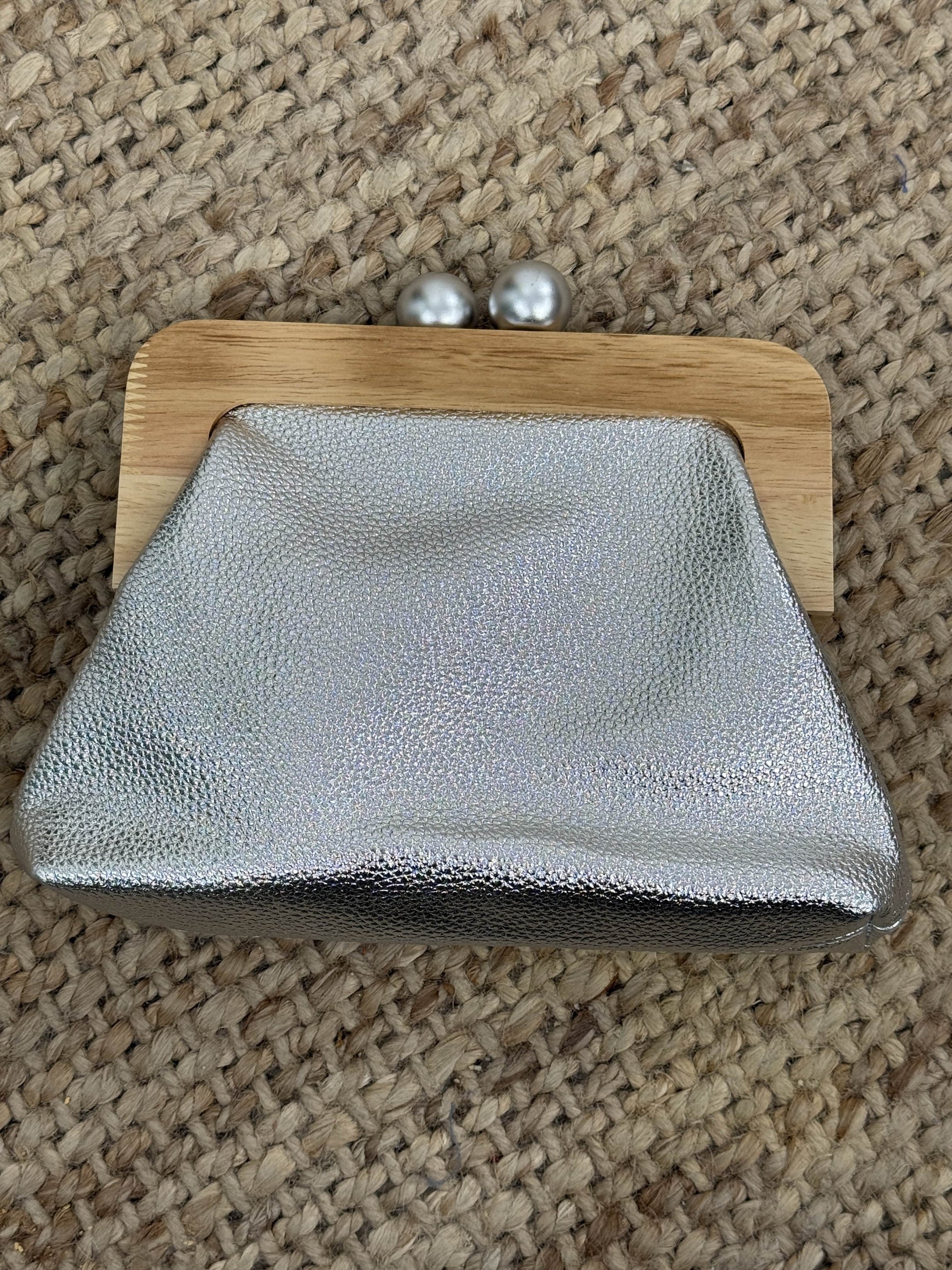 Bolso metalizado de fiesta con relieve y cierre de madera.