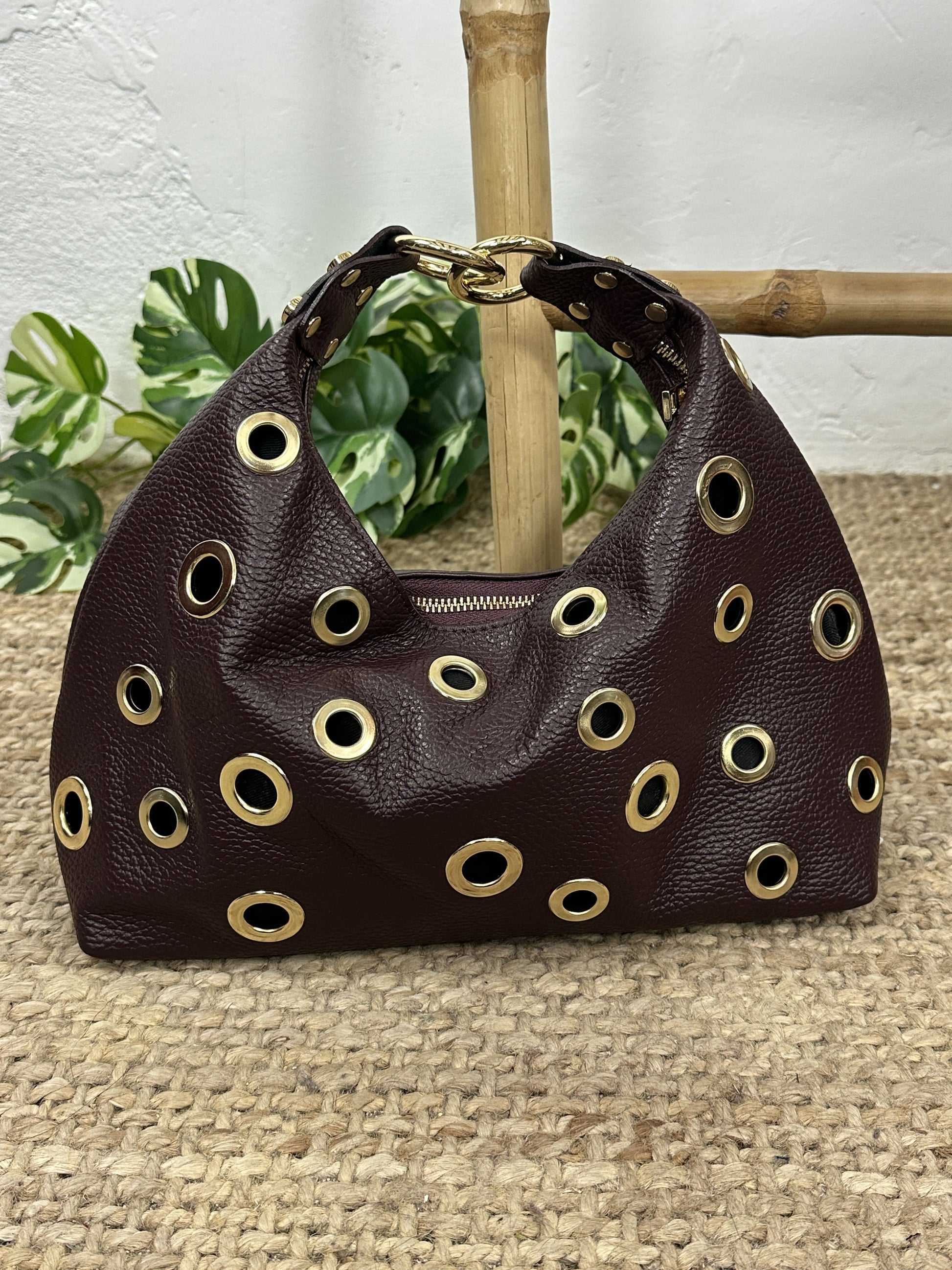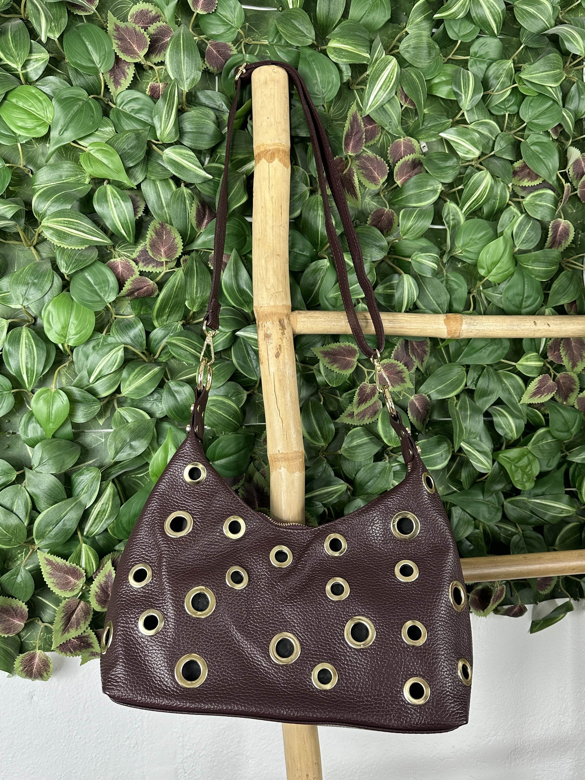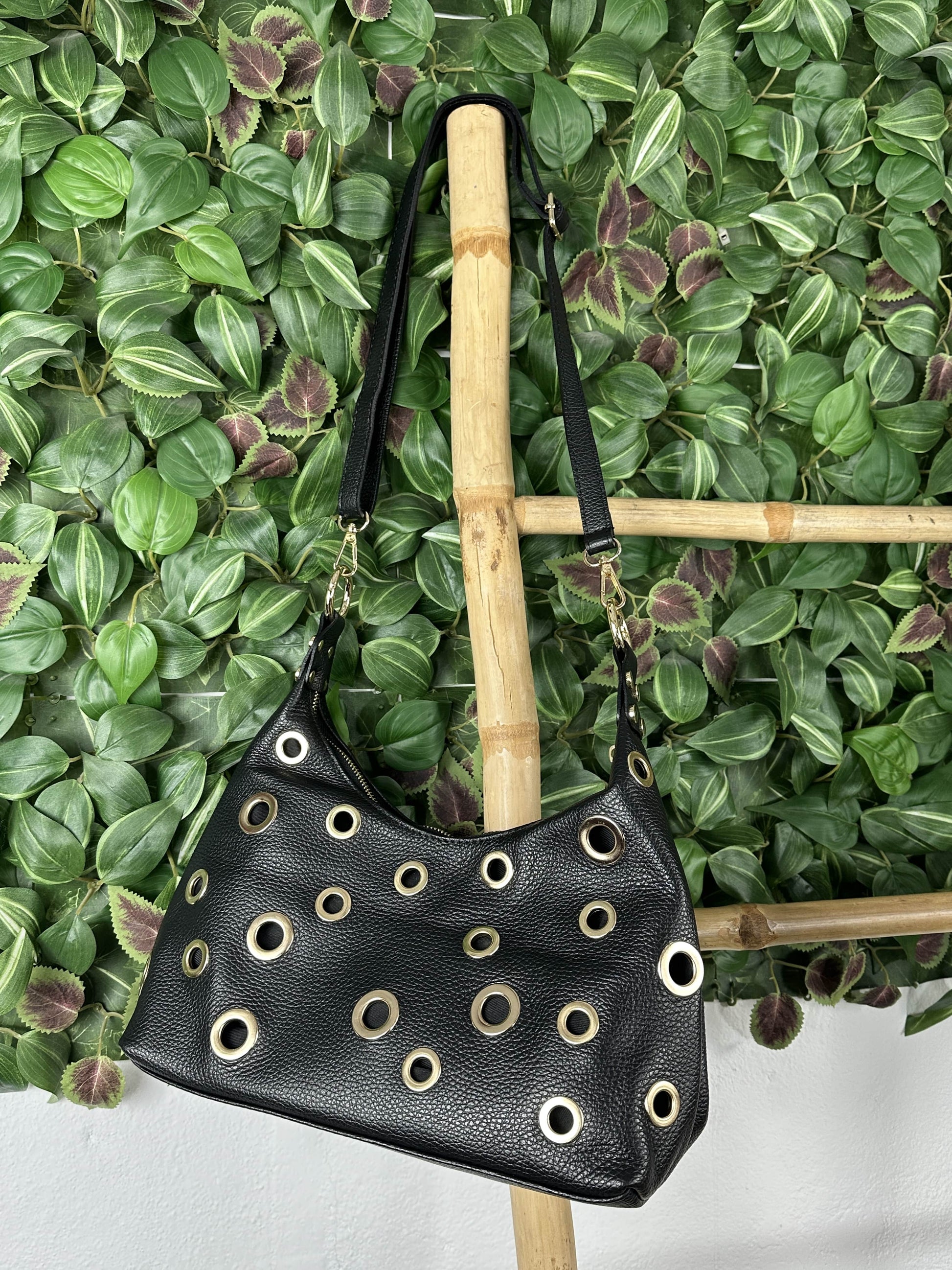 Bolso biposición con remaches de círculos dorados.