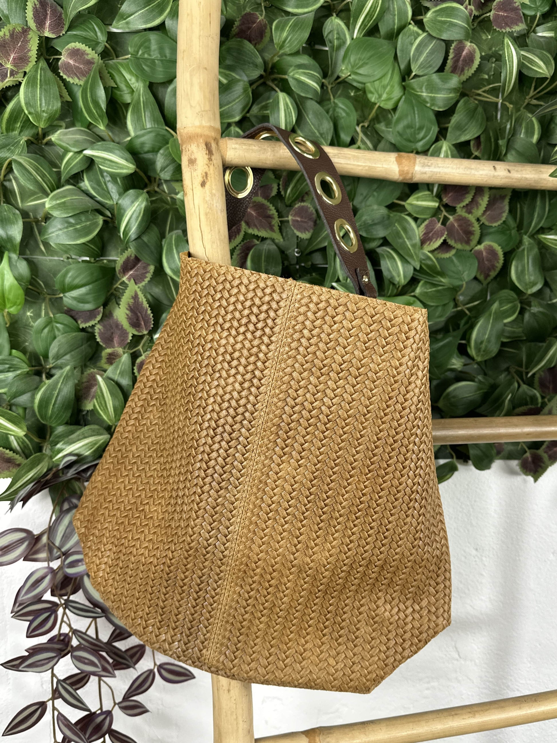 Bolso alargado con textura tipo espiga y asa con aperturas circulares de detalle dorado.