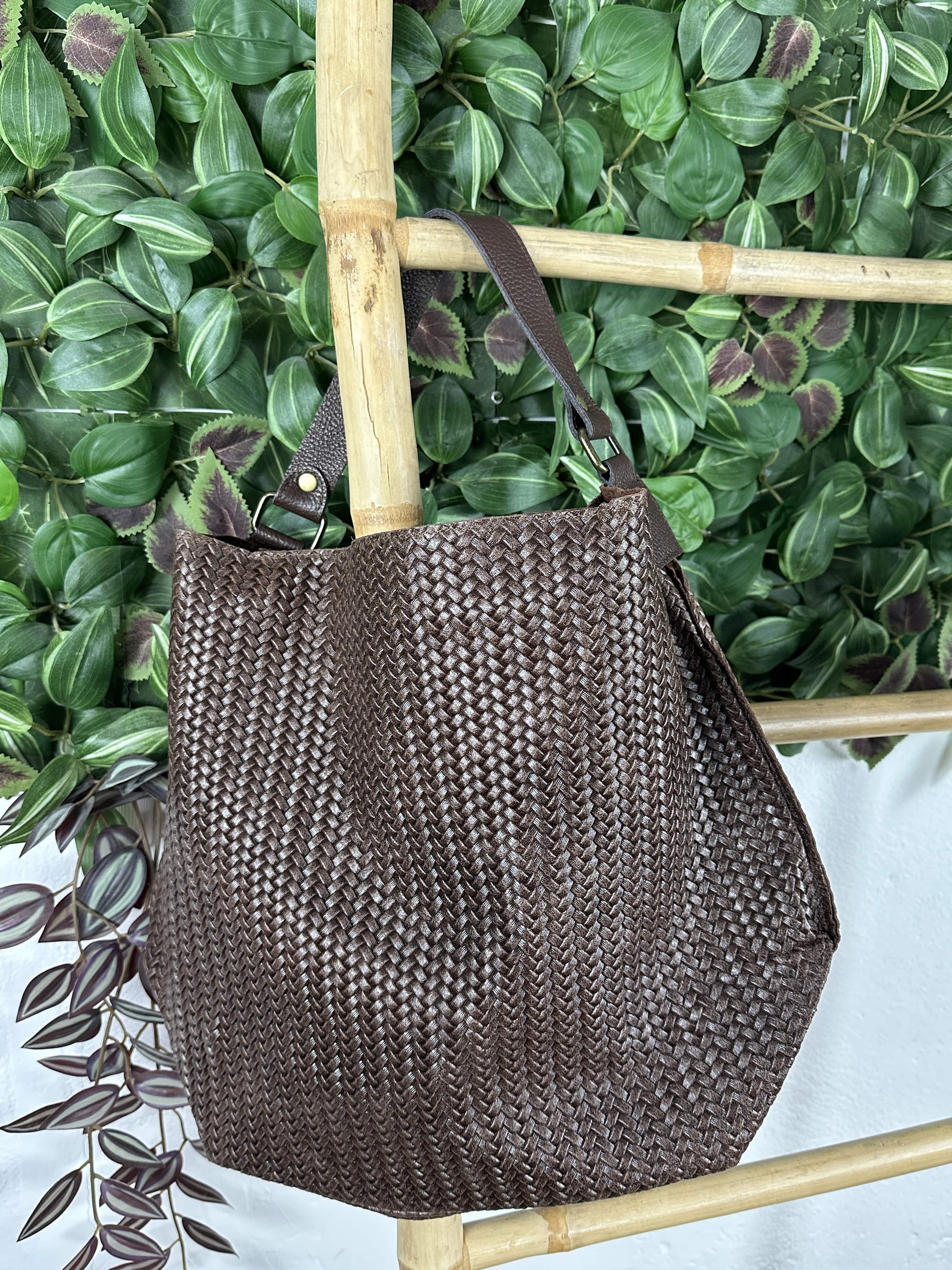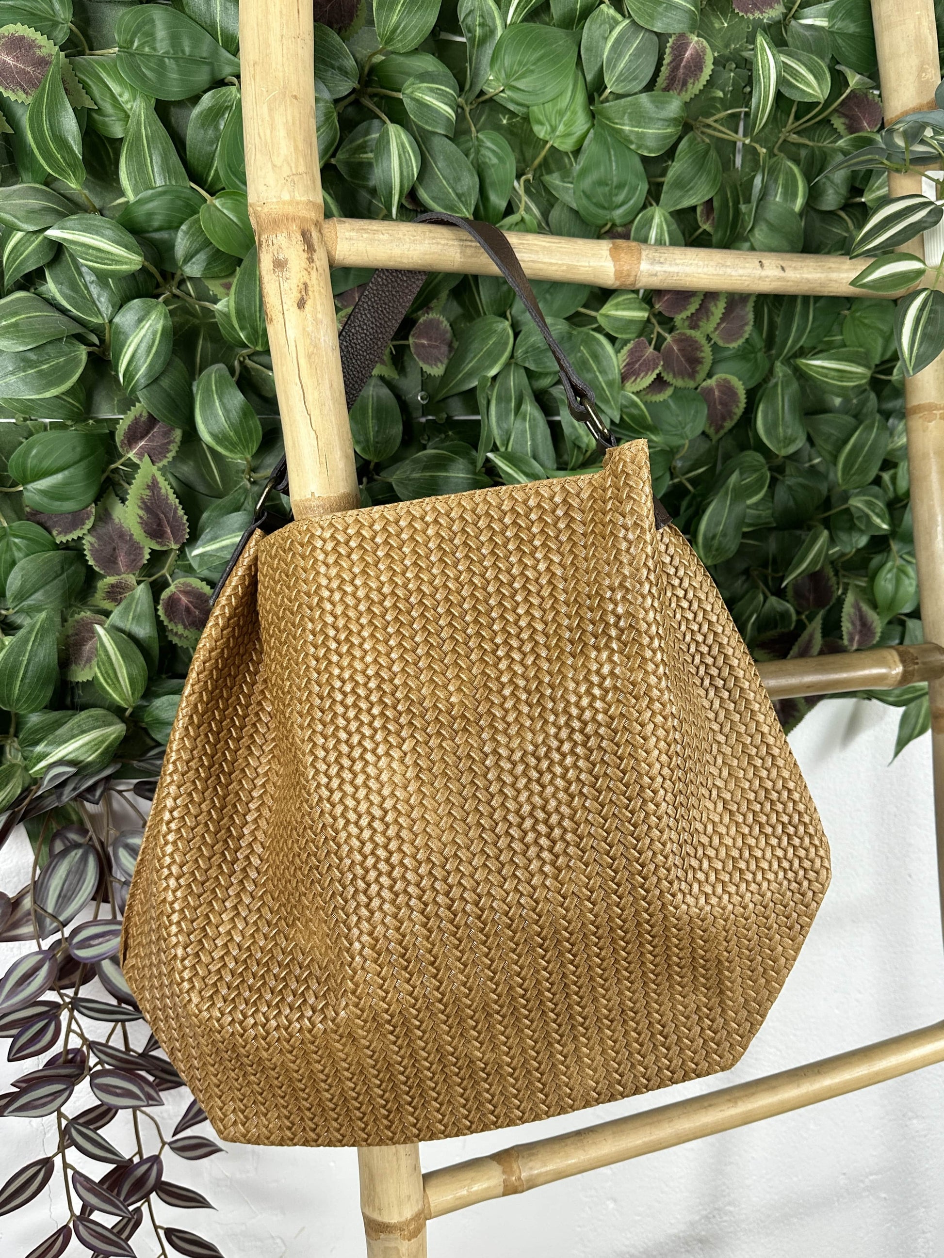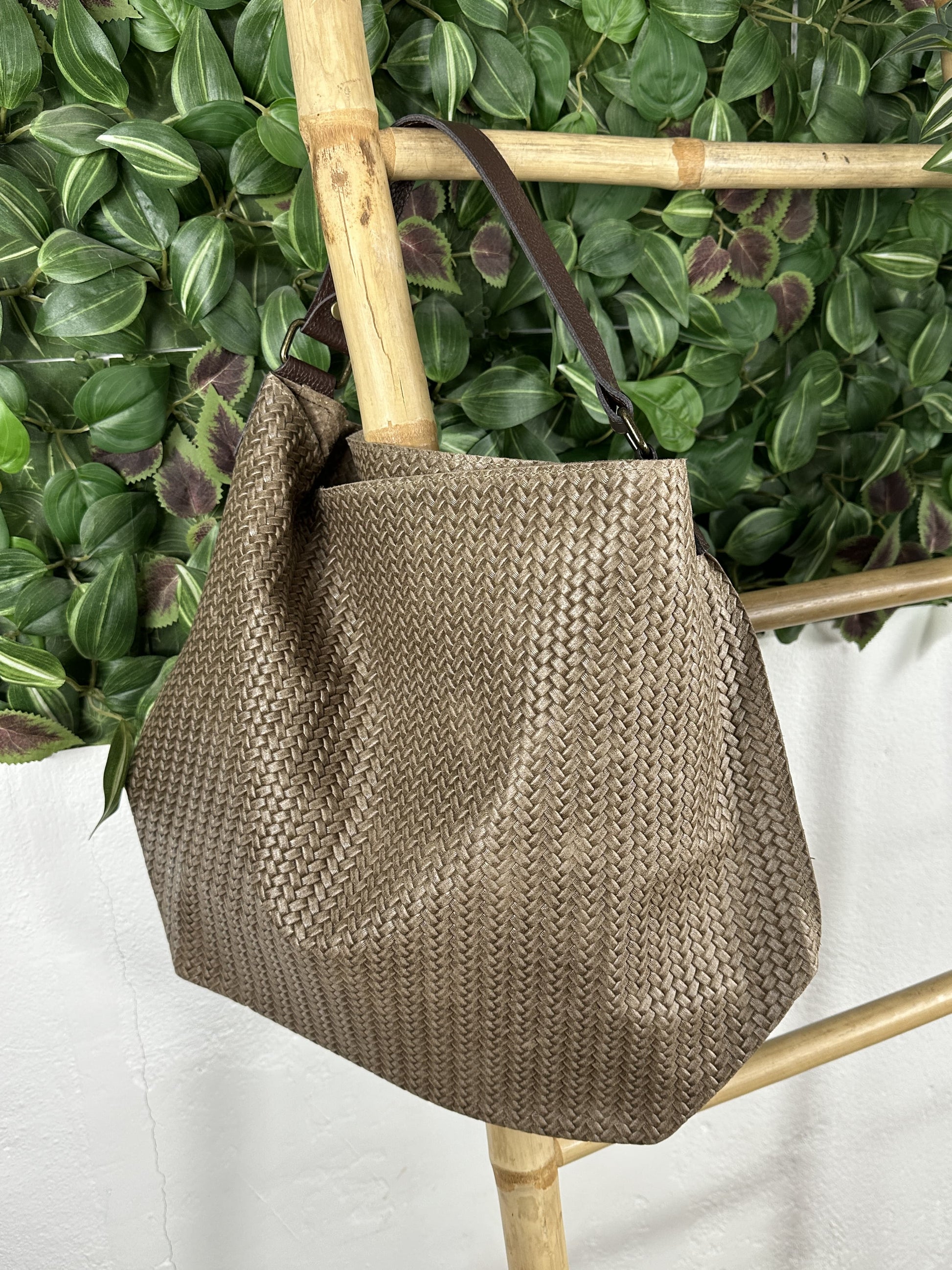 Bolso grande con textura tipo espiga y asa marrón.