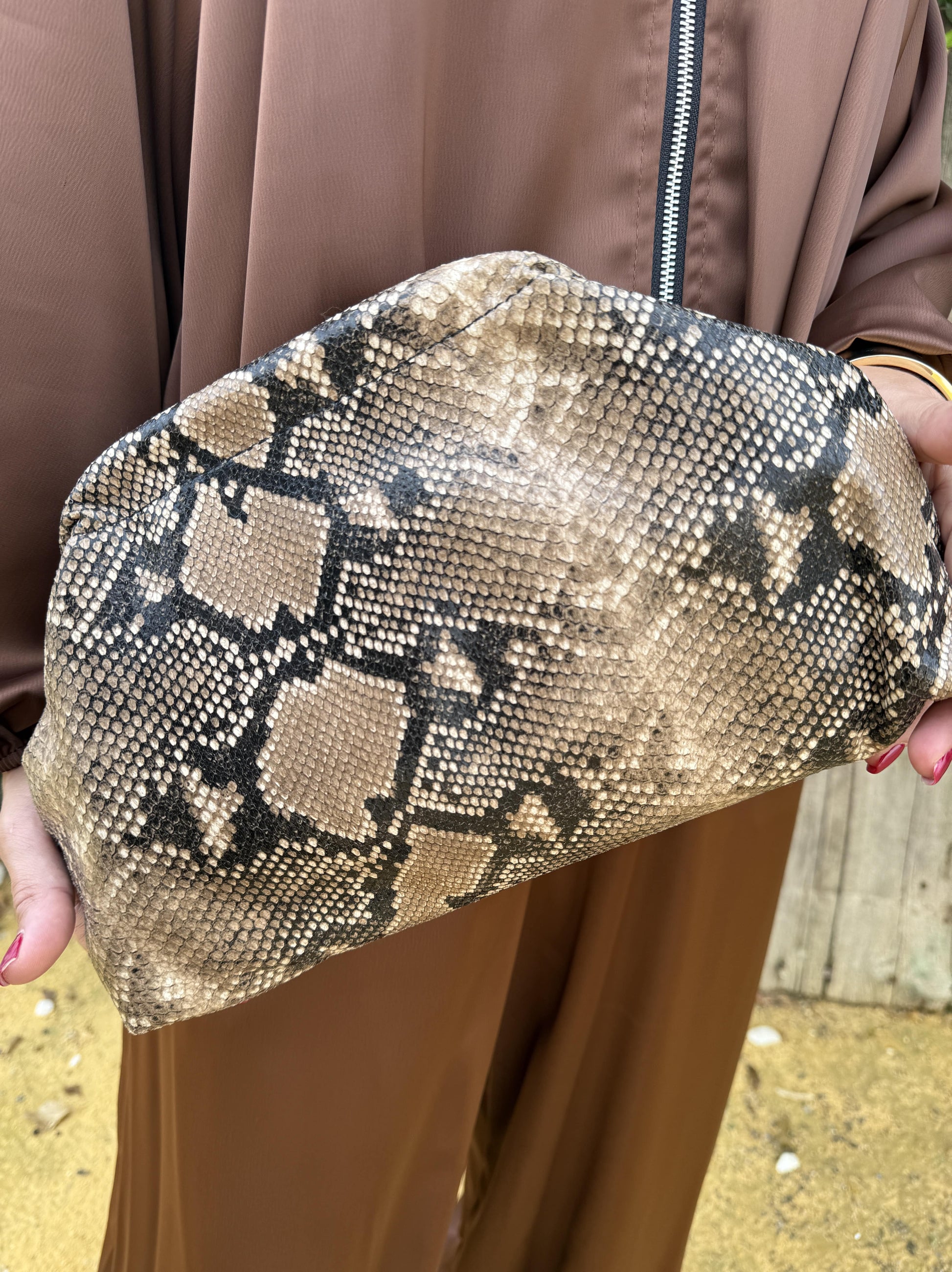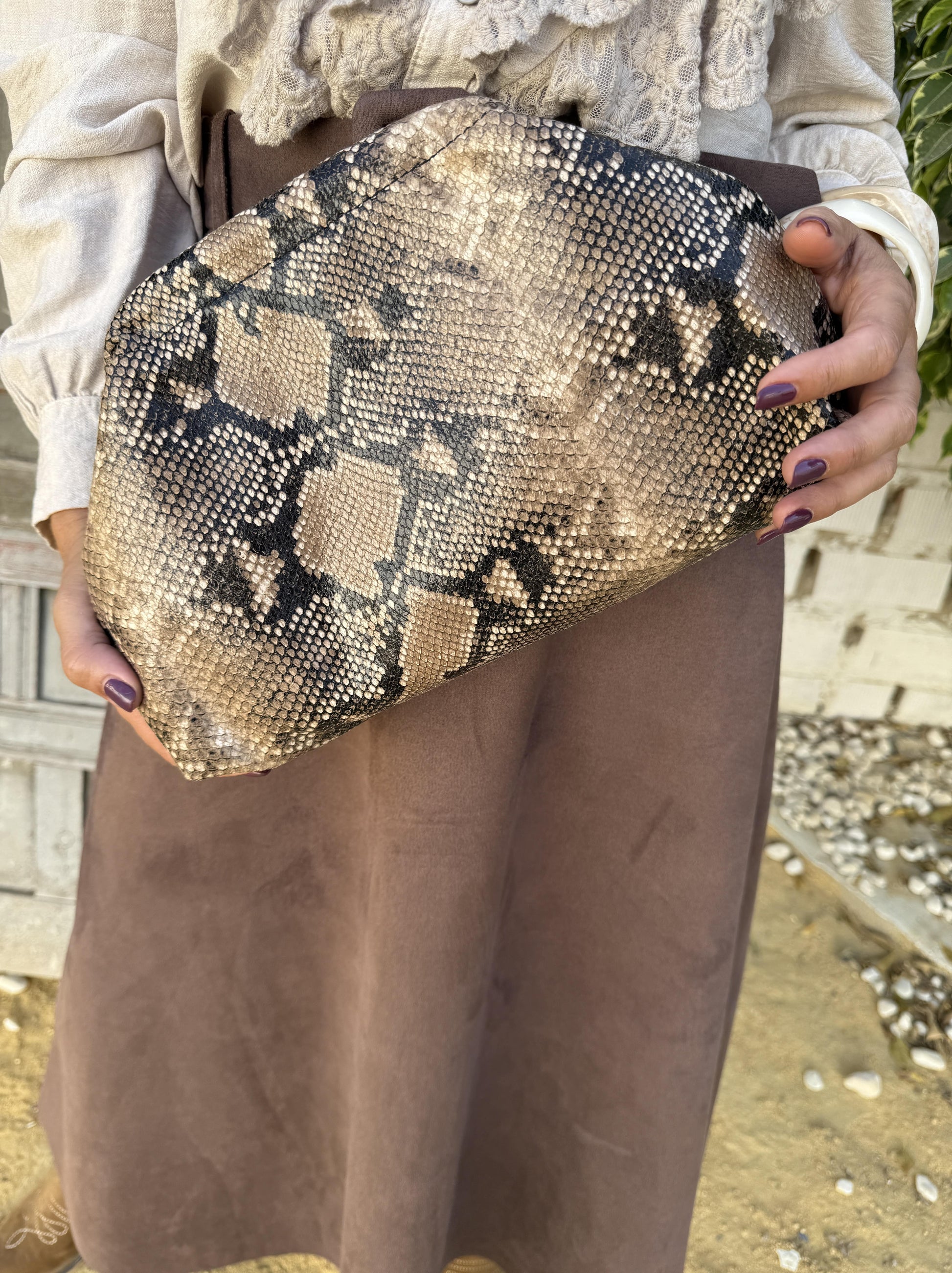 Está disponible en estampado animal print de serpiente color marrón y topo.