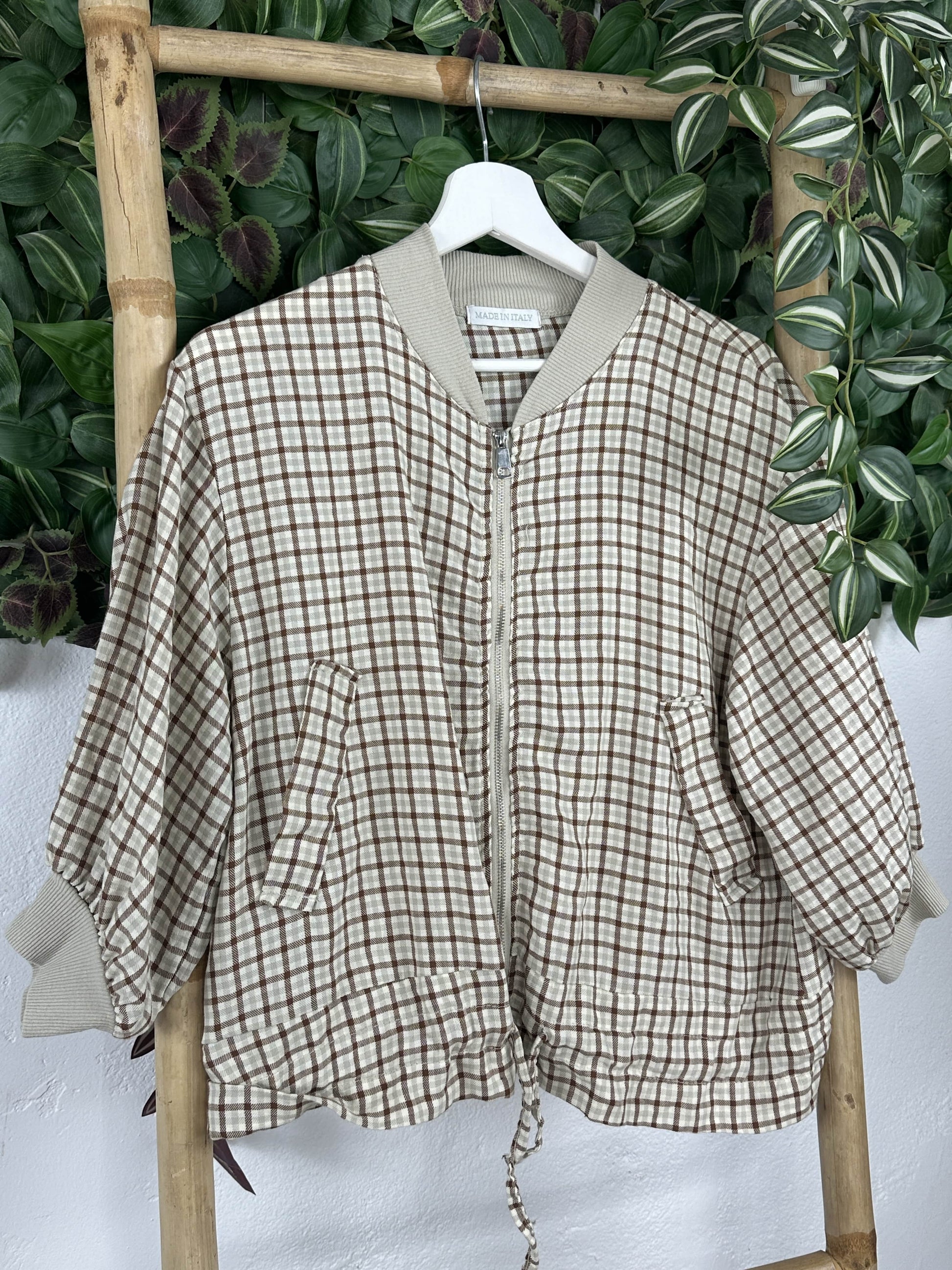 El bajo de la bomber se puede fruncir con un cordón del mismo estampado.