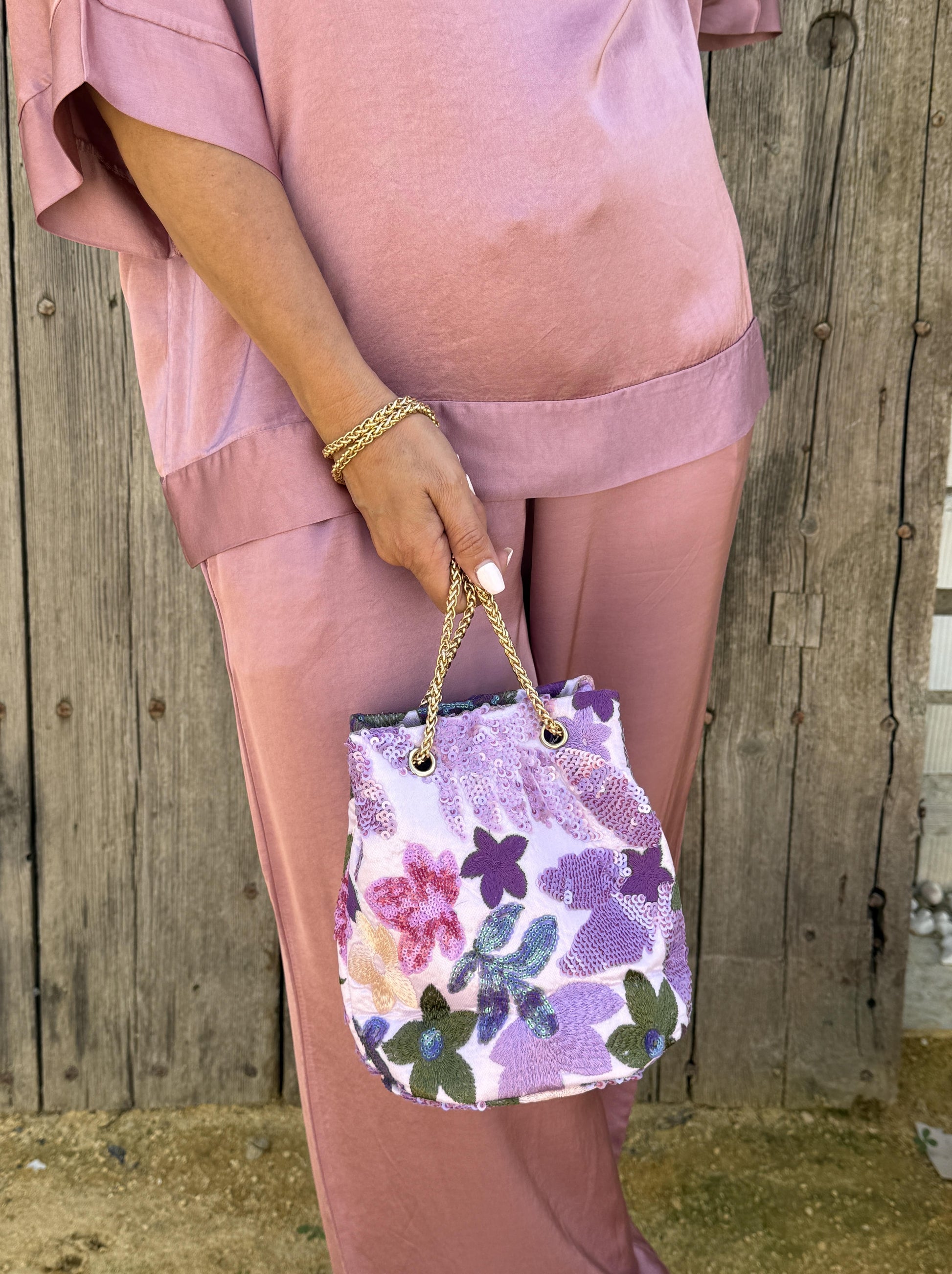 Bombonera bordada con pedrería y flores con hilo de colores.