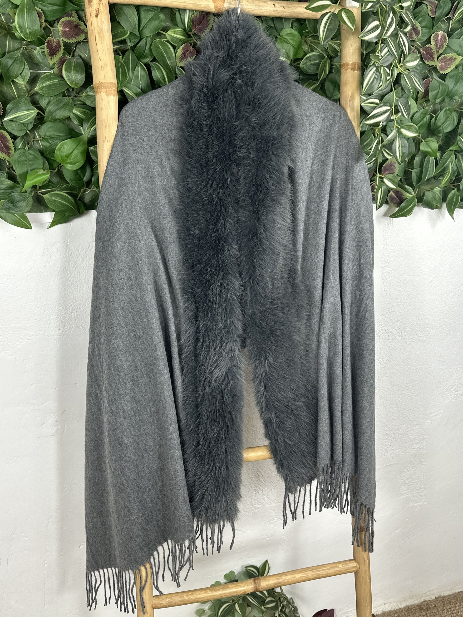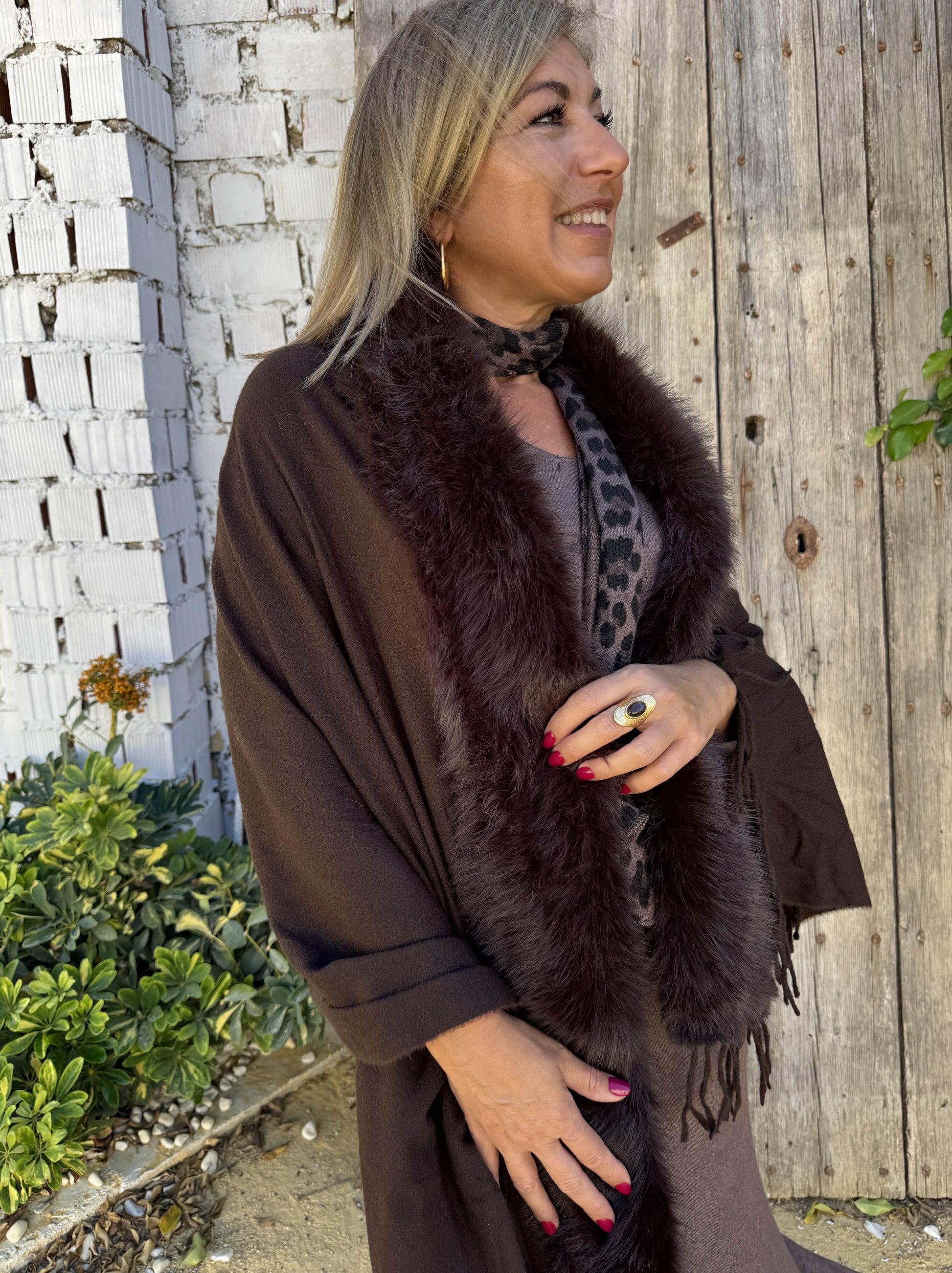 Bufanda tipo capa con pelo en toda la zona del cuello y flecos en los bajos.