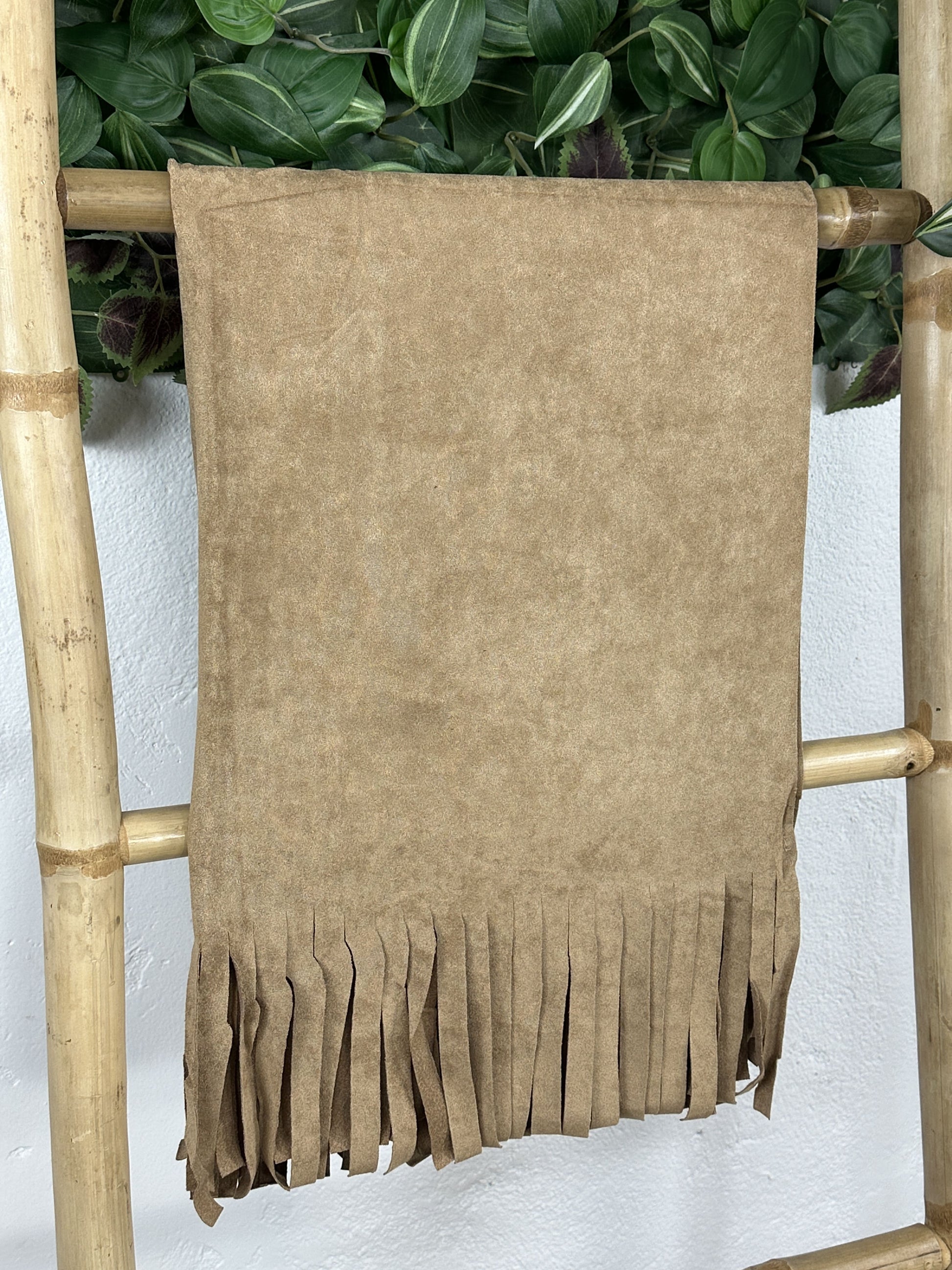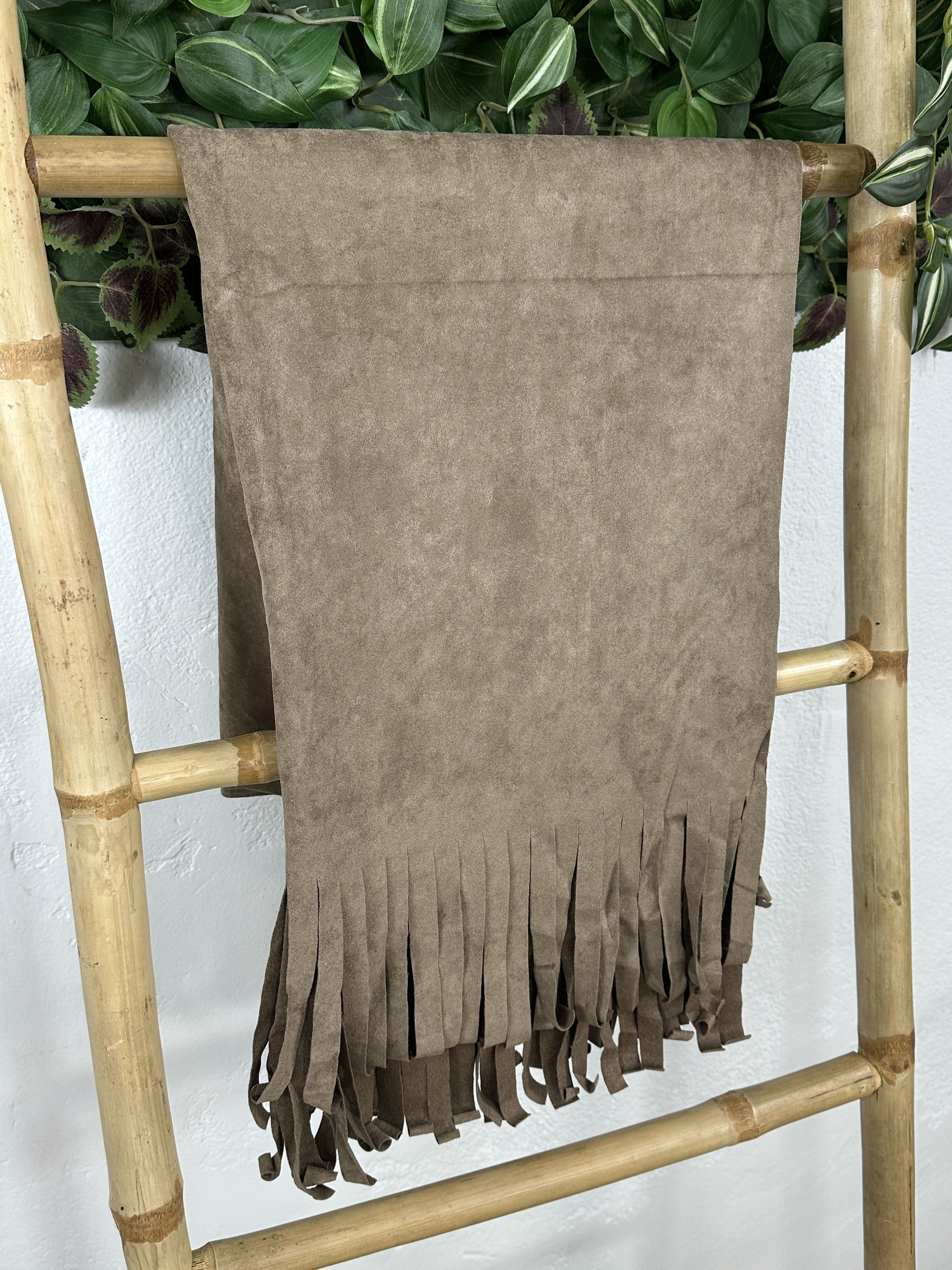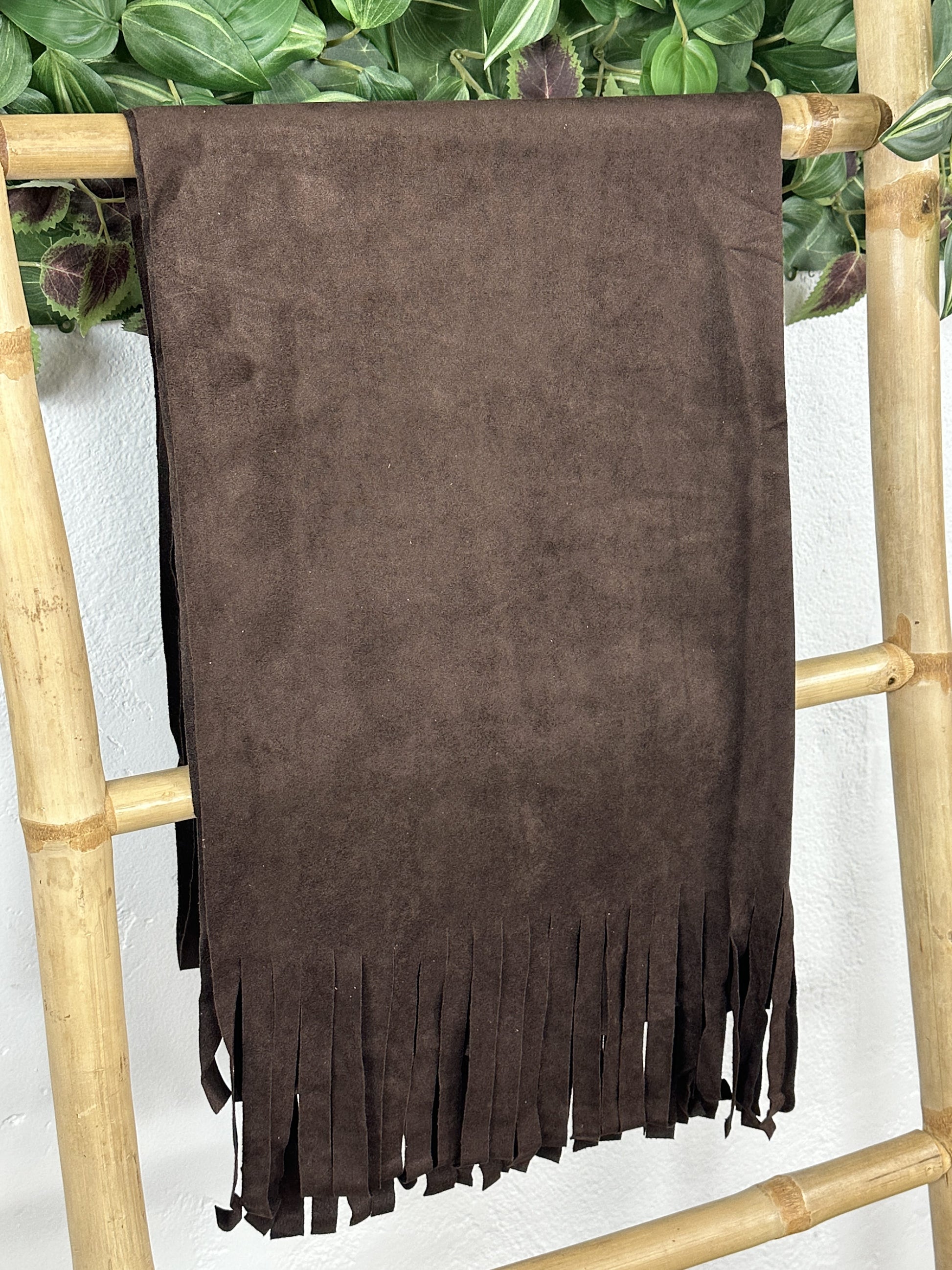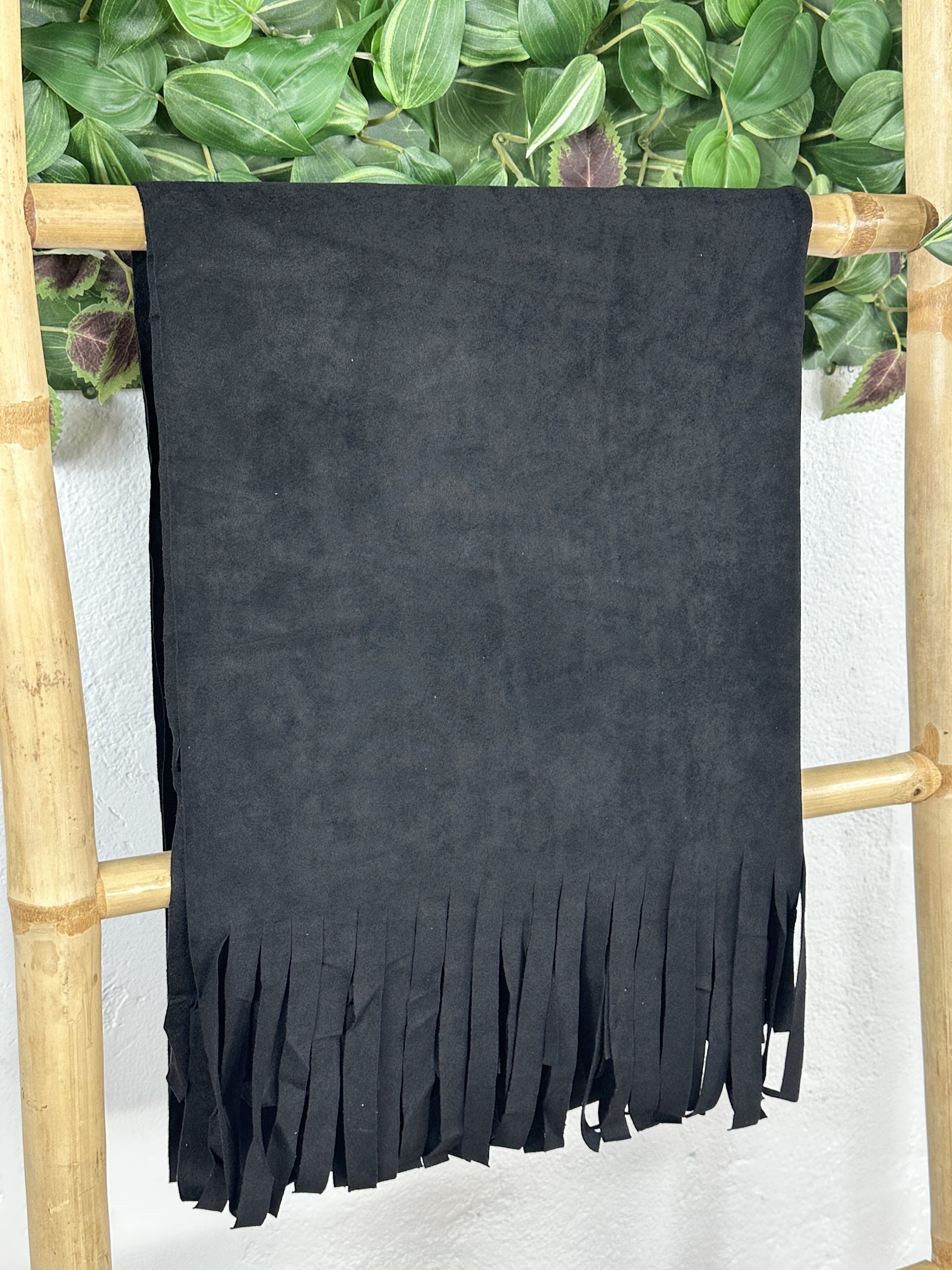 Bufanda con tacto gustoso tipo antelina y flecos en los bordes de la bufanda.