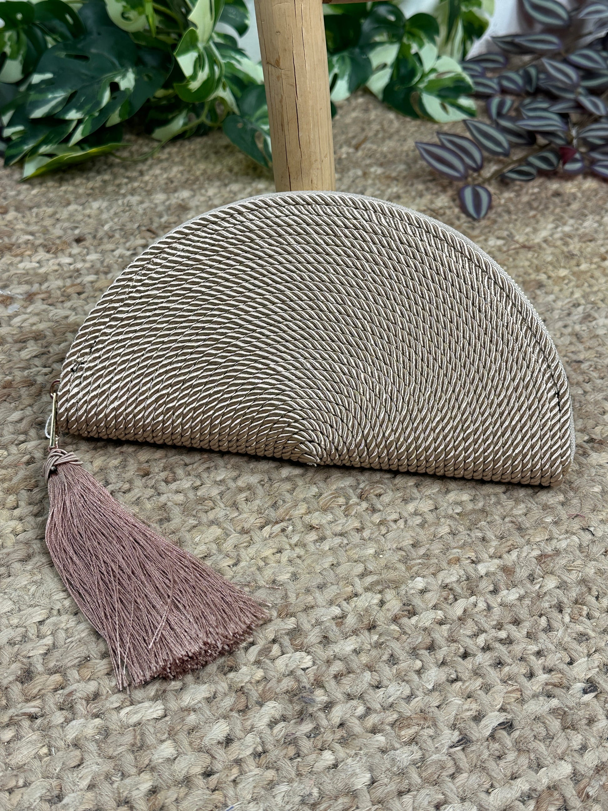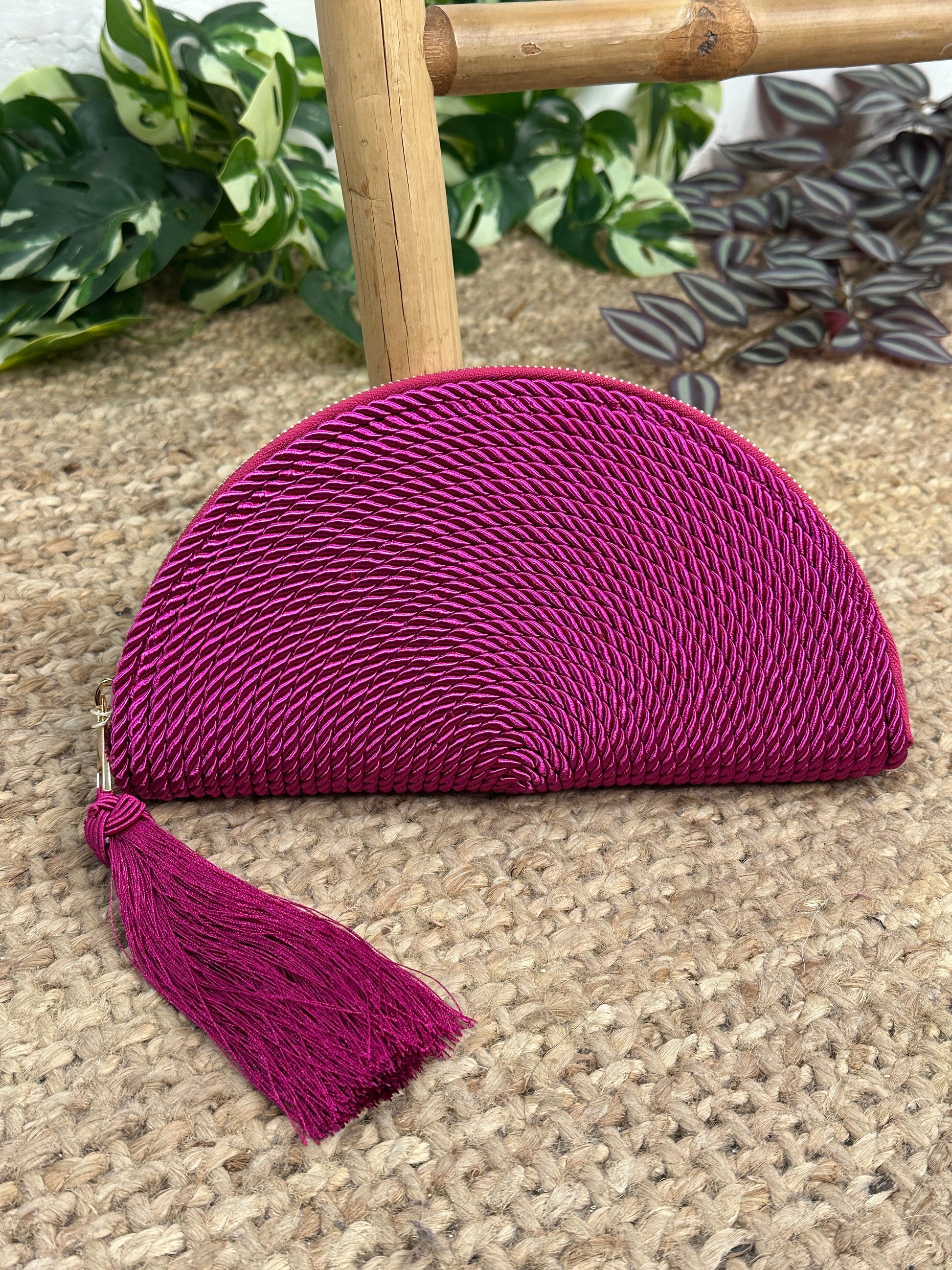 Cartera de mano en forma de abanico con cordón.