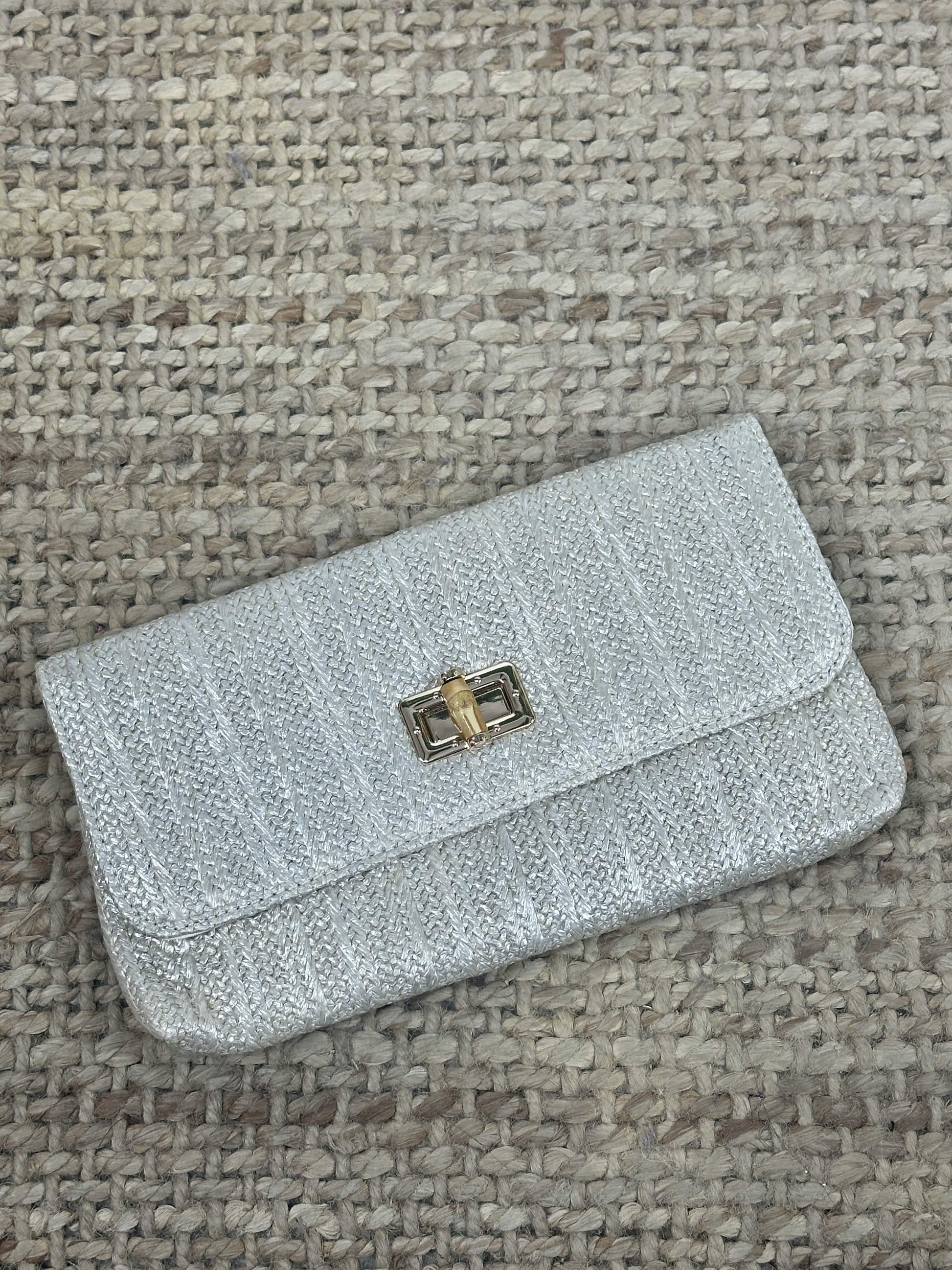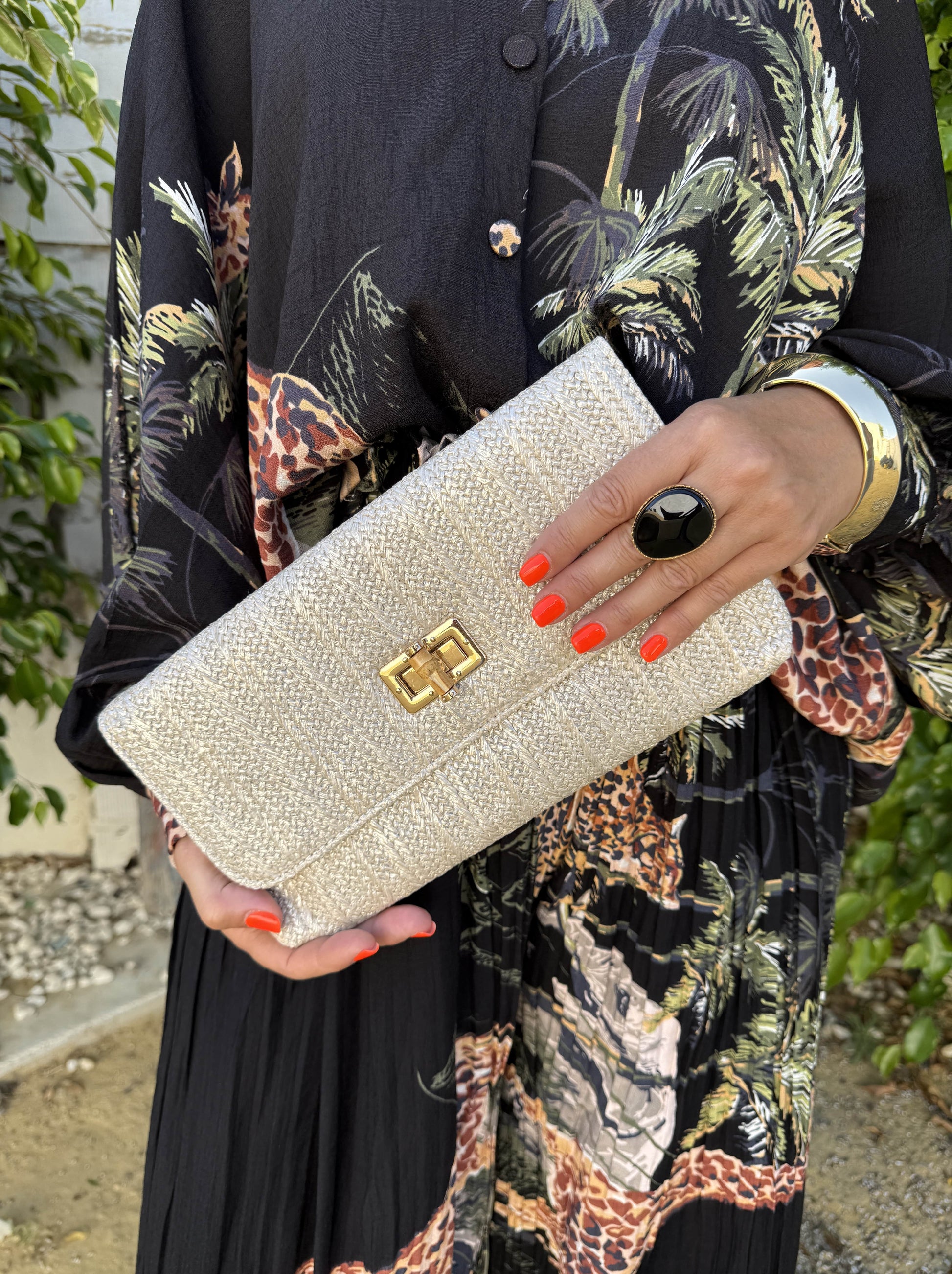 Cartera de mano con efecto rafia y cierre por clip de caña.