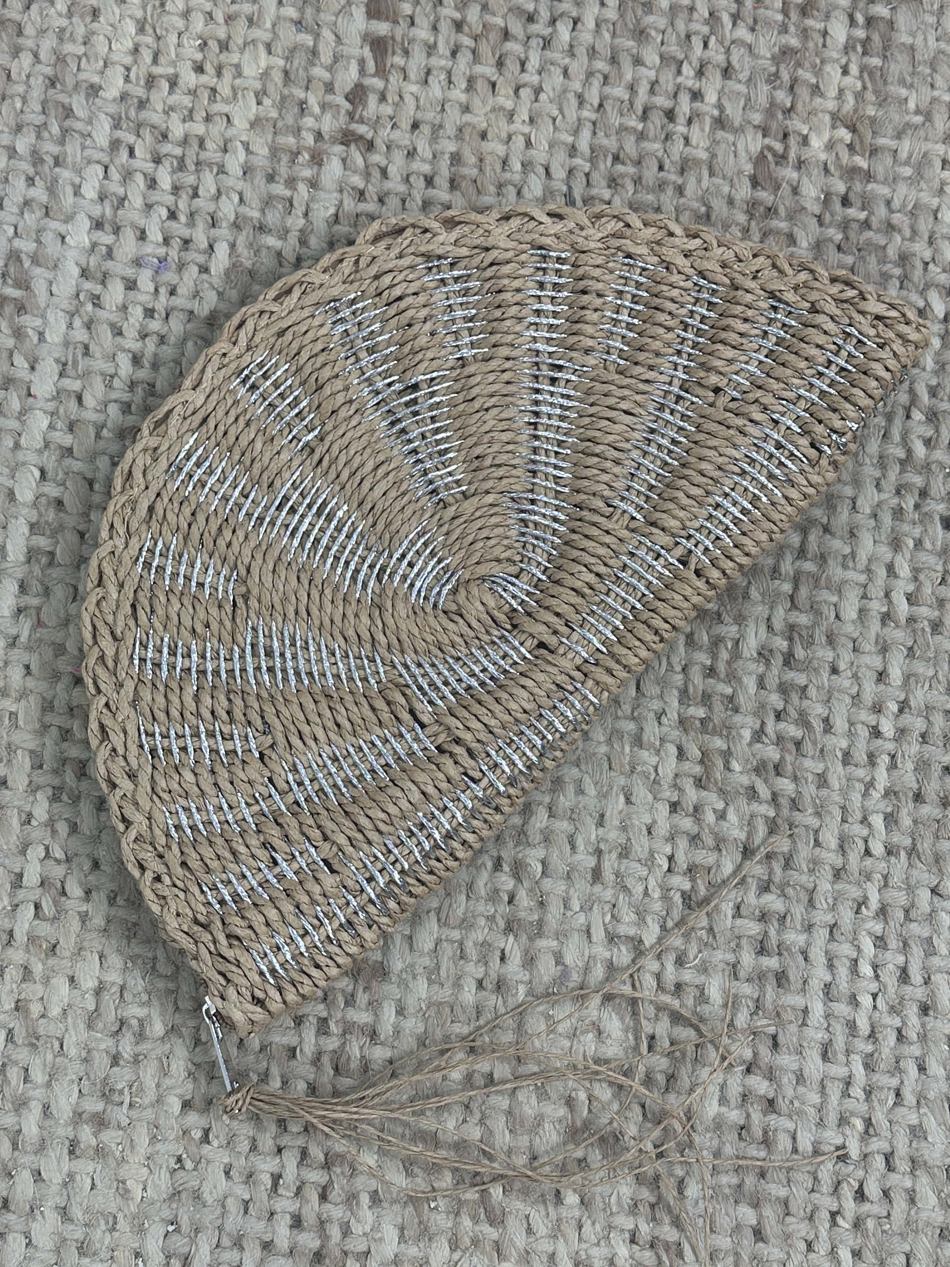 Cartera de mano tipo rafia con forma de abanico y detalles dorados.