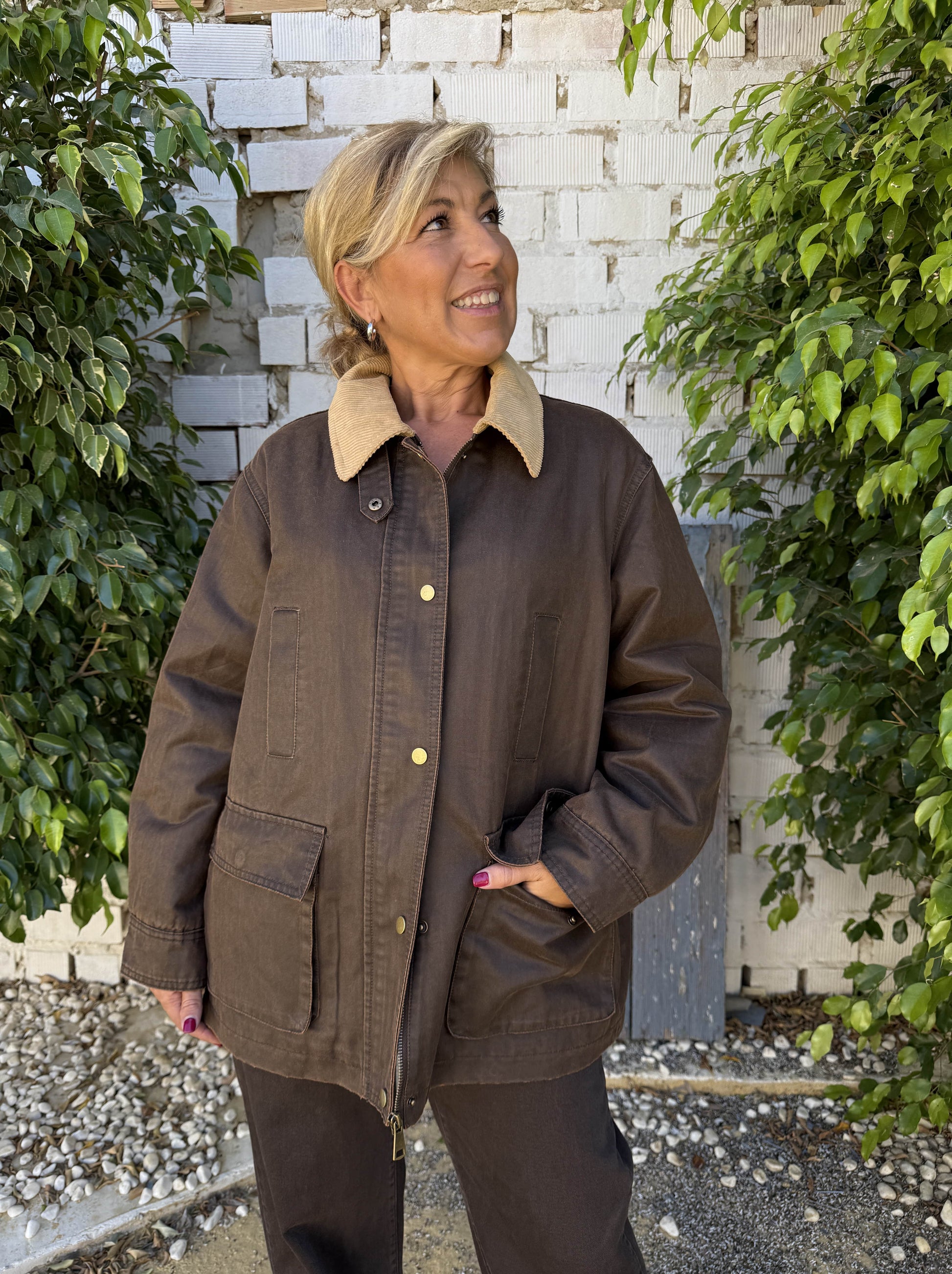 Chaqueta de mujer tipo barbour con bolsillos y cierre con cremallera.