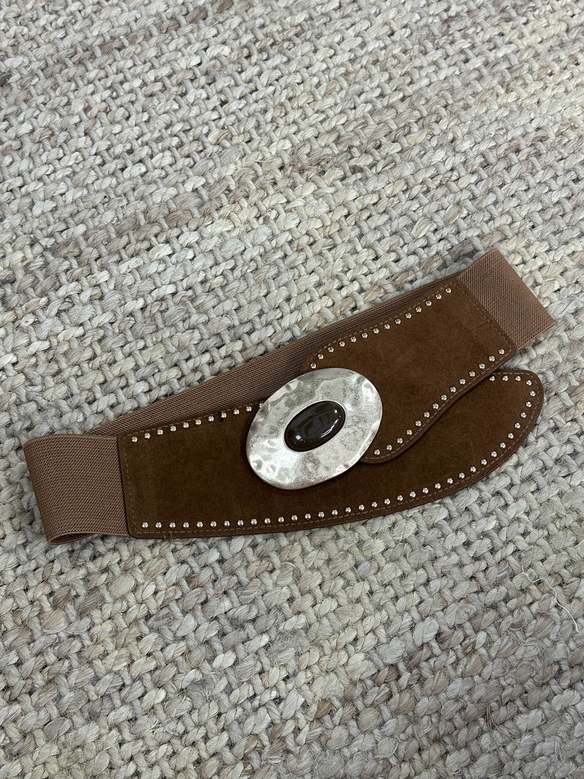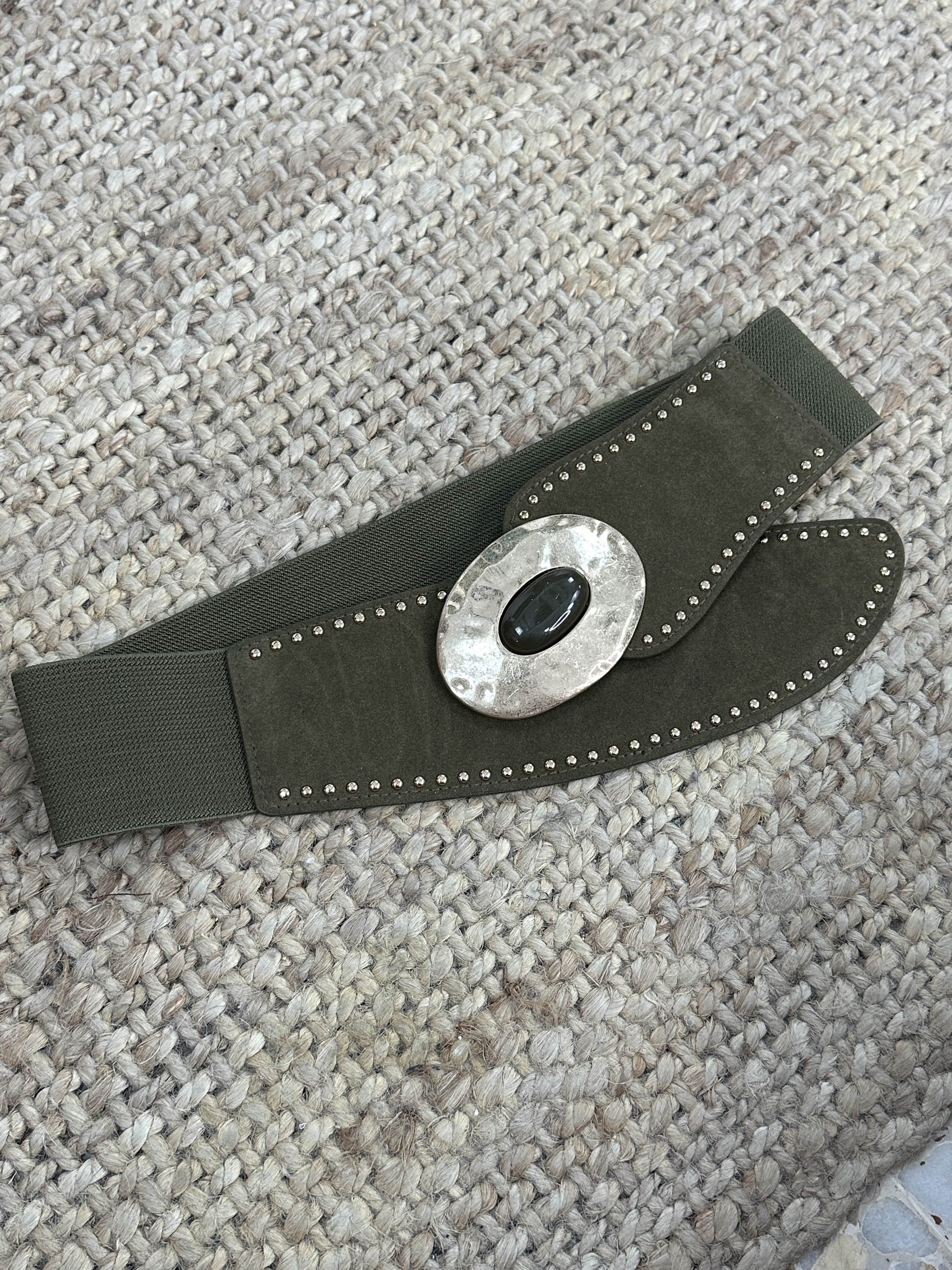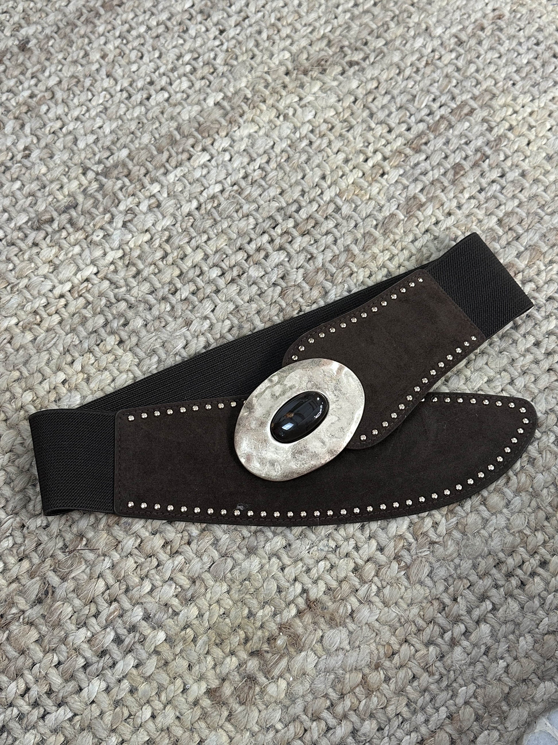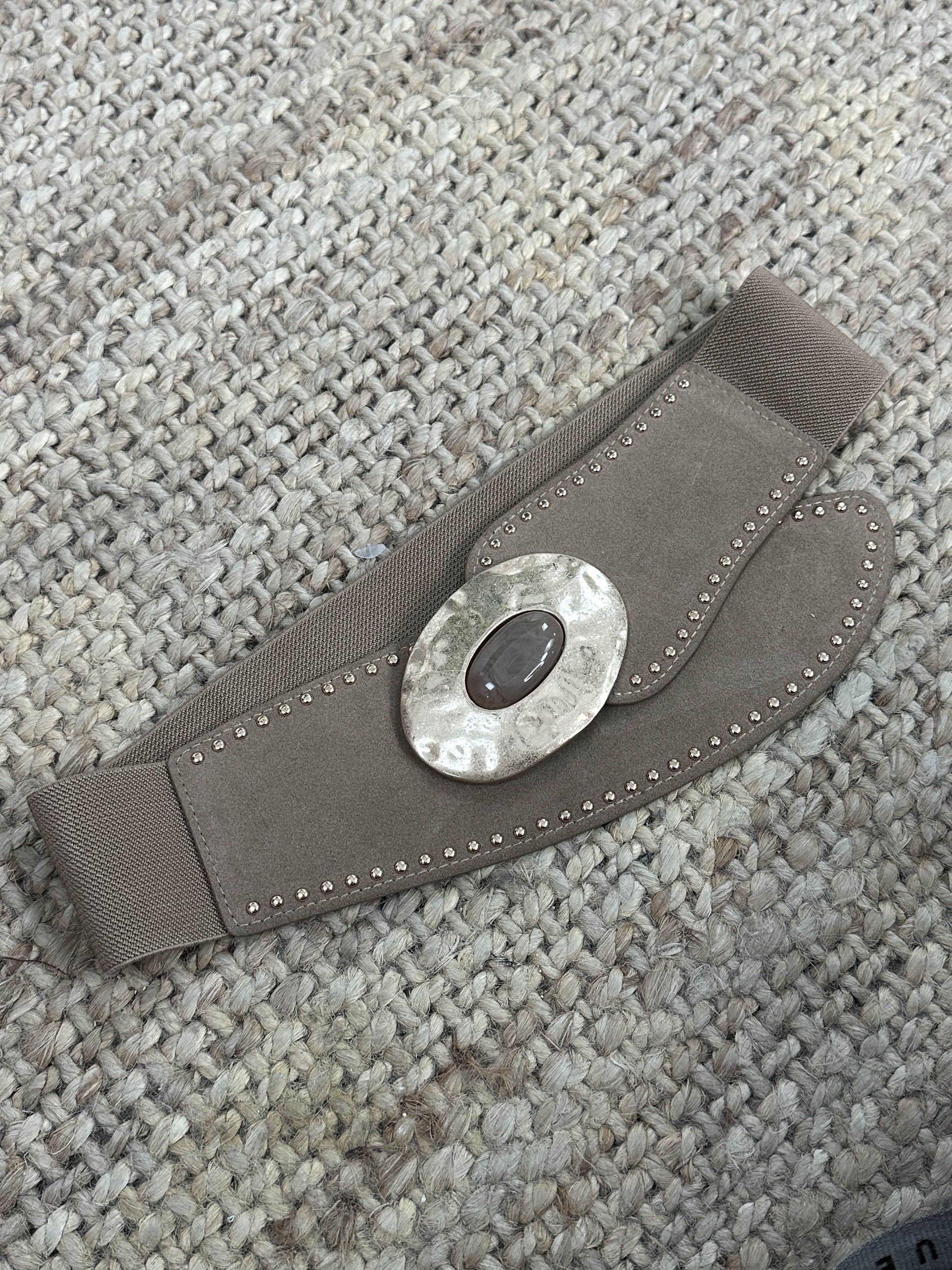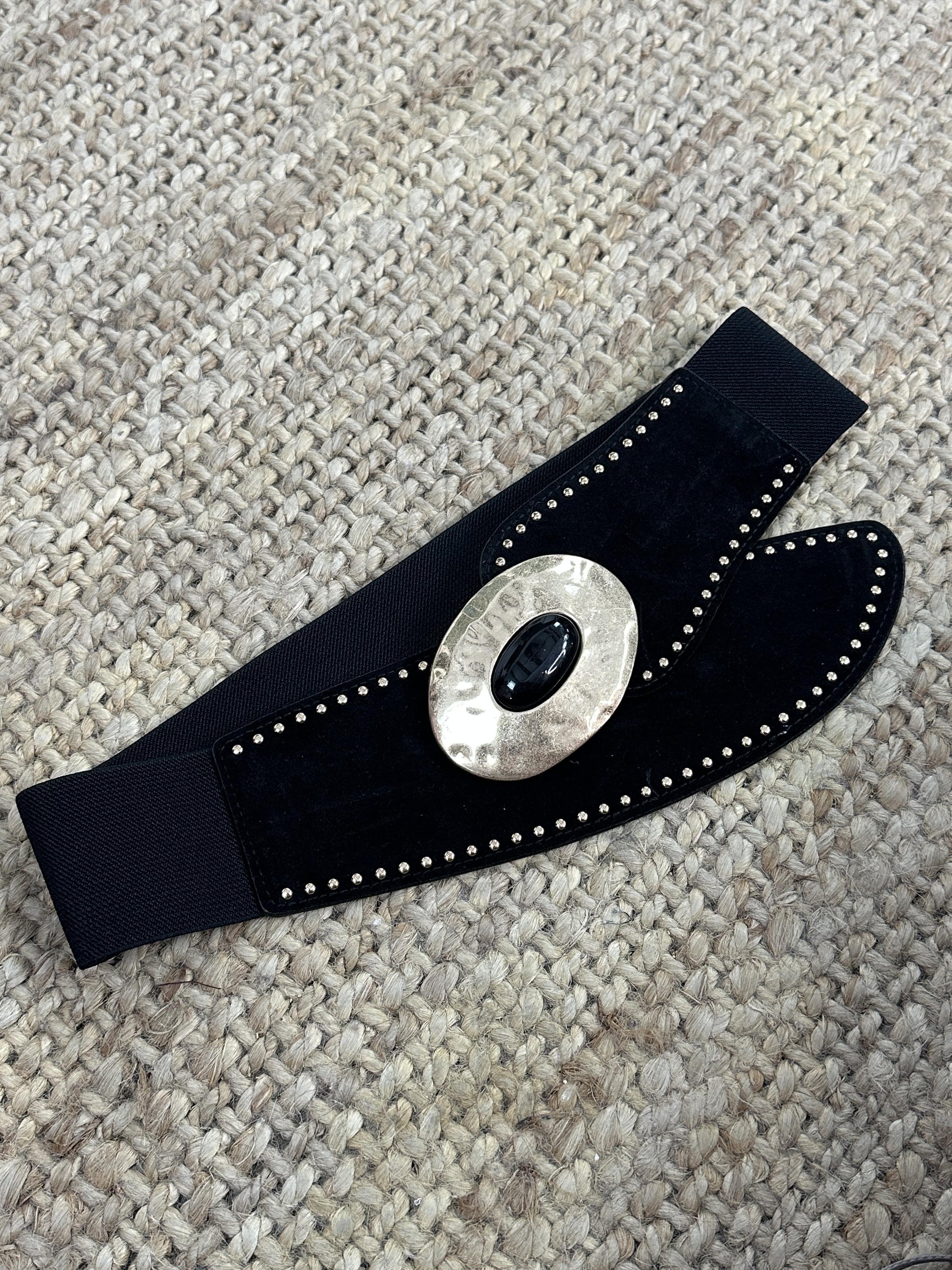 En la parte delantera hay un abalorio dorado con piedra decorativa en el centro