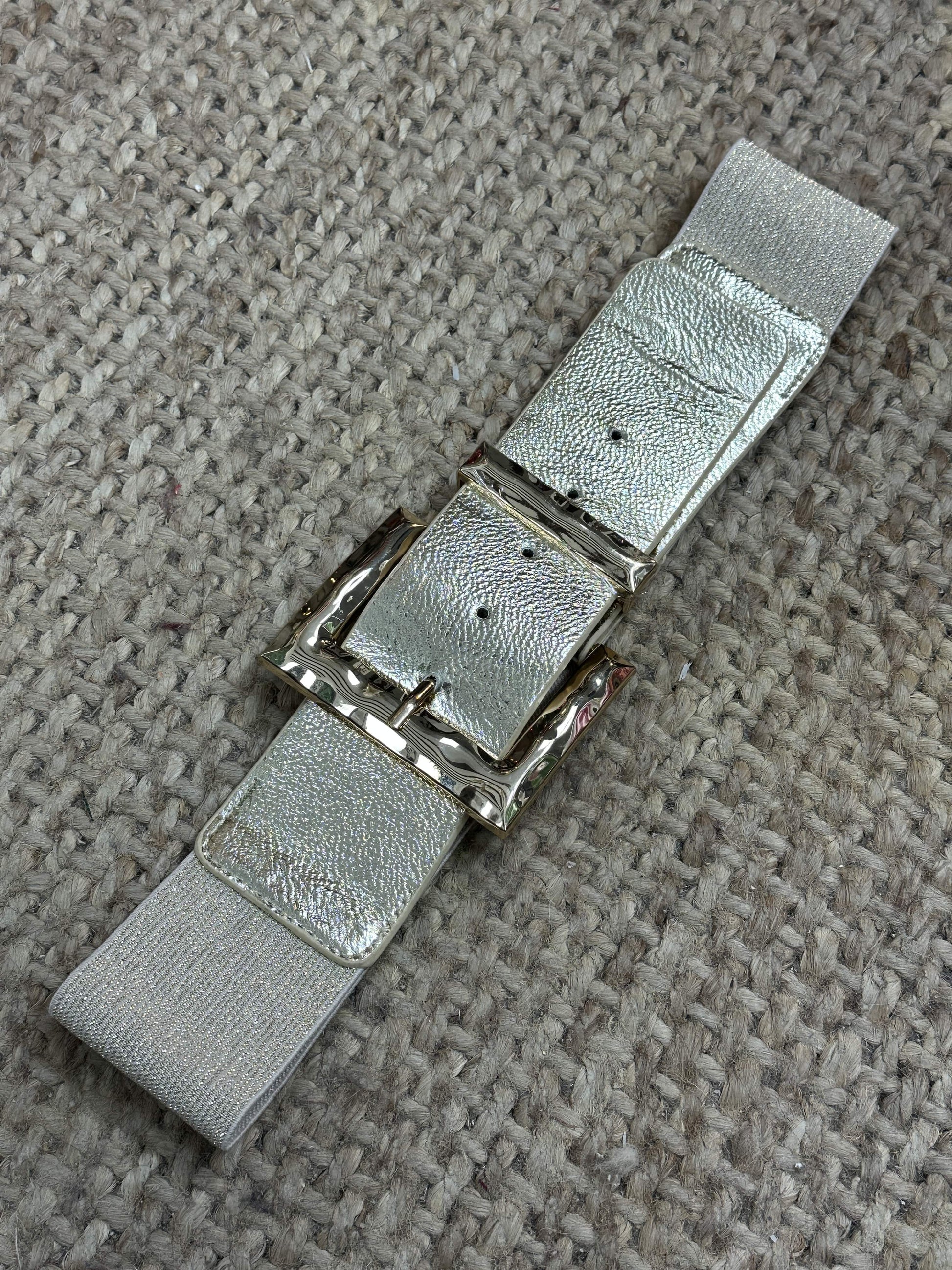 Cinturón dorado con hebilla ancha.