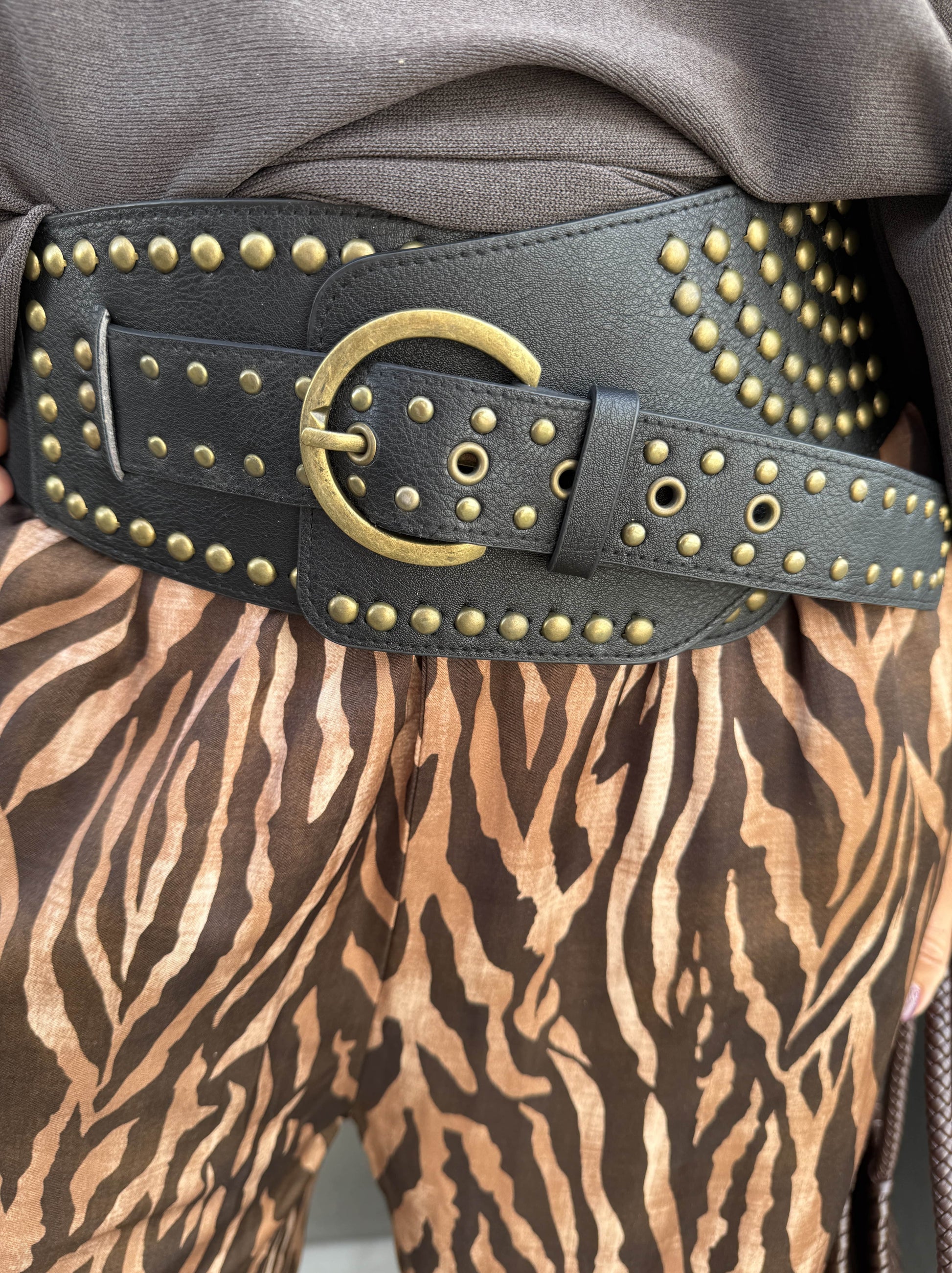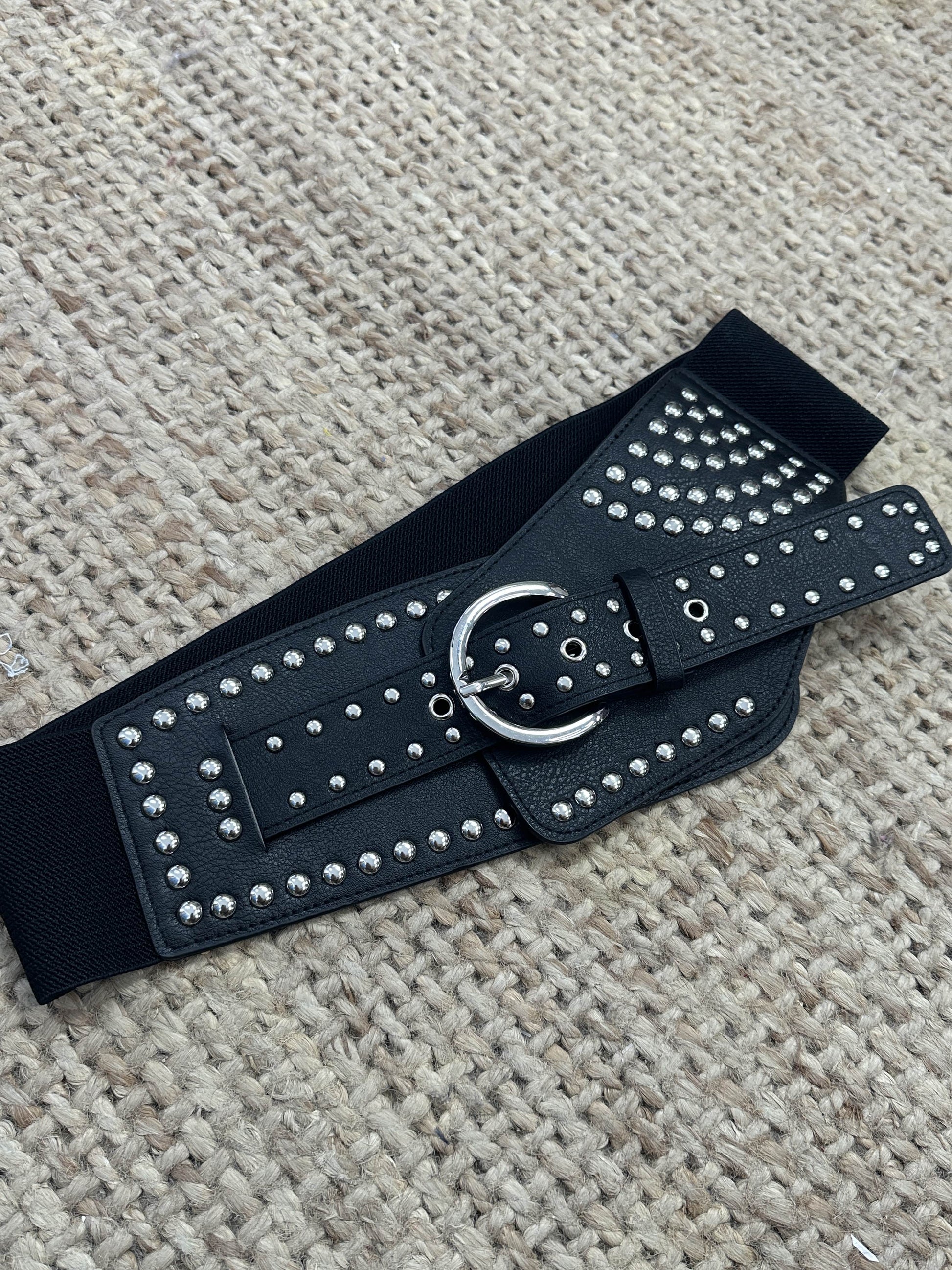 Cinturón fajín ancho con tachuelas y elástico en la parte trasera.