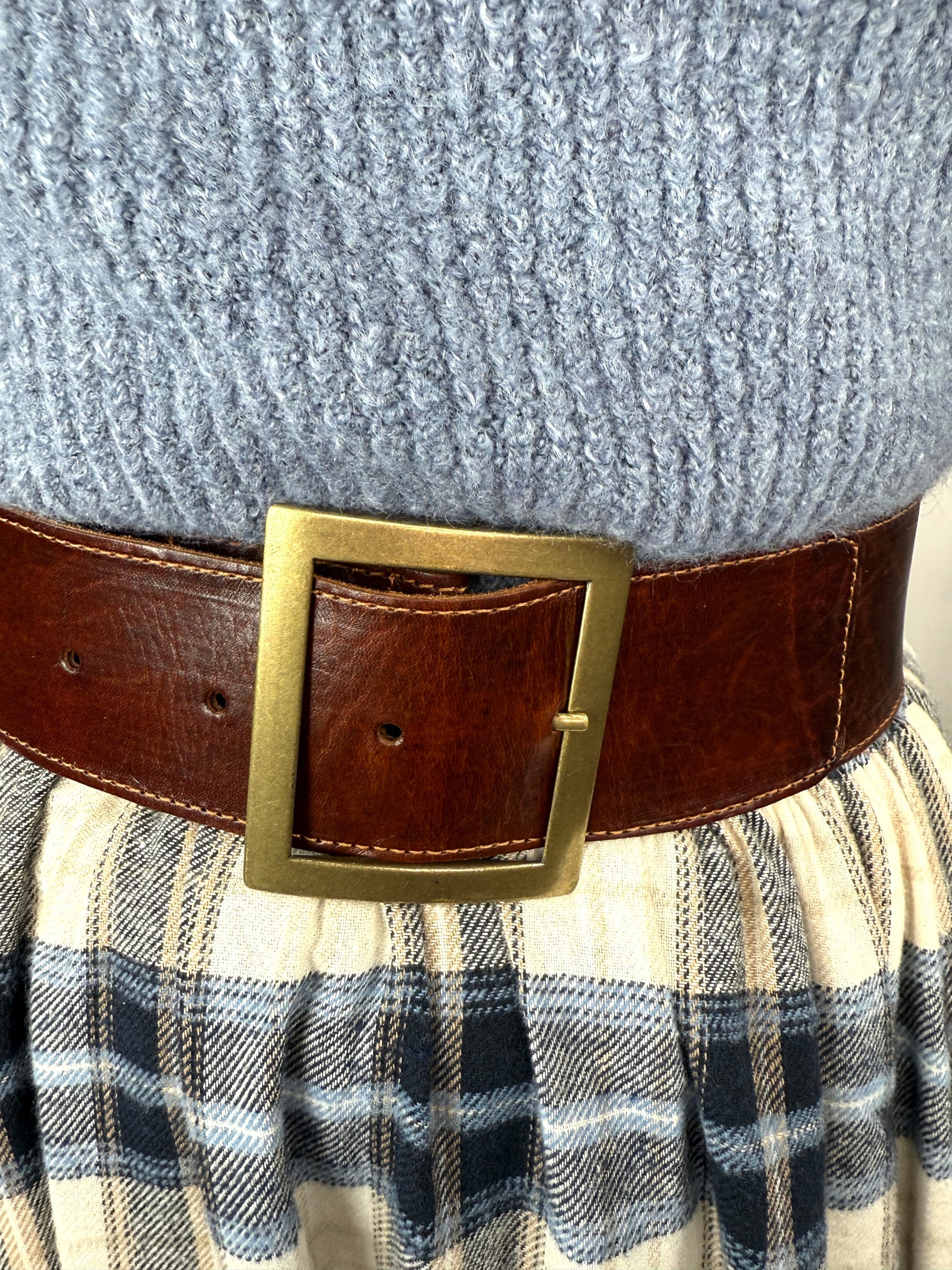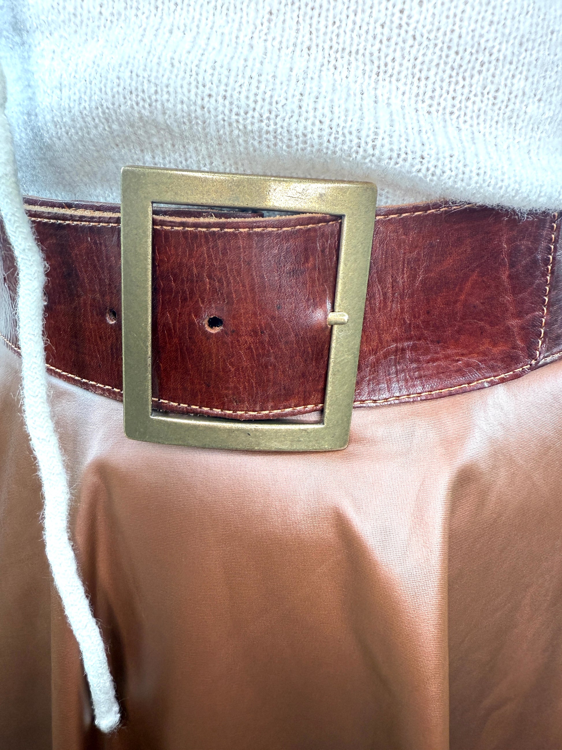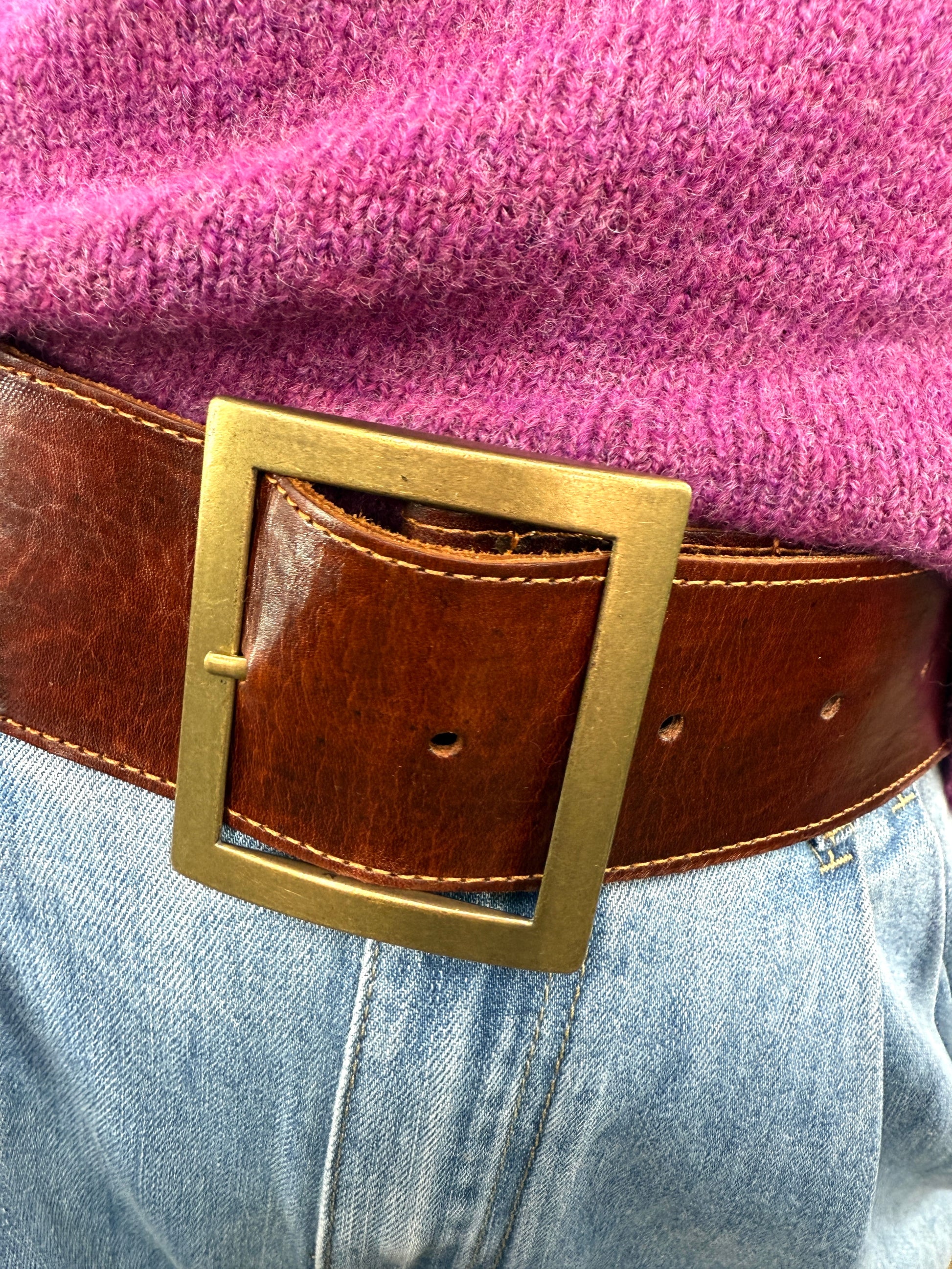 Cinturón de piel ancho con hebilla grande en color dorado y efecto envejecido.