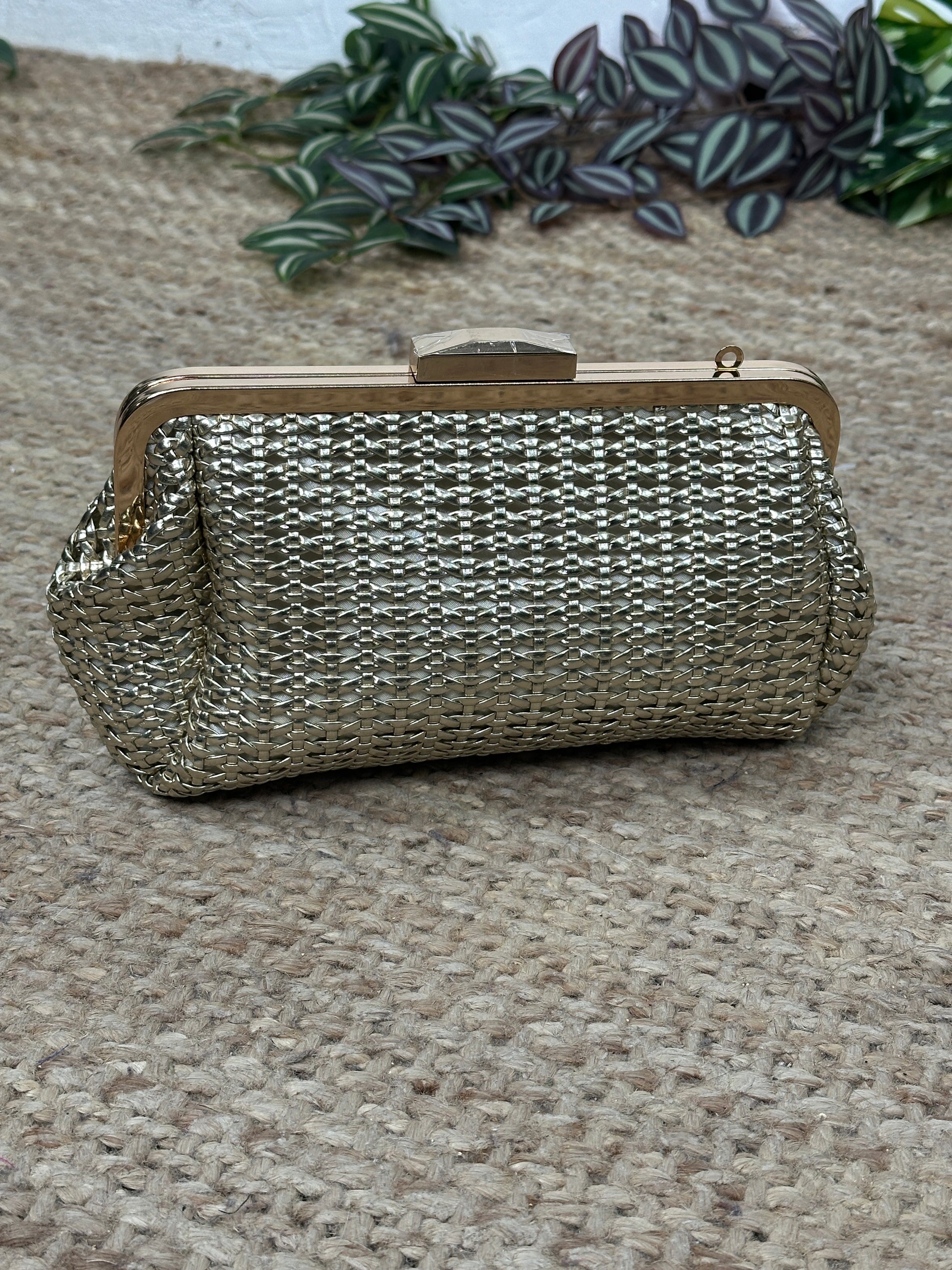 Bolso tipo clunch con tejido trenzado y acabado metalizado en color dorado.