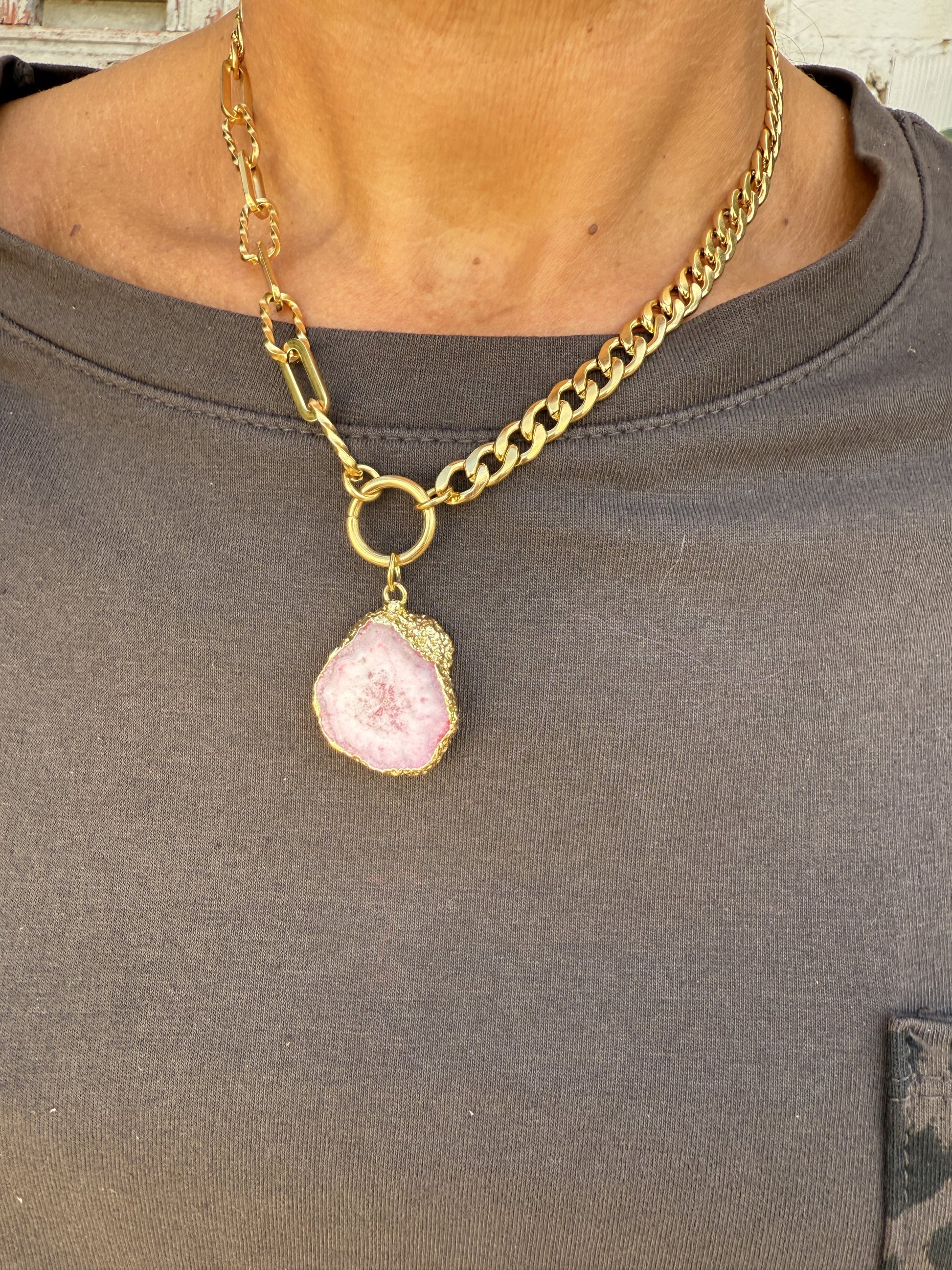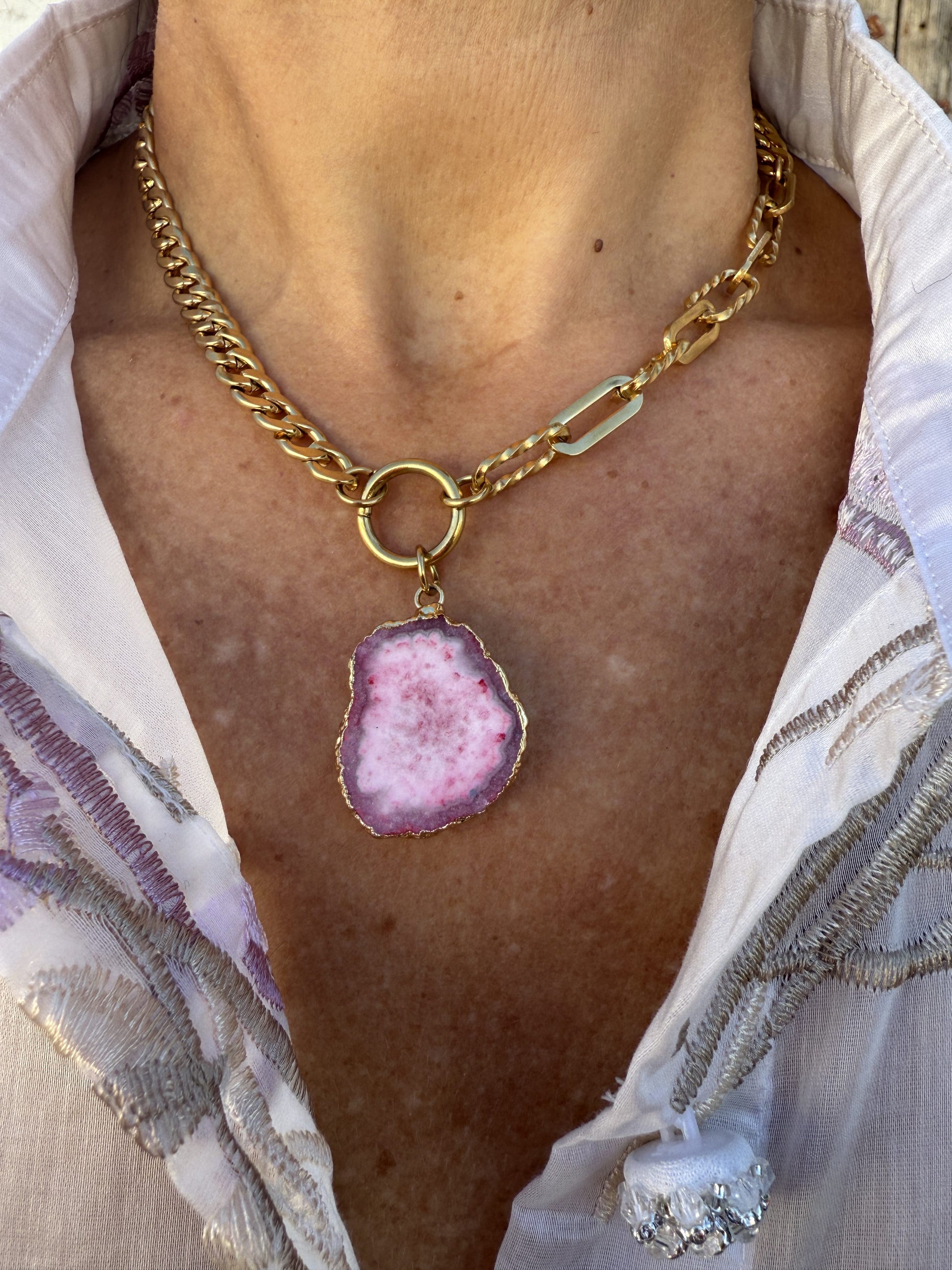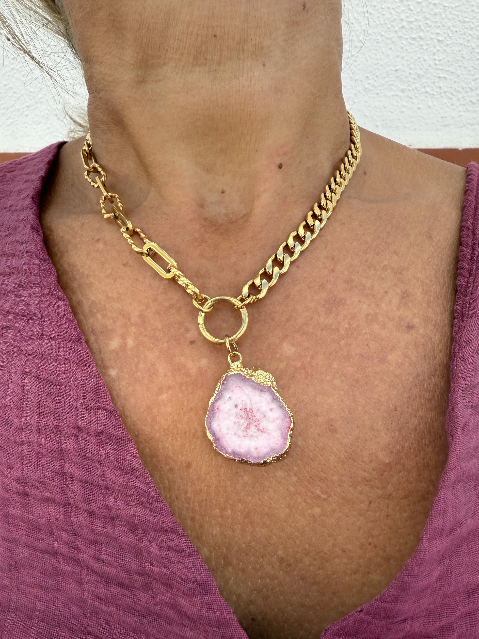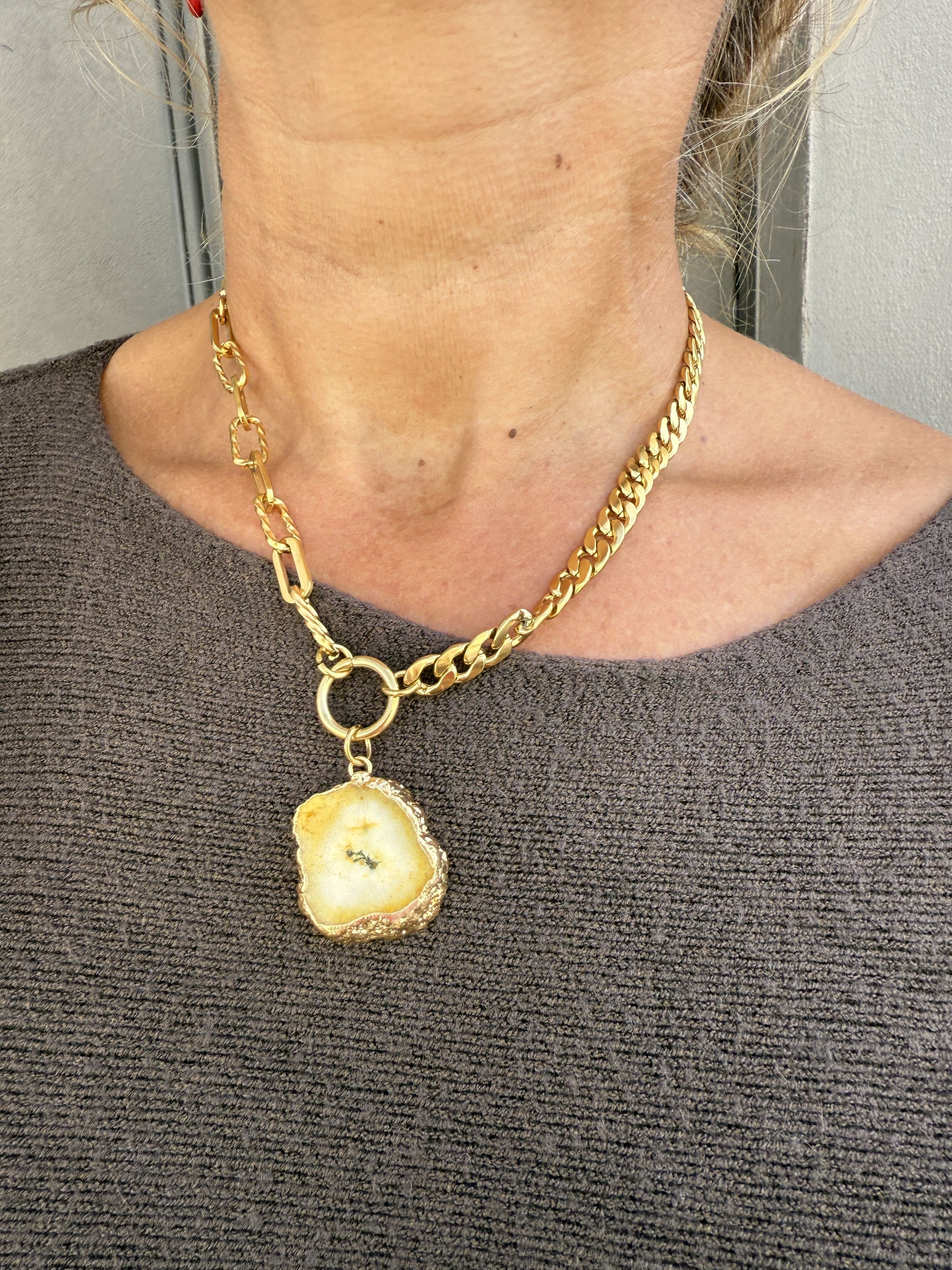 Cadena de acero en color dorado con abalorio en forma de piedra.