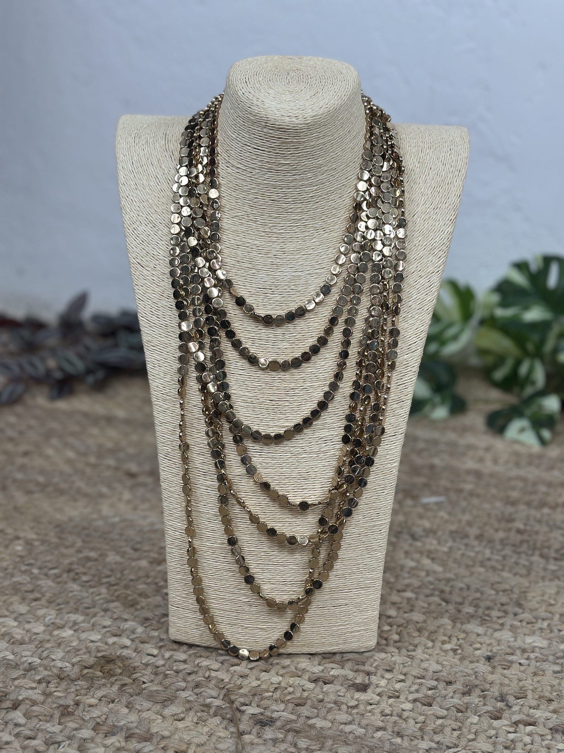 Collar de varias tiras de cuentas alargadas en color dorado con cierre de metal.