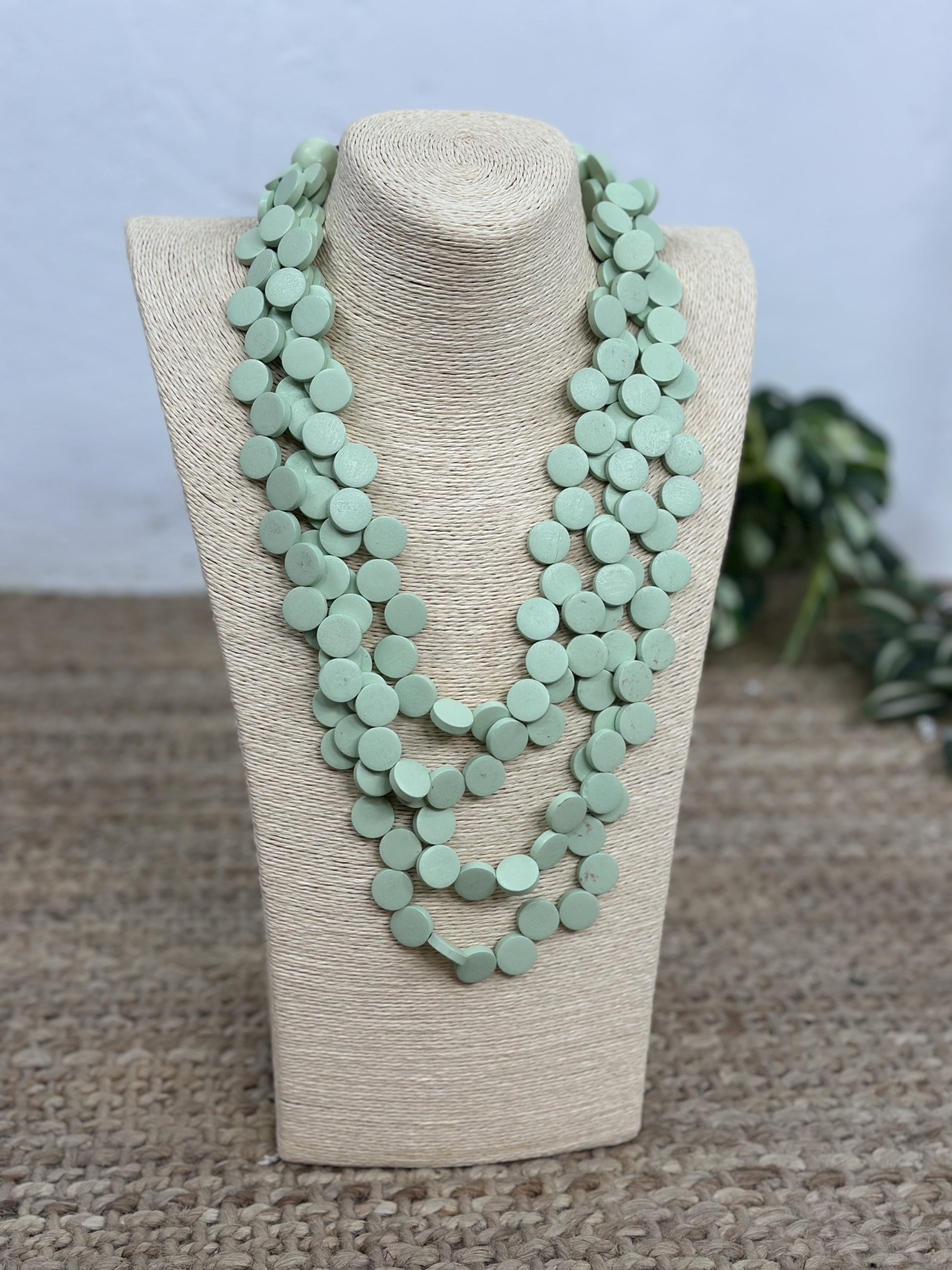 Collar largo con 4 tiras de abalorios de madera en forma de círculo.