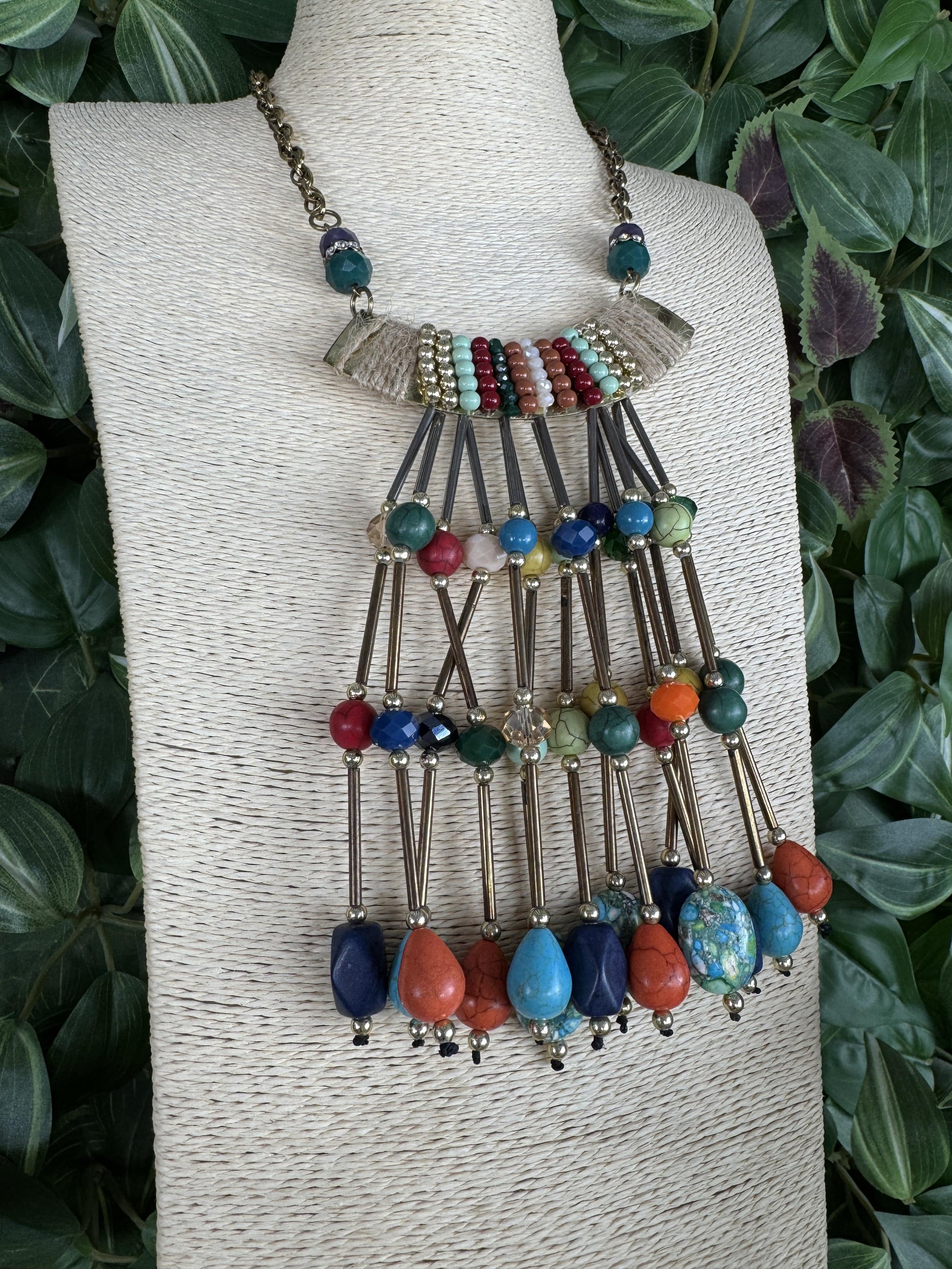 Tiene colgado como una especie de flecos rígidos compuestos por tres bolas y 3 perlas pequeñas.