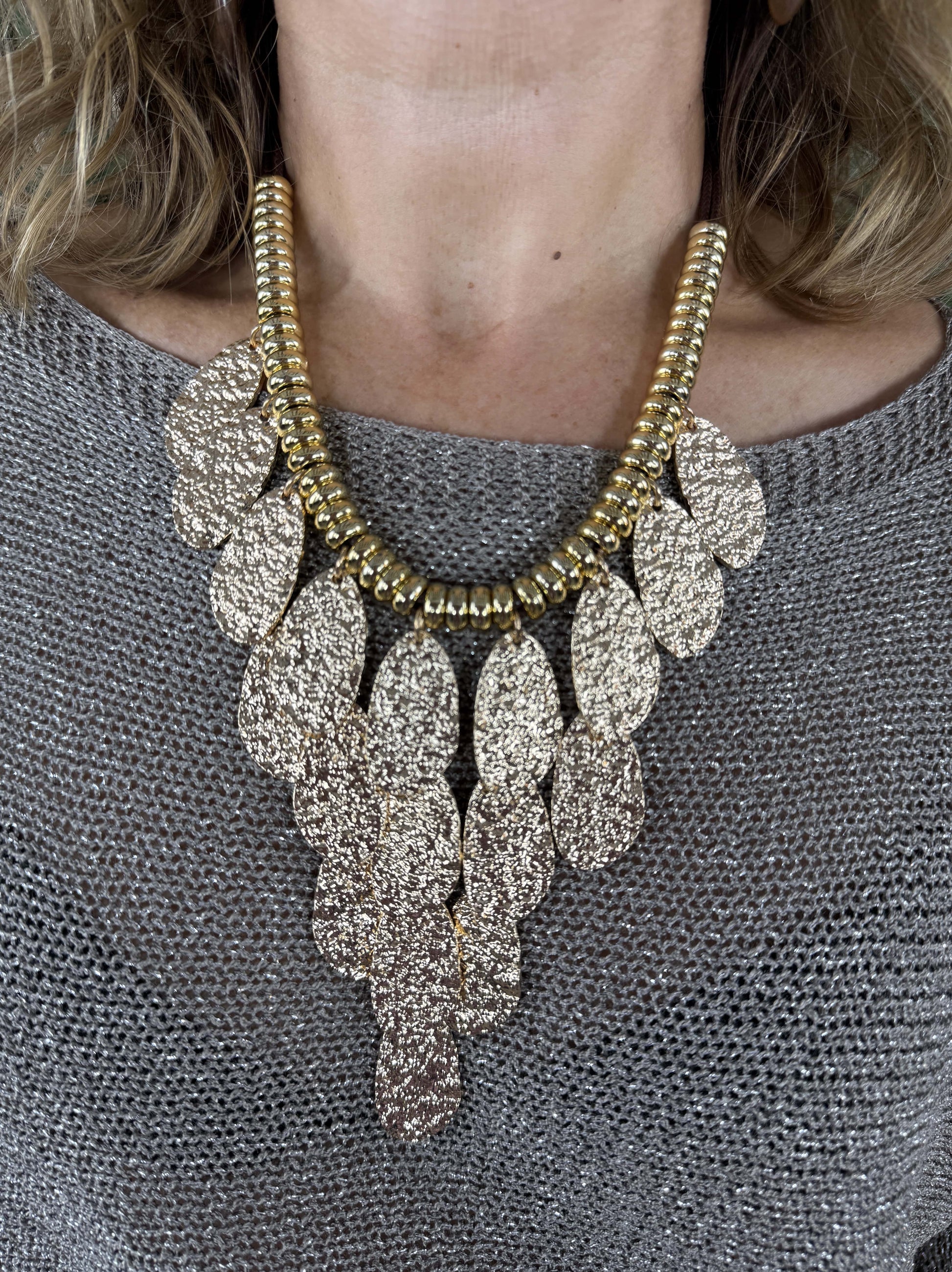 Collar con cola de ratón, bolas doradas y pétalos alargados con textura.