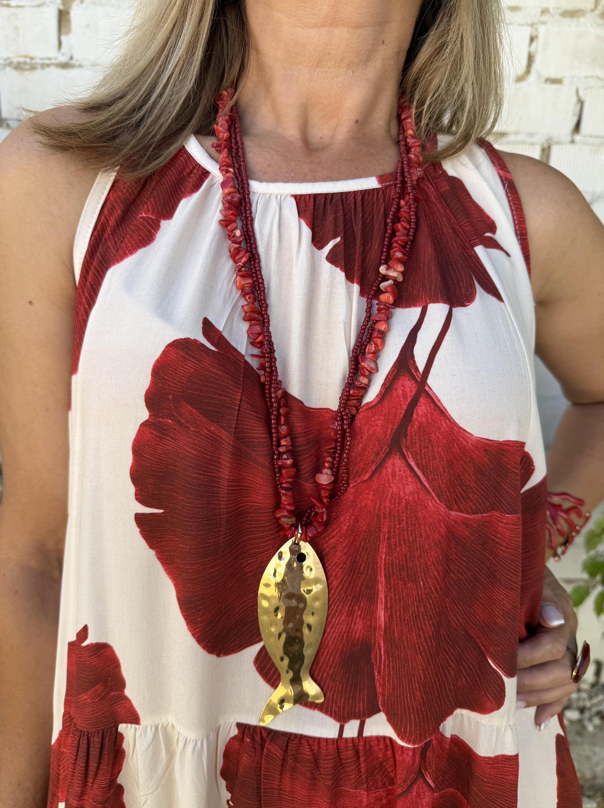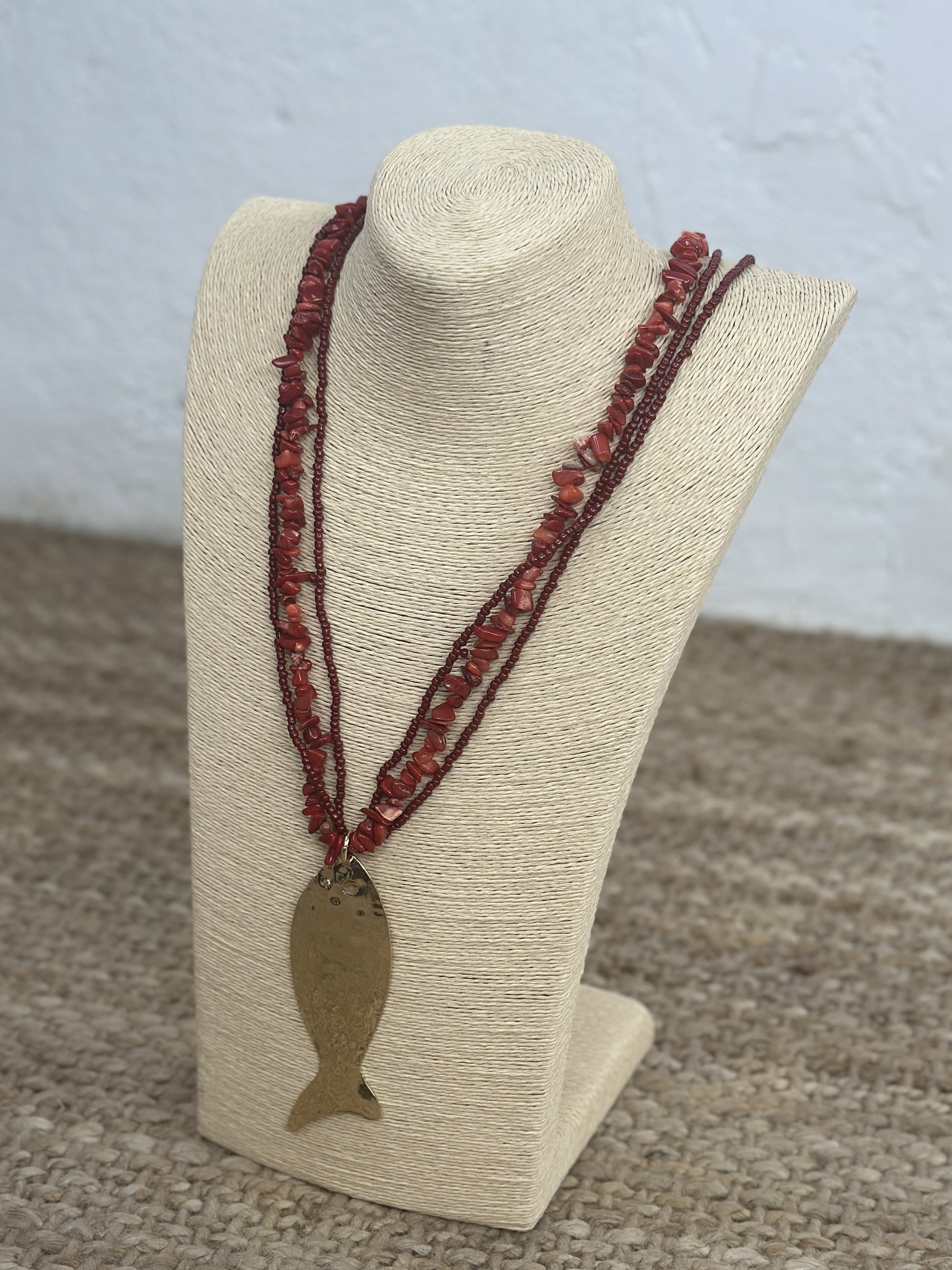 En la parte baja del collar tiene un abalorio grande de pez dorado con acabado brillo.