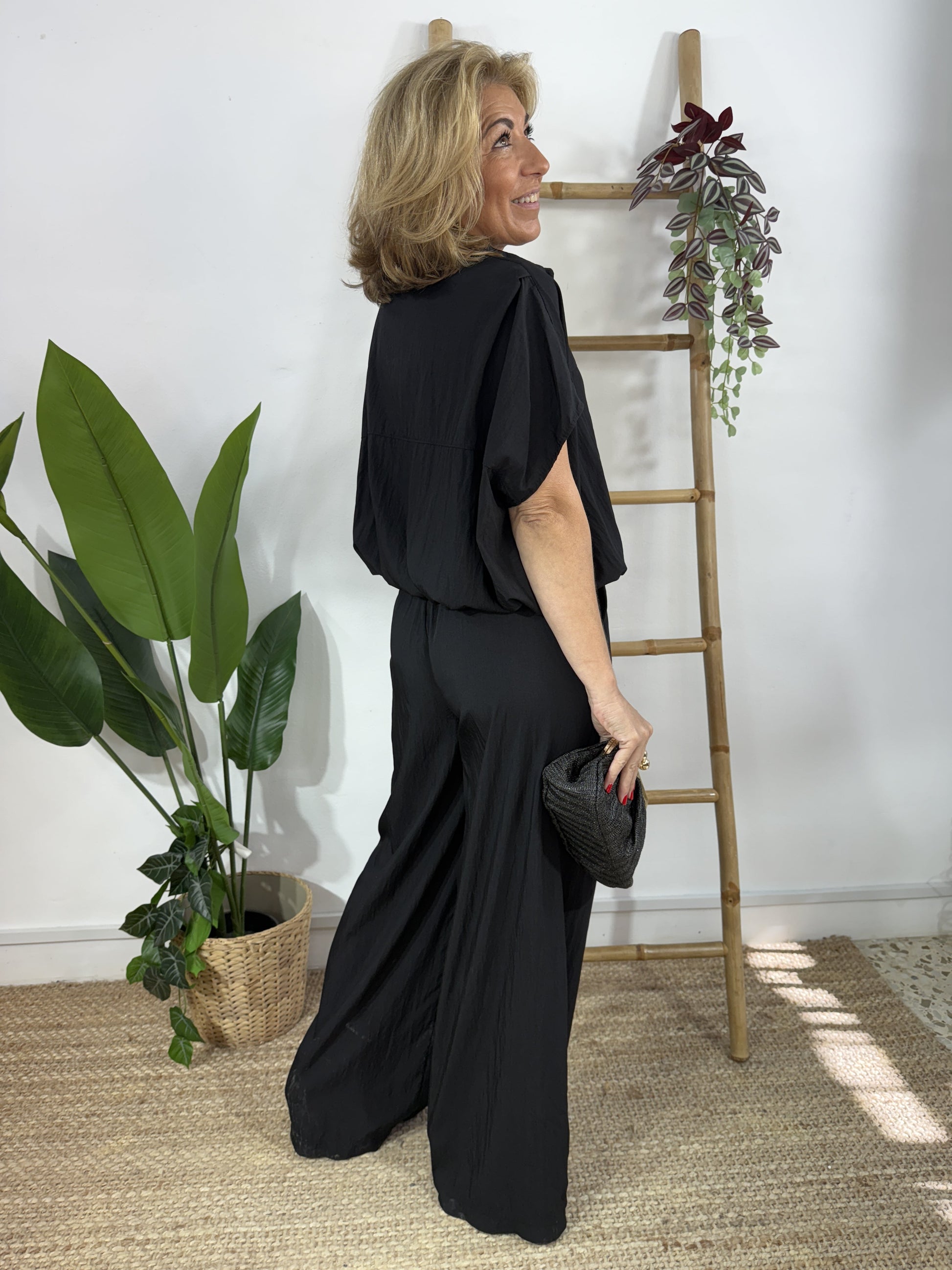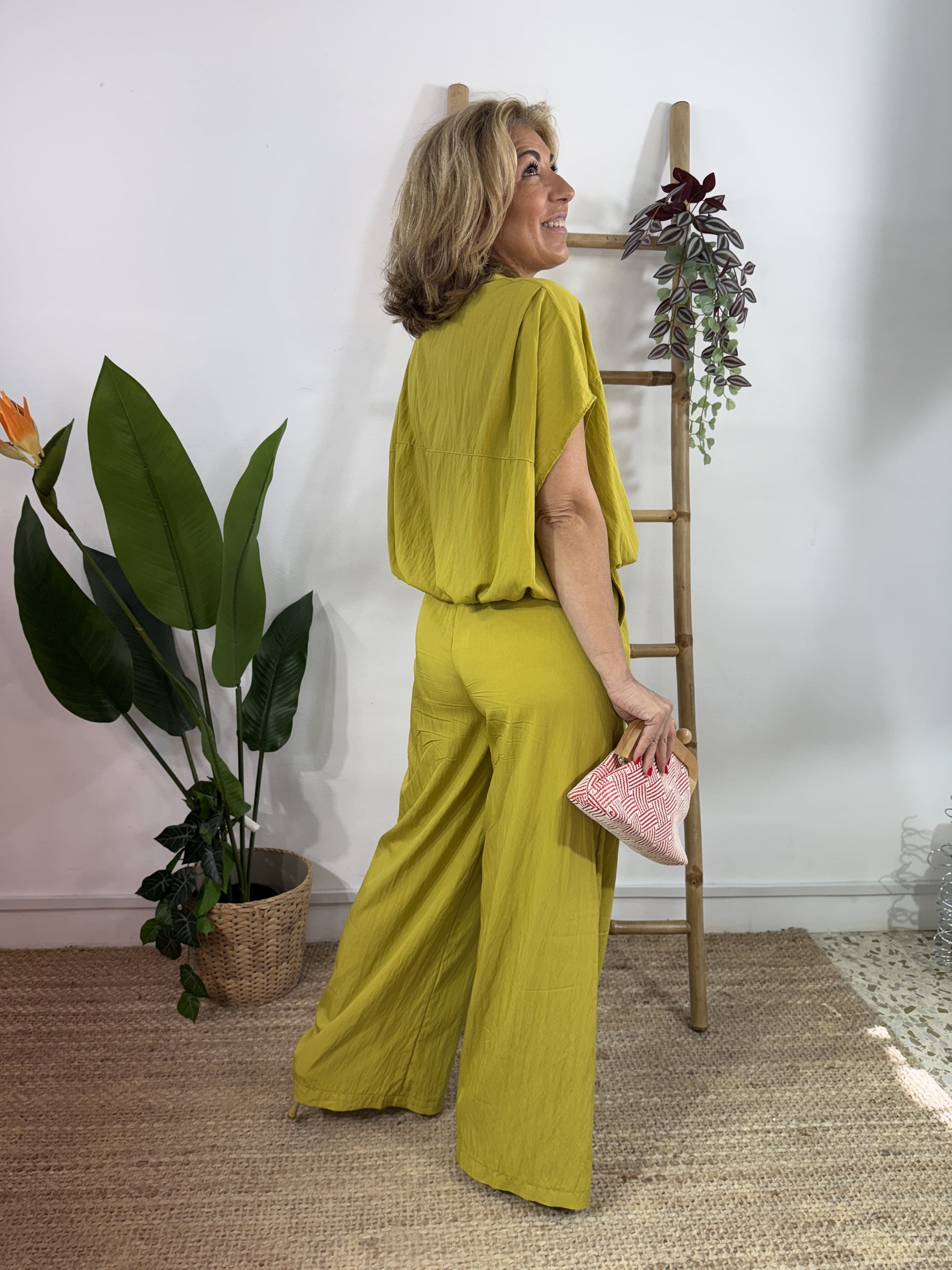 Pantalón largo de pata de elefante con bolsillos a ambos lados y cinturilla elástica.