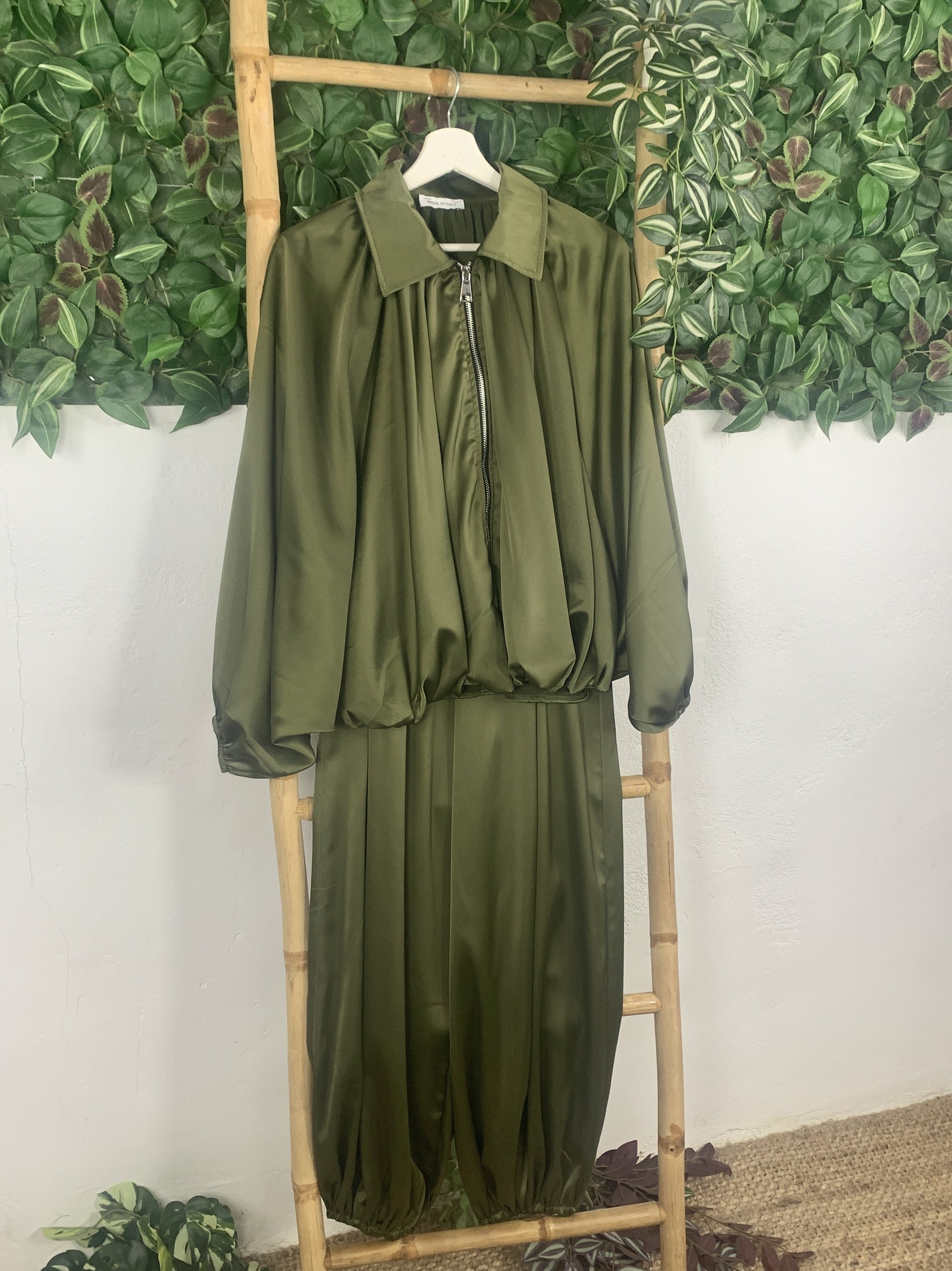 La chaqueta tiene mangas tipo bombacho con cremallera, bolsillos a ambos lados y manga fruncida con elástico.
